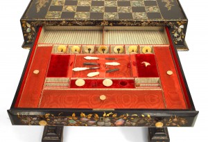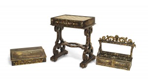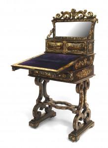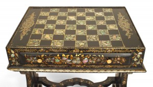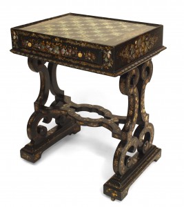 English Victorian (circa 1860) black lacquered & decorated pearl inlaid papier mache ladies' bureau/work table with filigree pediment and hidden gaming board. (3 sections)
