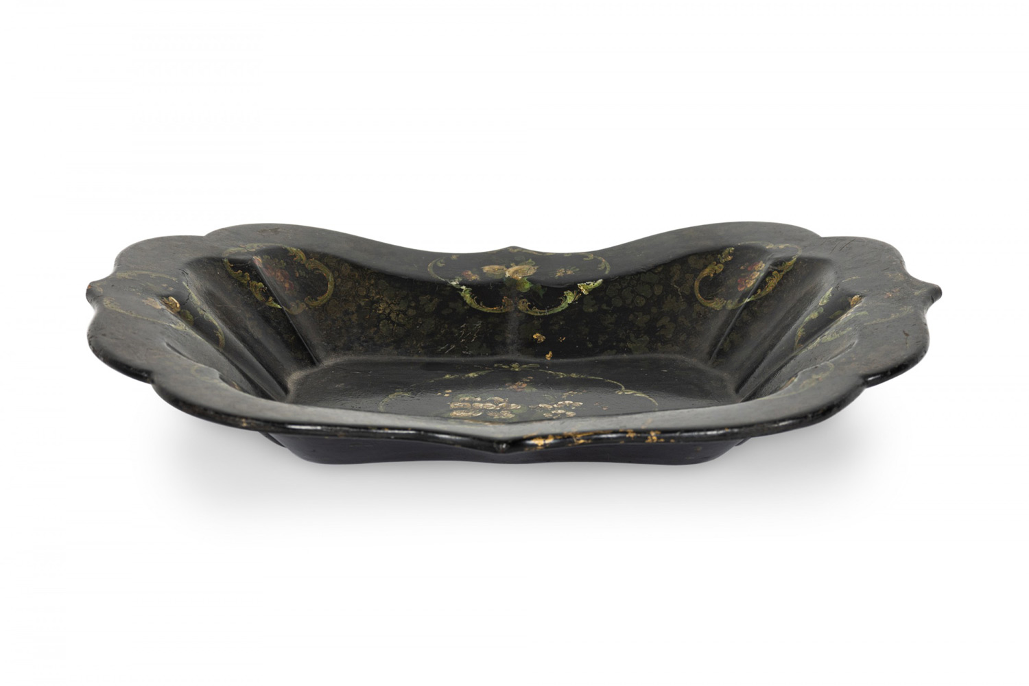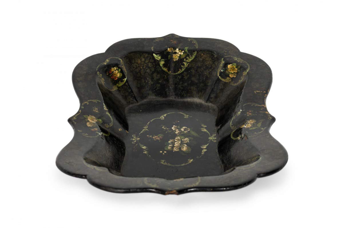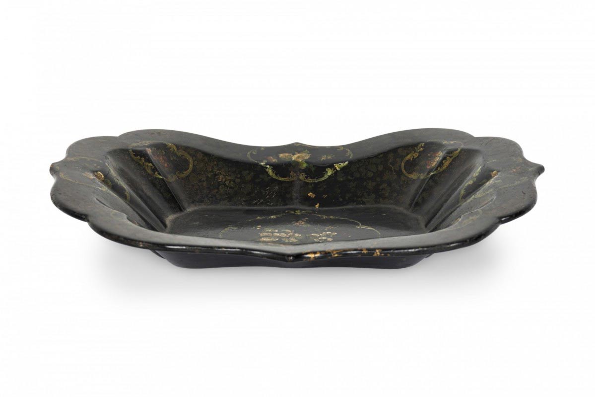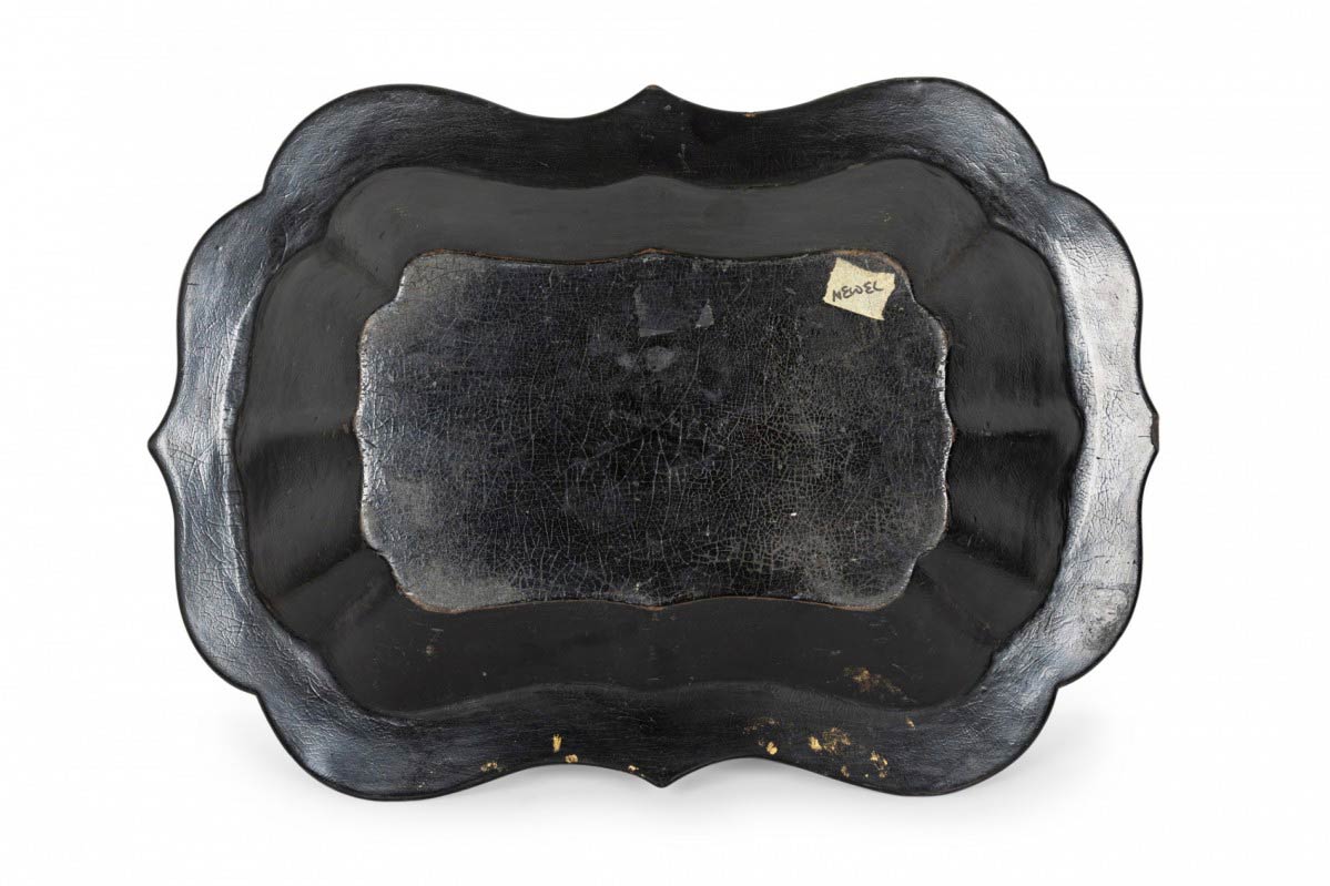 English Victorian papier mache decorated rectangular tray with scalloped edge.