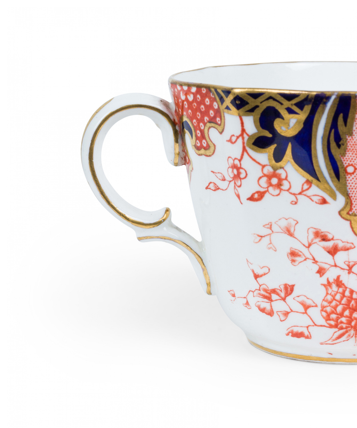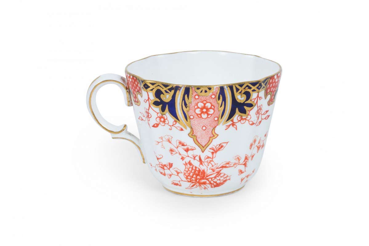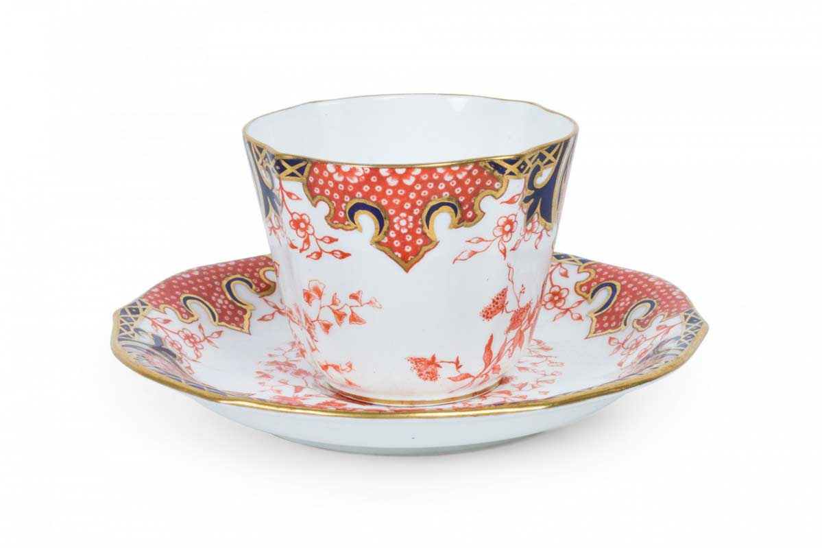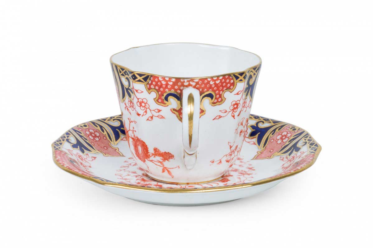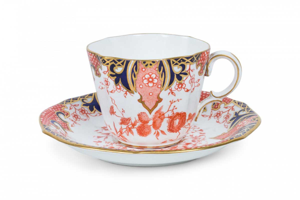 English Victorian blue, orange, and white porcelain tea cup and saucer (Royal Crown Derby)