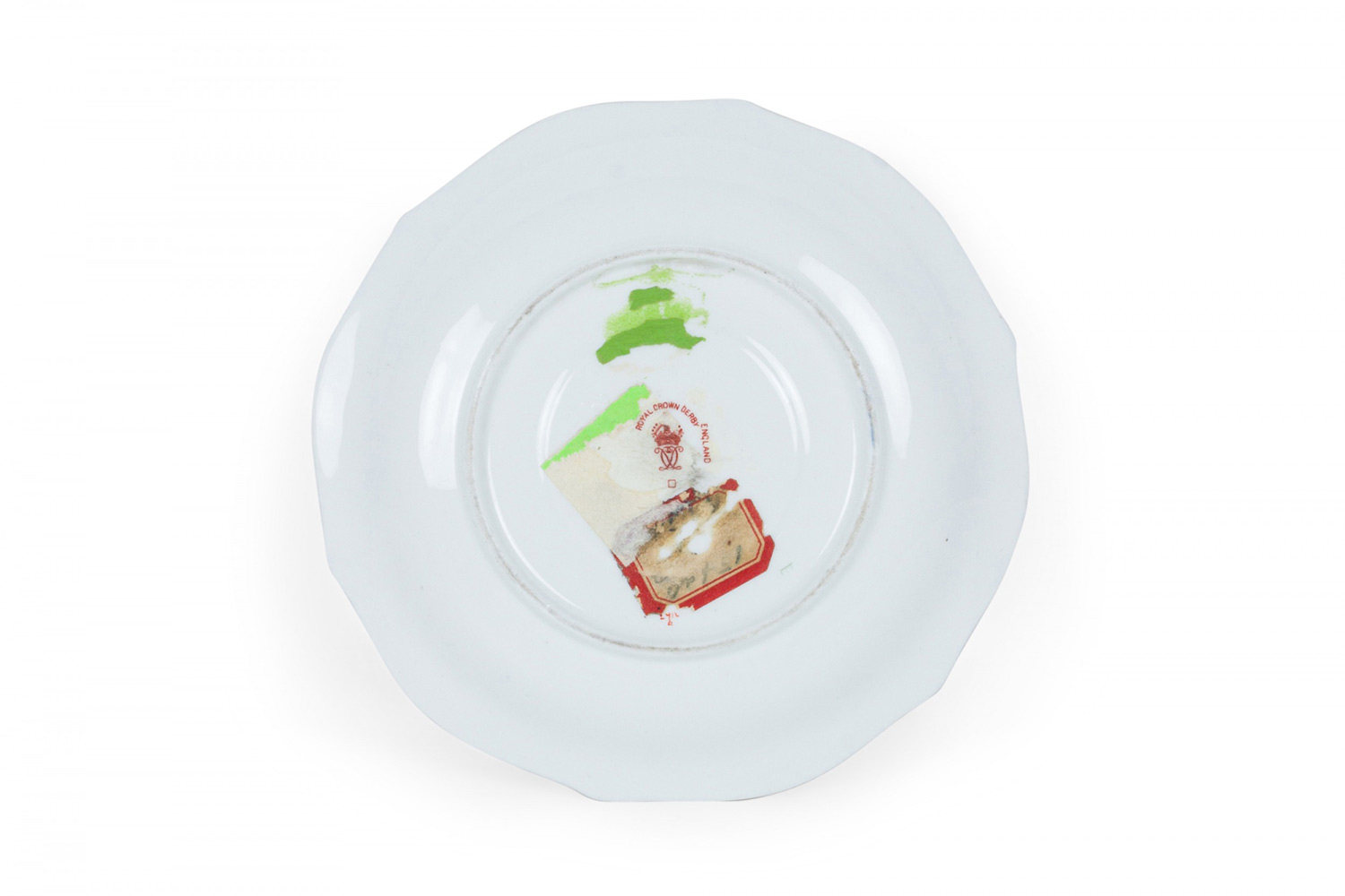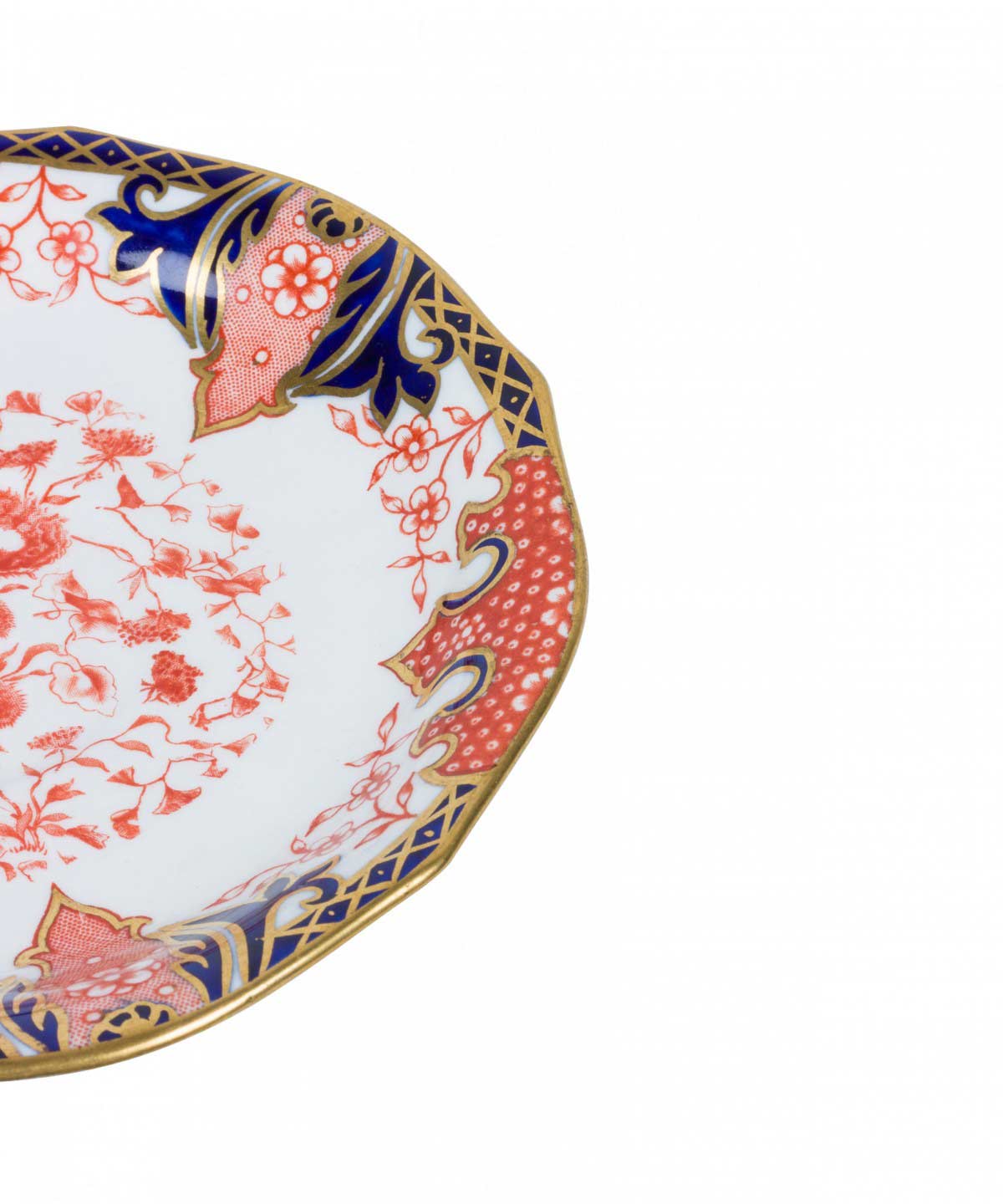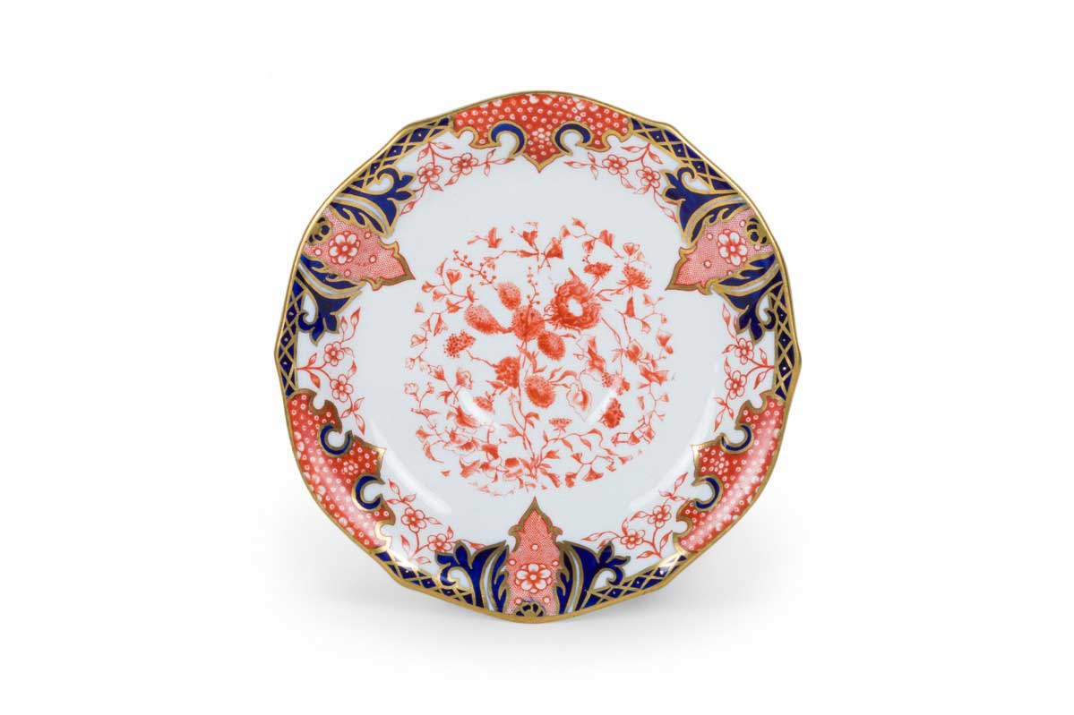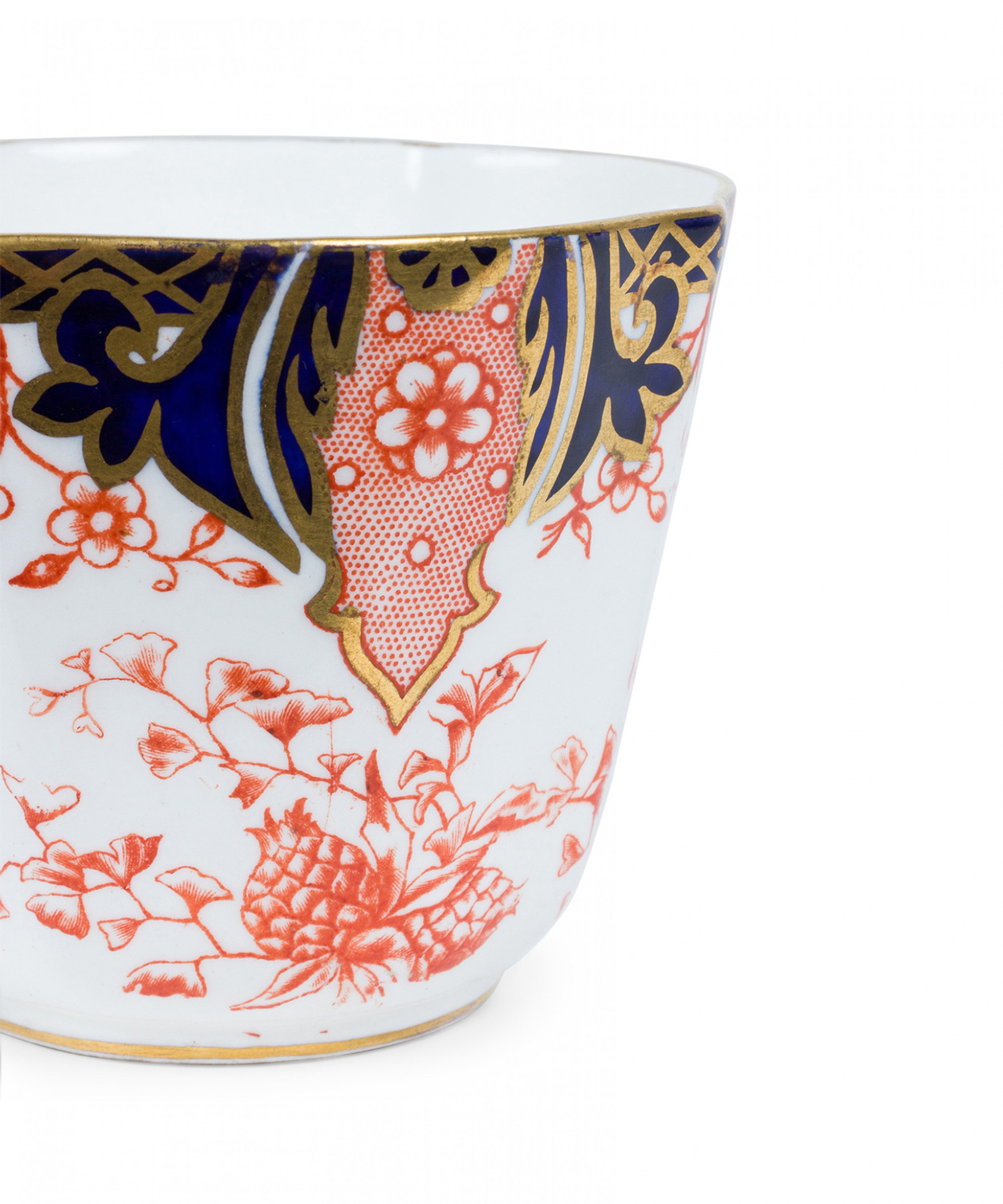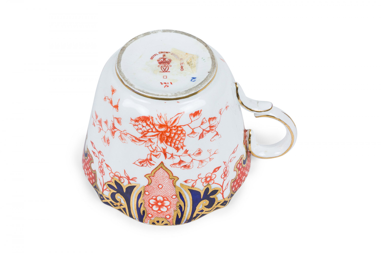English Victorian blue, orange, and white porcelain tea cup and saucer (Royal Crown Derby)