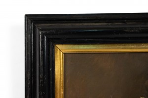 English Victorian style ebonized and gilt framed oil painting of puppies playing on red table.
