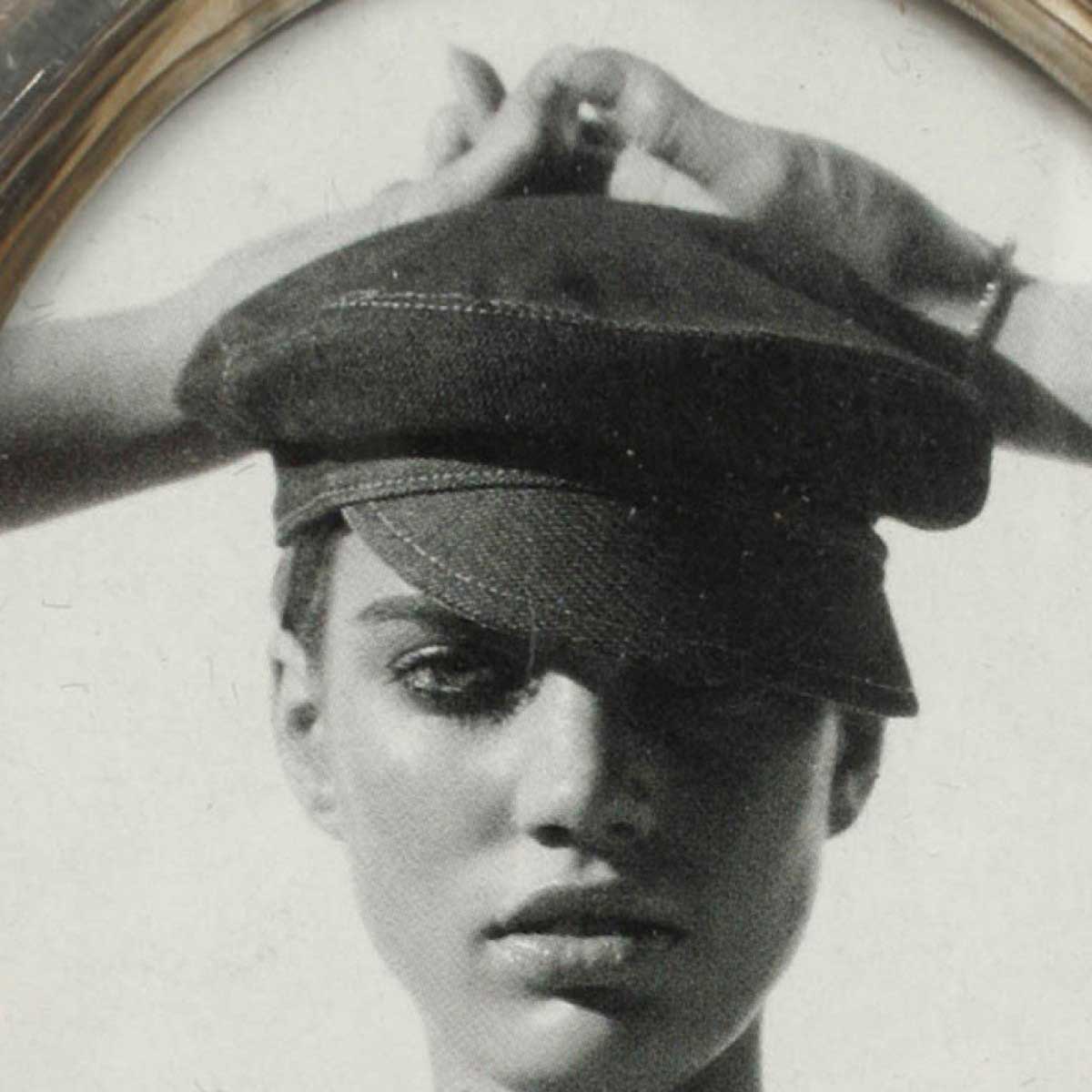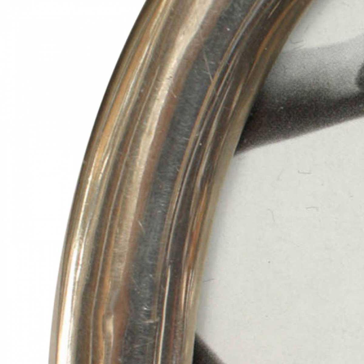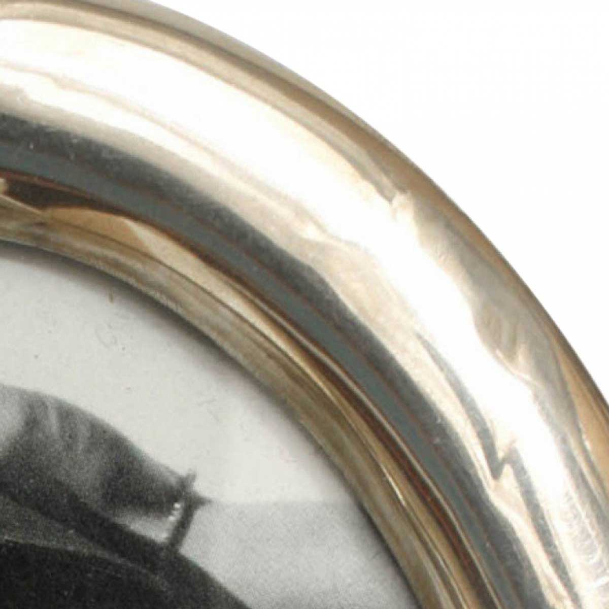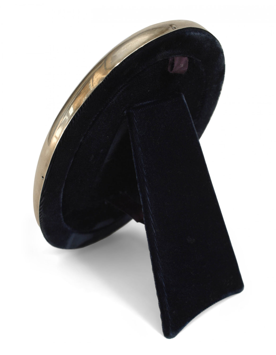 English Victorian-style sterling silver oval shaped easel picture frame with dark blue velvet backing.