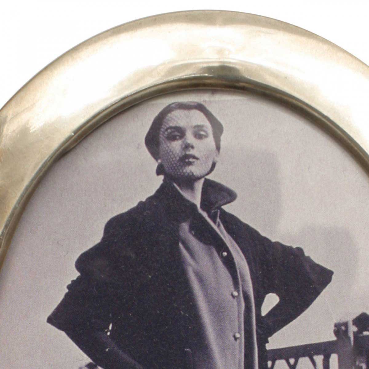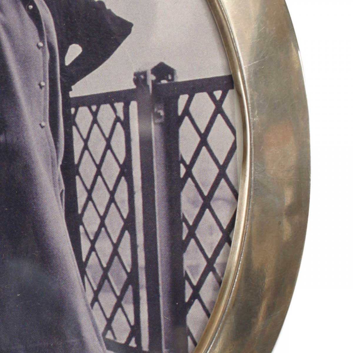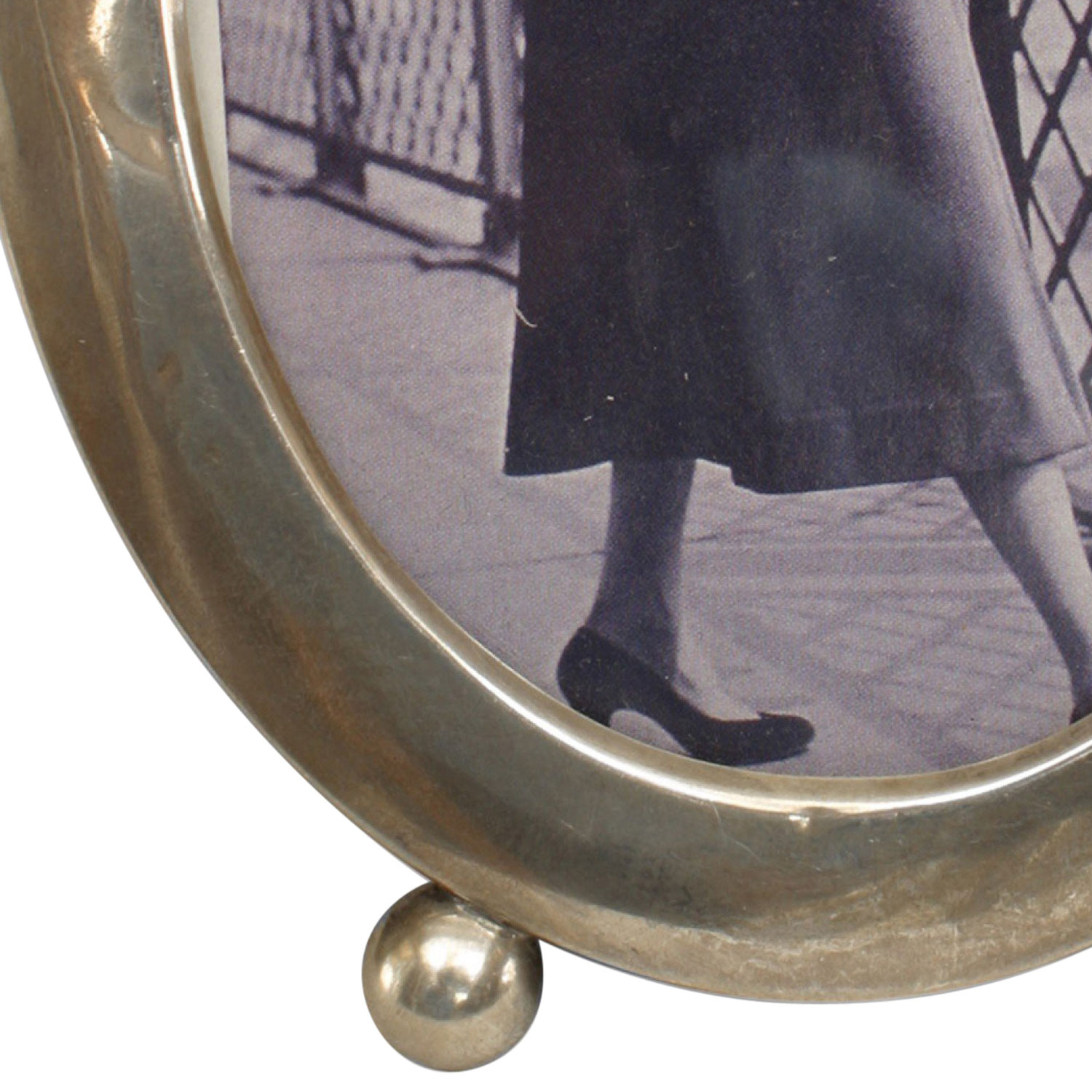 English Victorian oval shaped sterling silver easel picture frame resting on 2 ball feet with plum velvet backing.