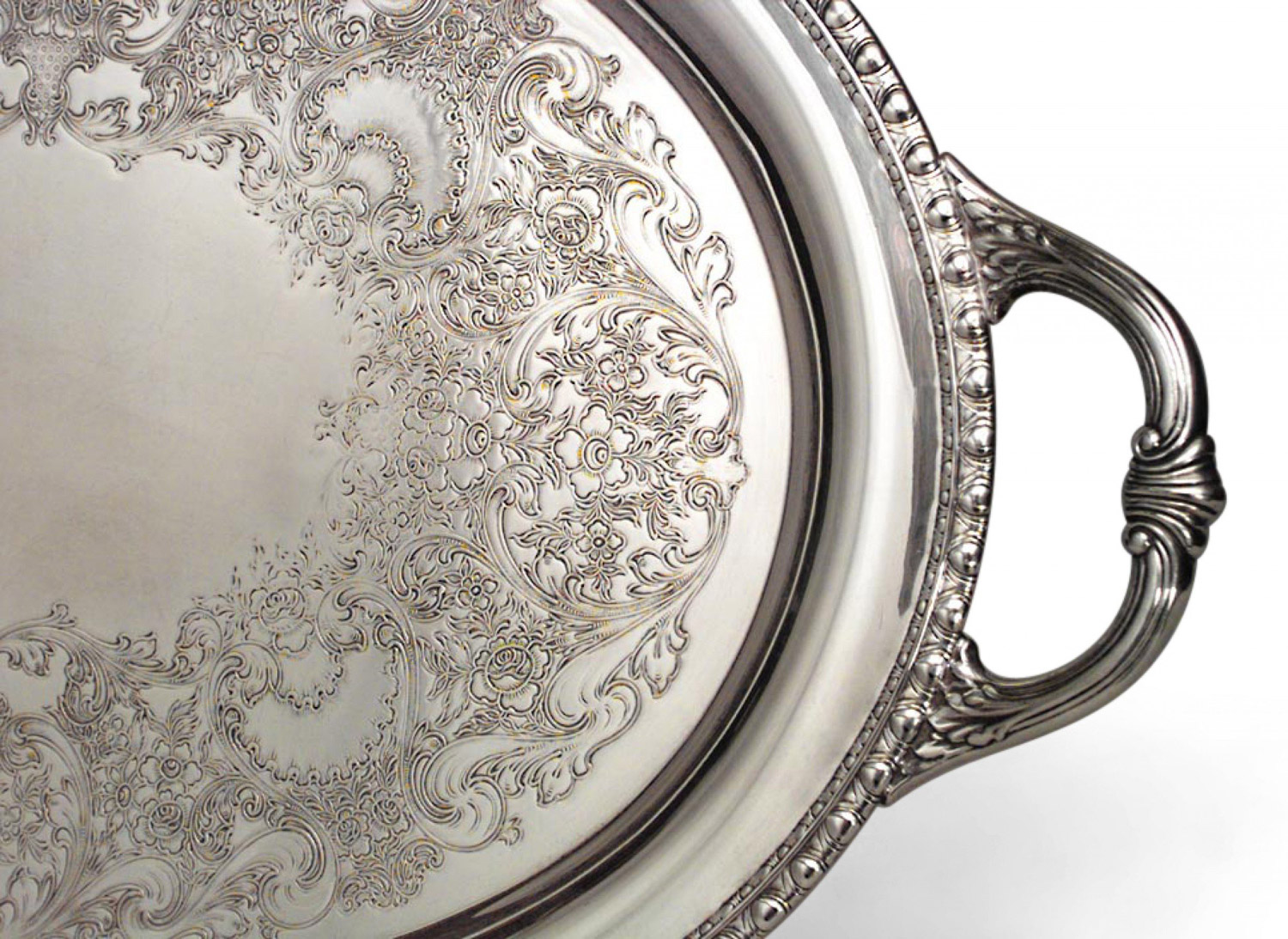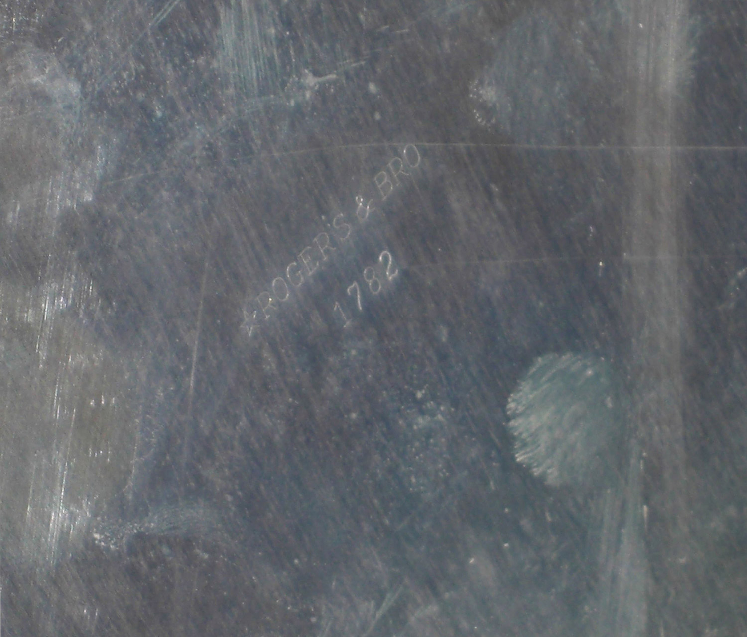 English Victorian oval silver plate ogee edge tray with etched scroll design and fluted handles (signed ROGER'S & BRO 1782)