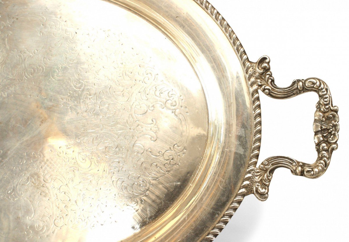 English Victorian oval silver plate tray with fluted edge and etched surface with handles.