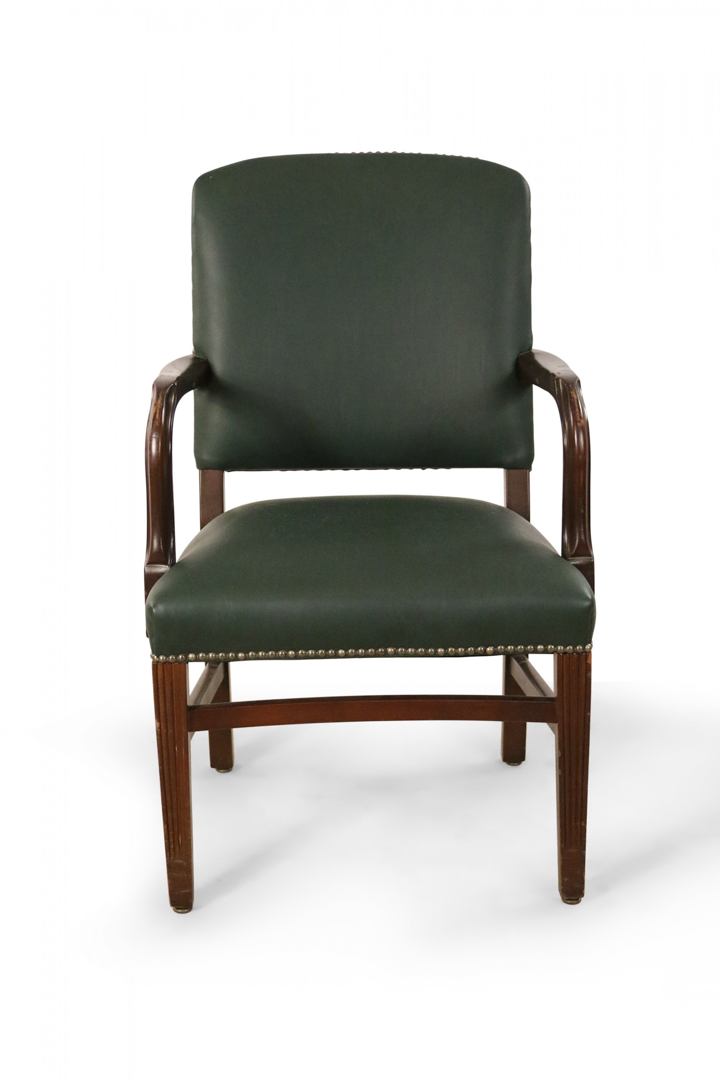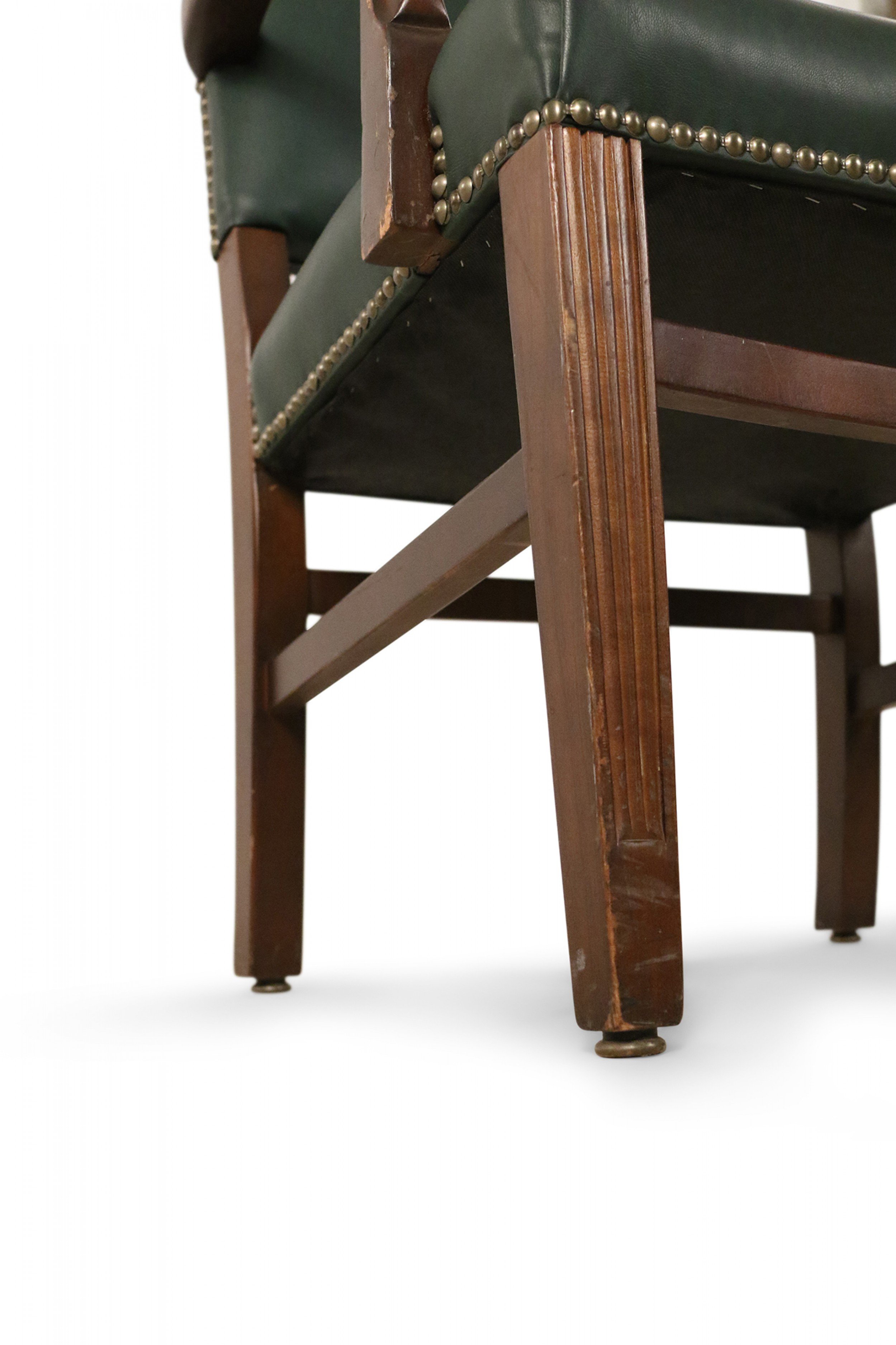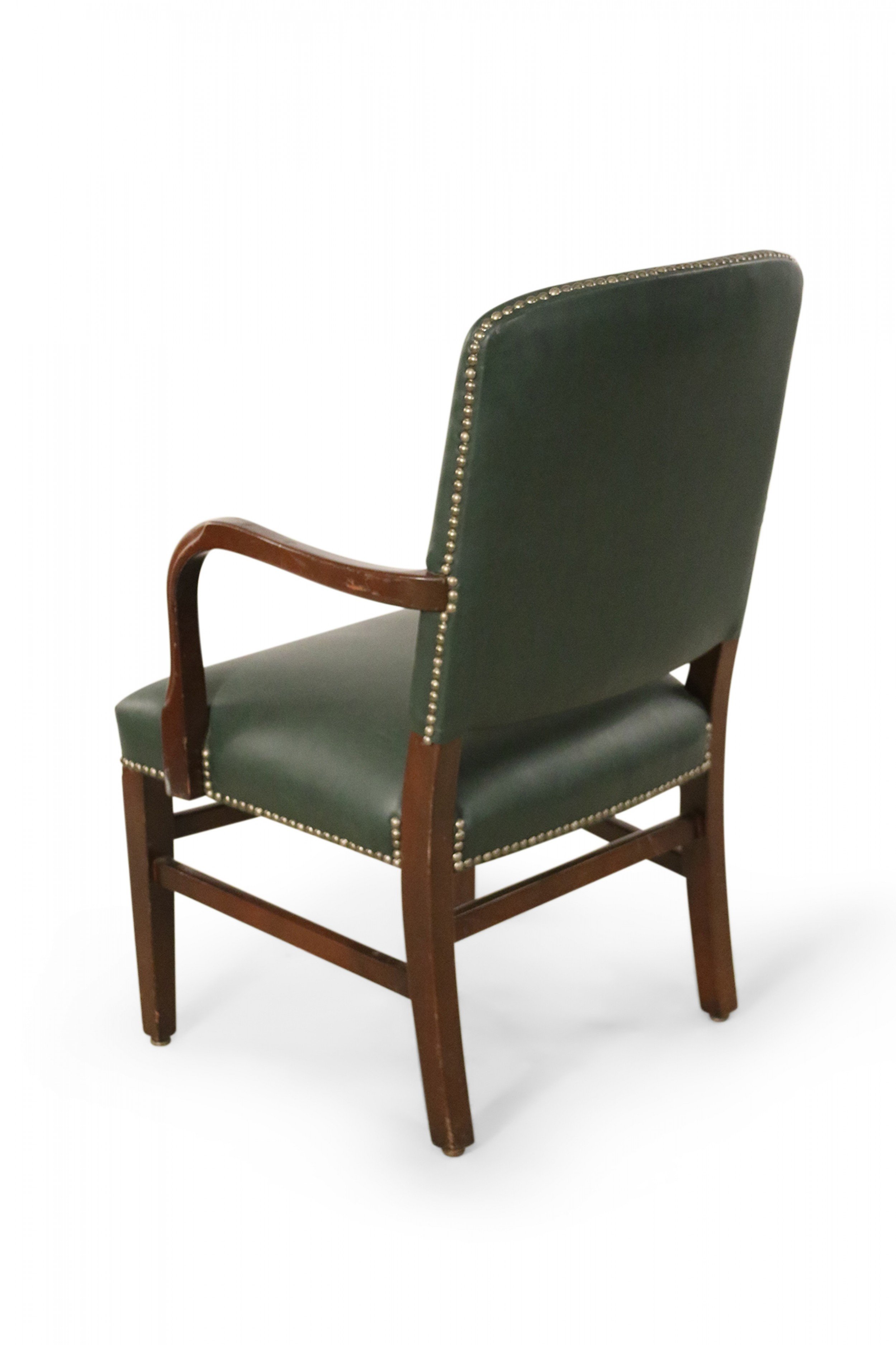 3 English Victorian-style (20th Century) dark green leather armchairs with mahogany wood frames, curved arms, and brass upholstery nail trim. (PRICED EACH)