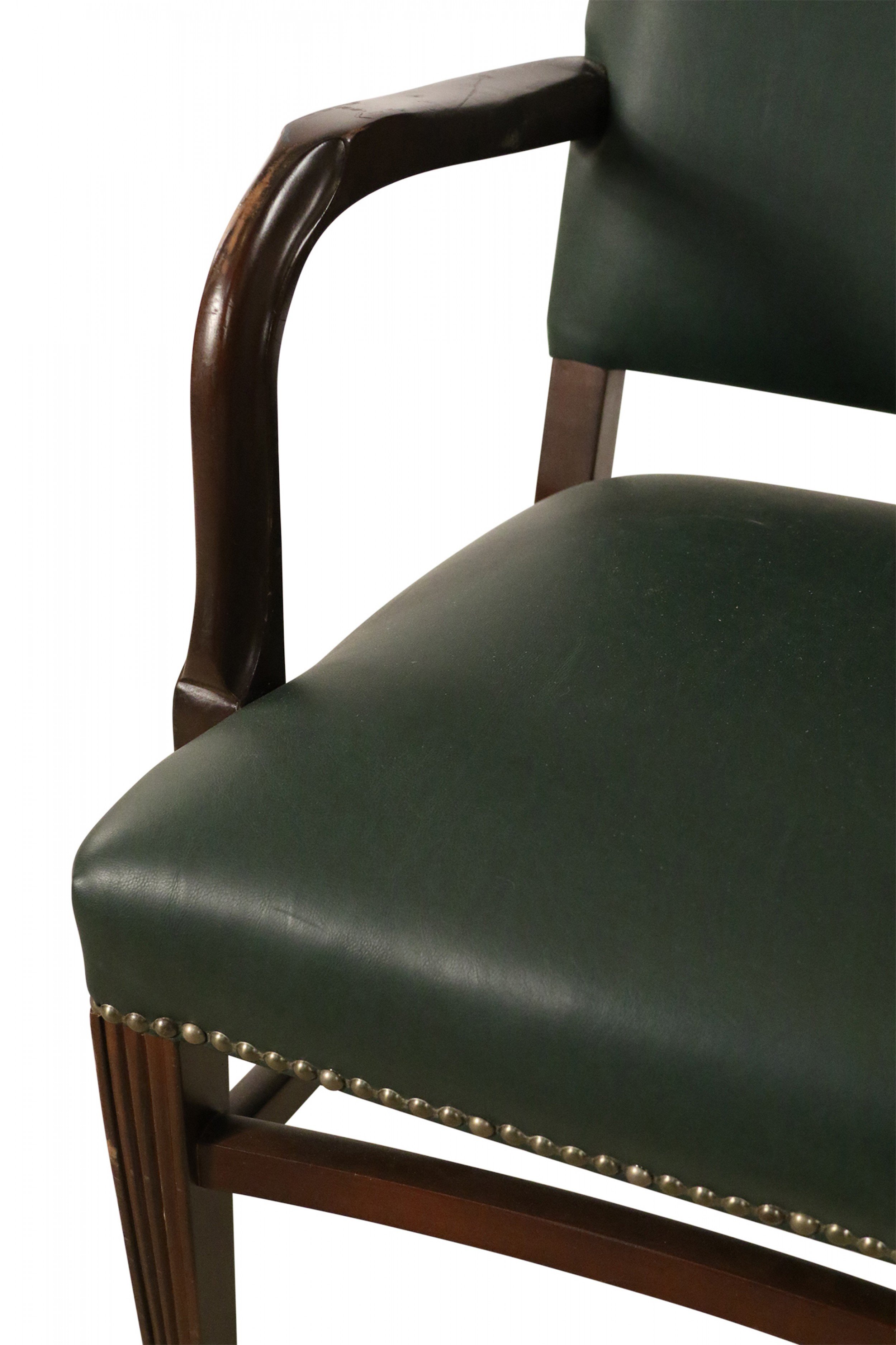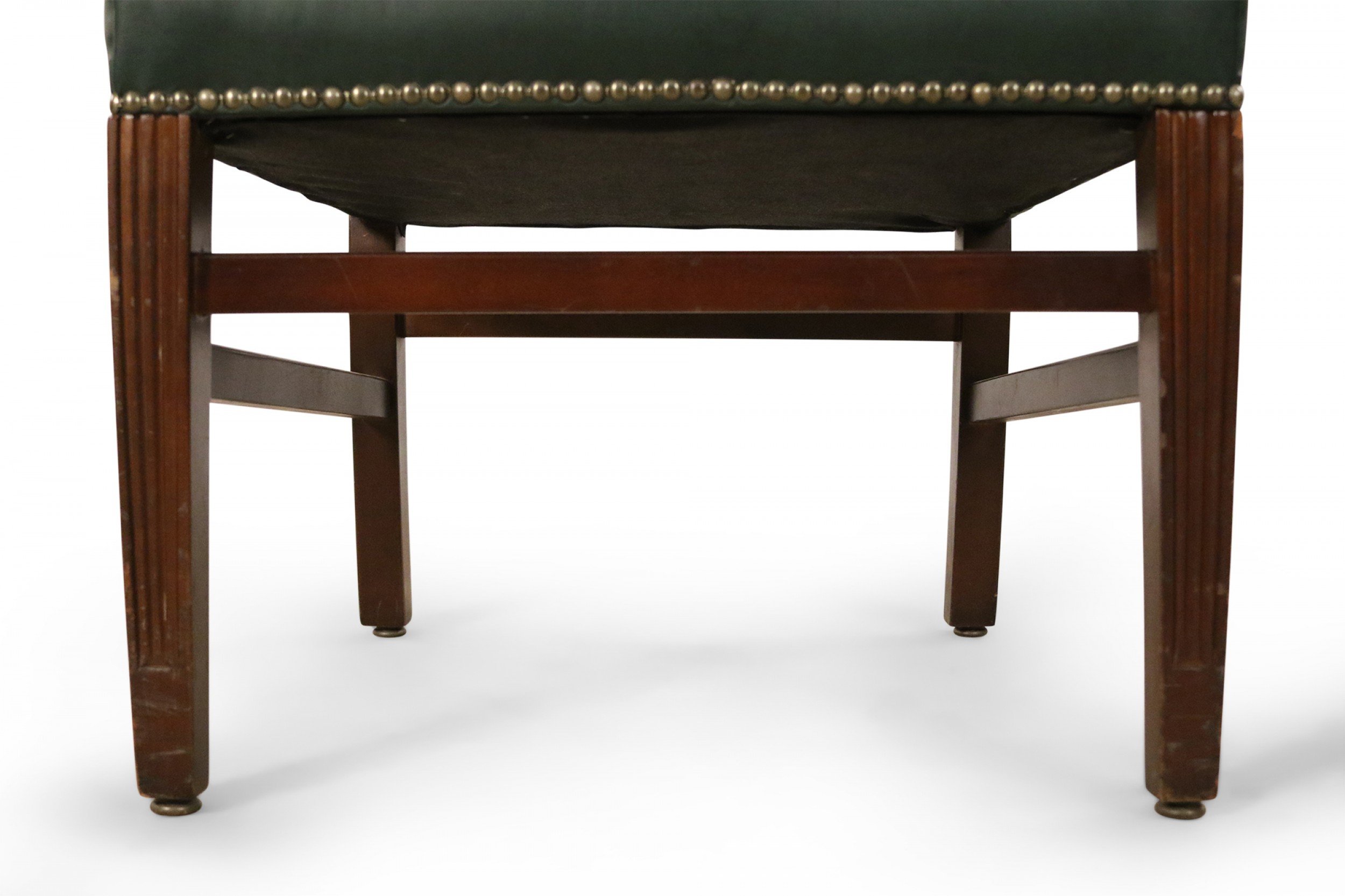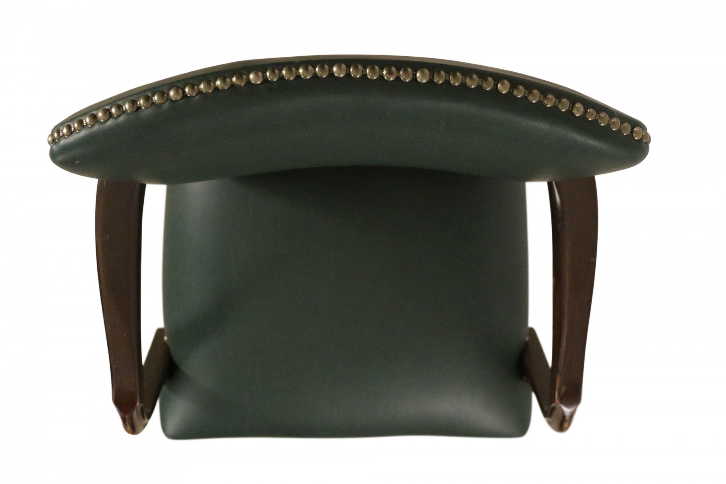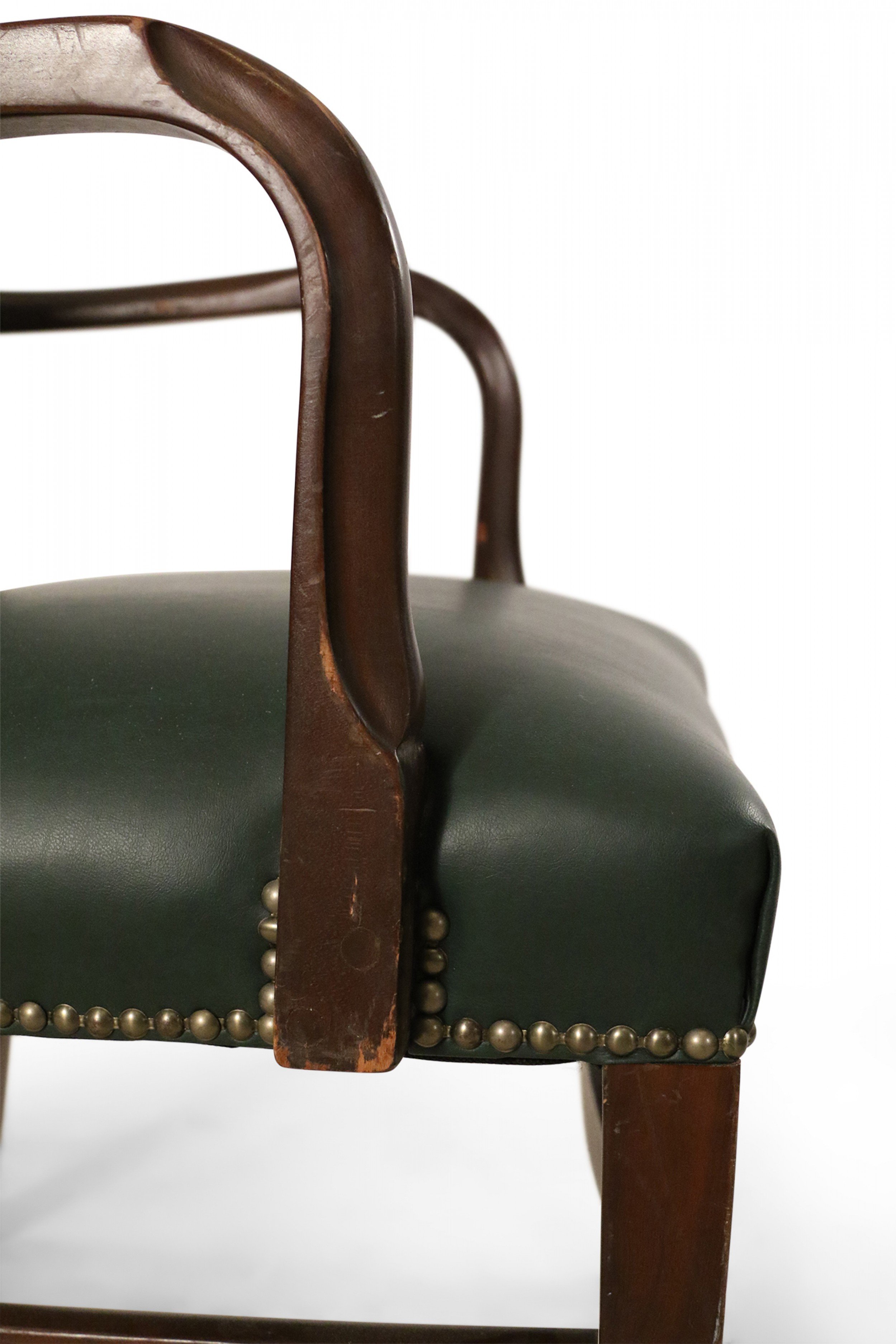 3 English Victorian-style (20th Century) dark green leather armchairs with mahogany wood frames, curved arms, and brass upholstery nail trim. (PRICED EACH)