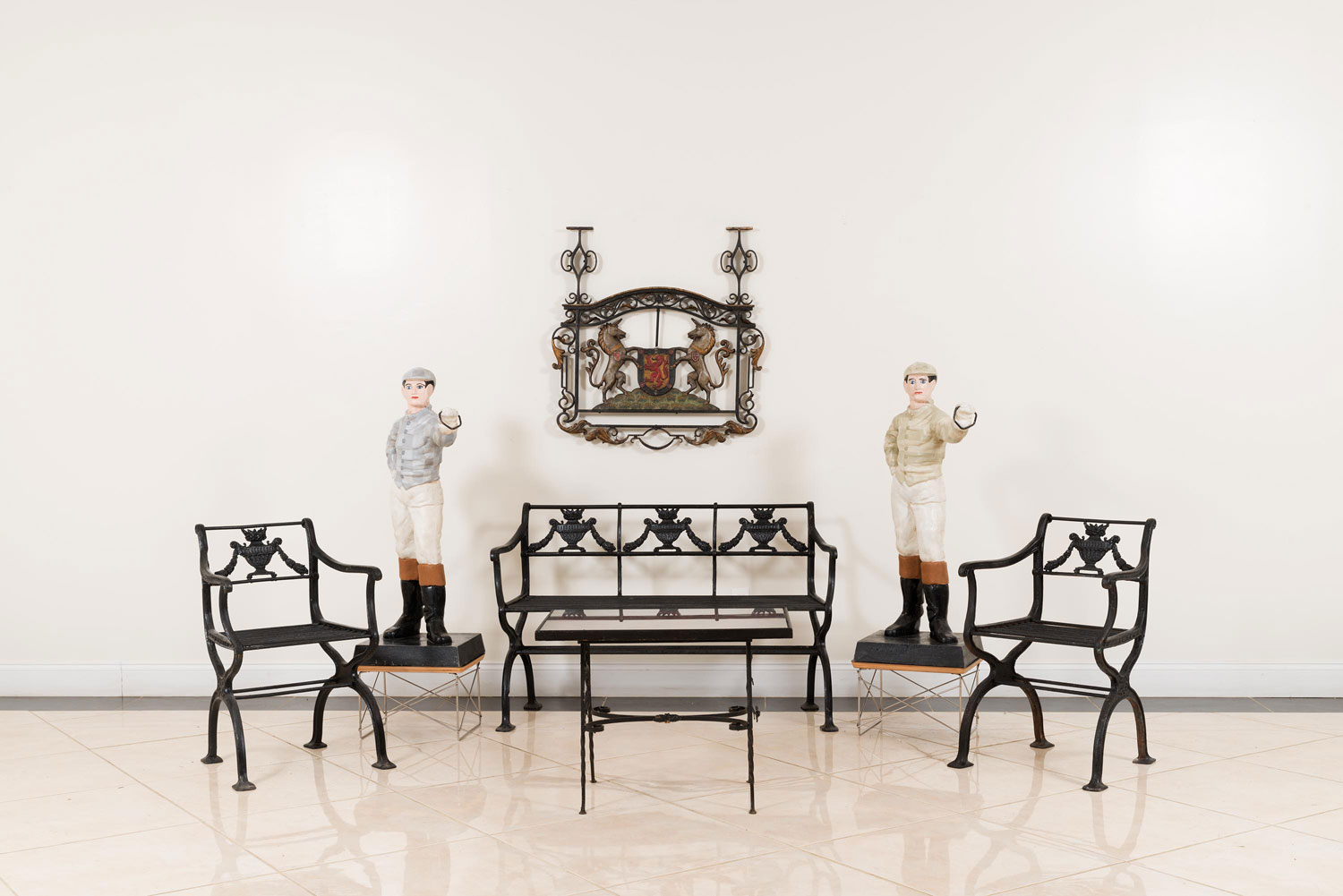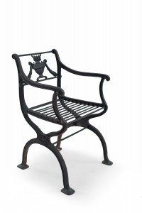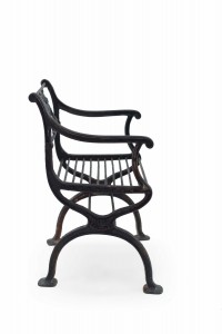 4 piece English Victorian painted iron salon set with a Neo-classic swag and urn design back and slat seats (Bench, 1 large arm chair, 1 arm chair, 1 side chair.) (Available individually: CER047A-D)