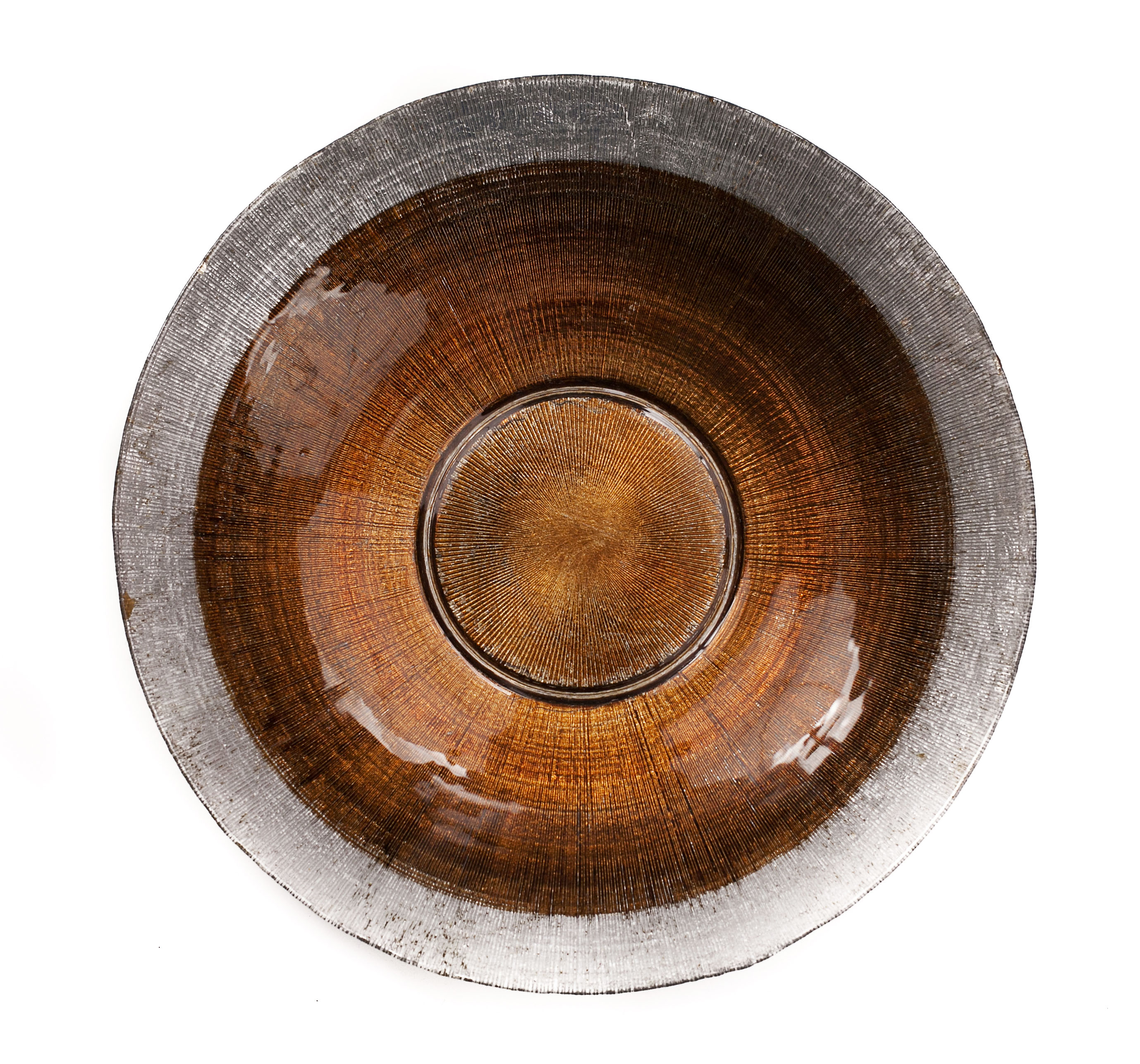 Extra large decorative shallow glass bowl with a ribbed design and a gold and silver painted finish