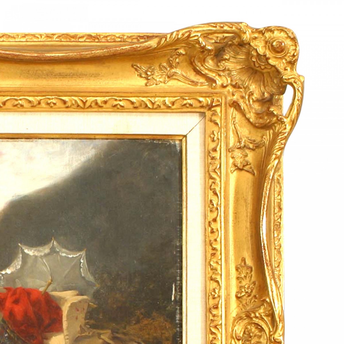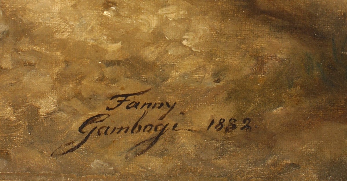 French Victorian (19th Cent) oil painting of two women with a donkey resting at a lookout titled: " A rest on the Journey" (signed Mme FANNY GAMBOGI 1882)