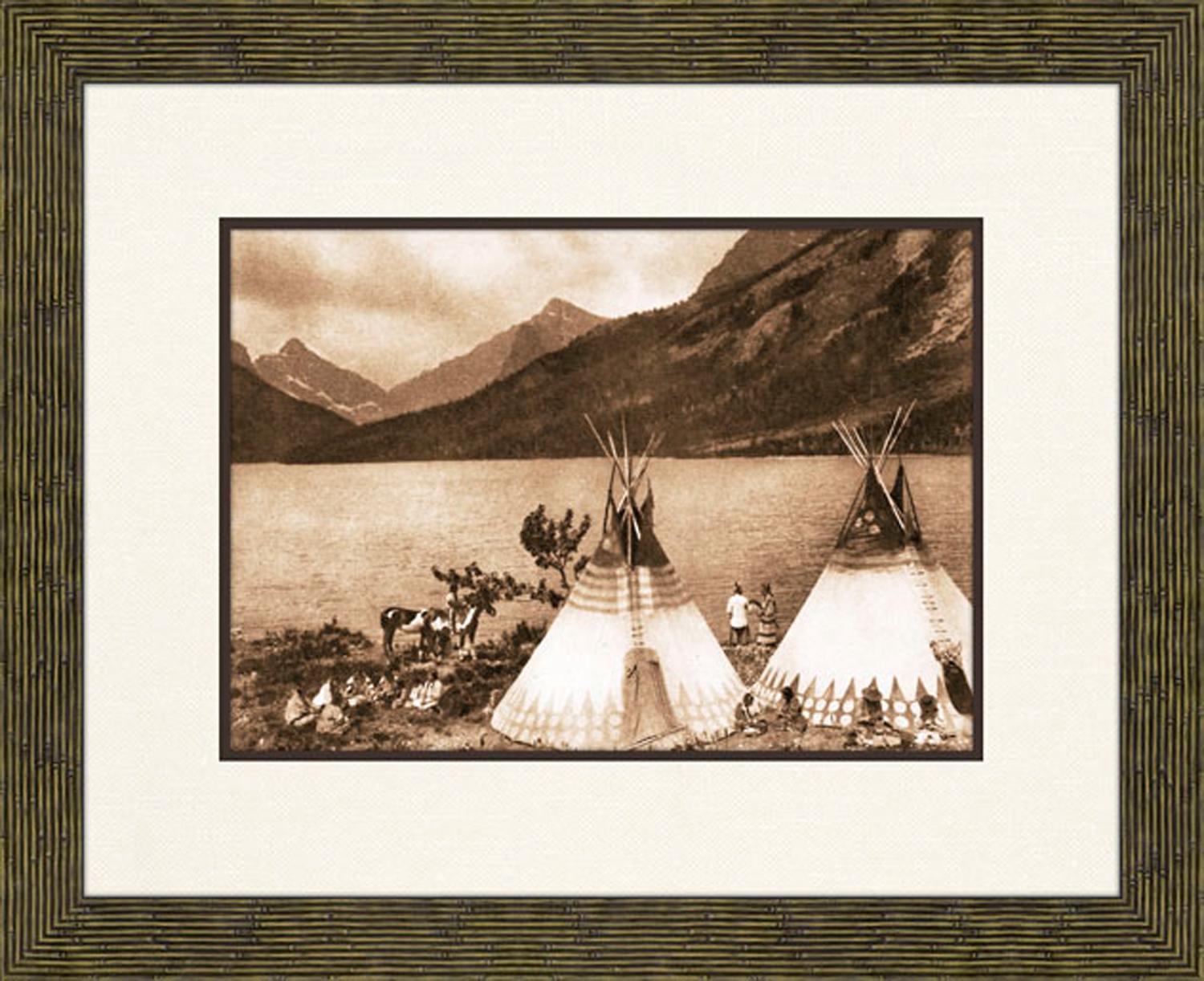 "Far From Landlords", sepia-toned photograph of Native Americans and teepee tents, Giclee art print matted and framed in a dark wood frame