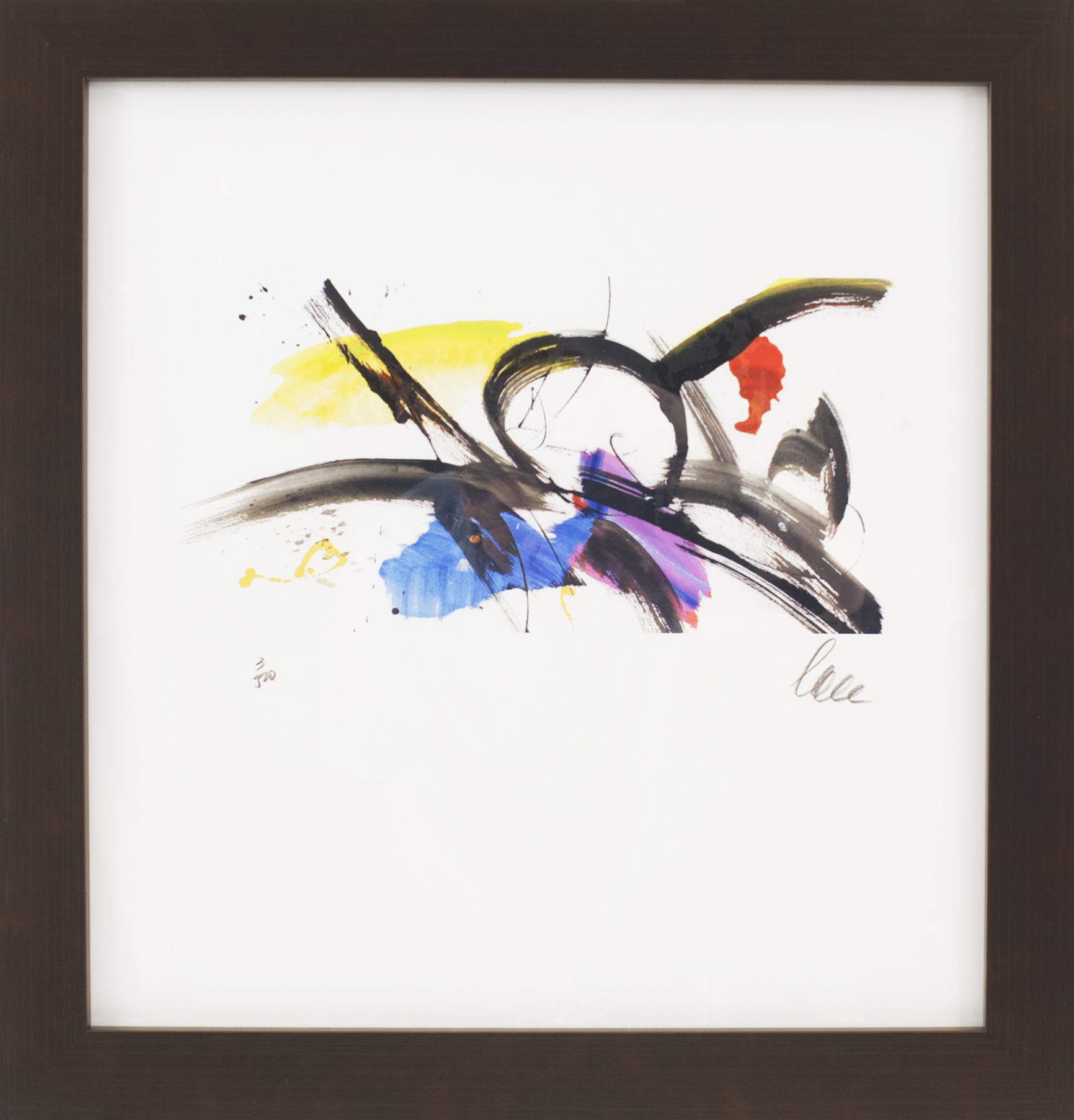 Contemporary abstract print of black, red, blue, and yellow shapes on a white background titled, "First Hand III," in a black frame (Companion pieces: 061709, 061711)