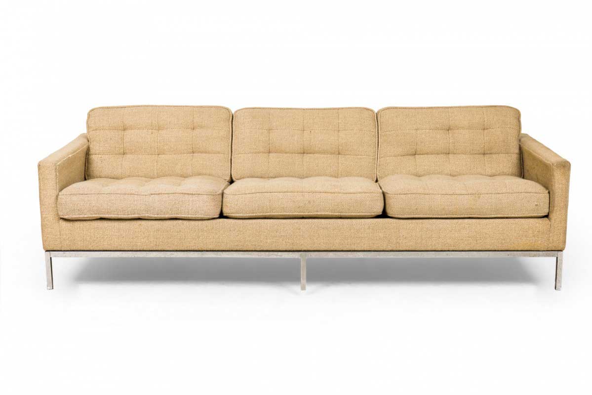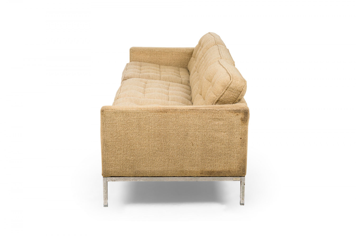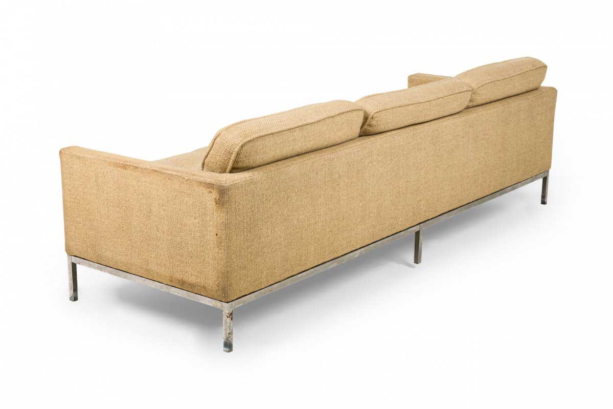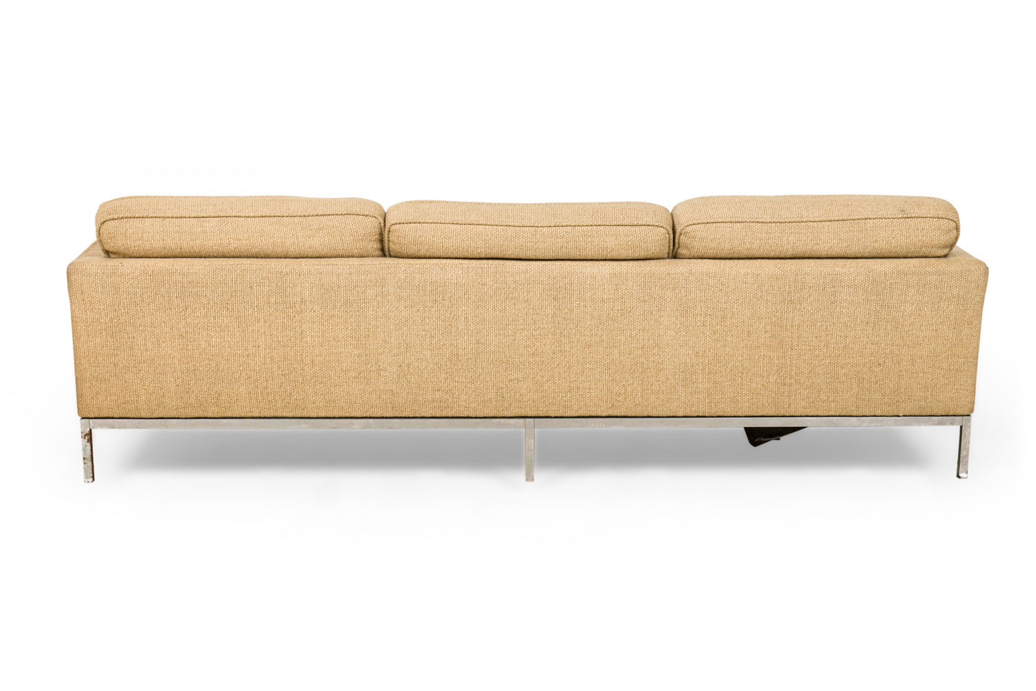 Mid-Century American three-seated sofa upholstered in a beige weave with low back, and three removable seat cushions, standing on a metal frame with 6 legs.