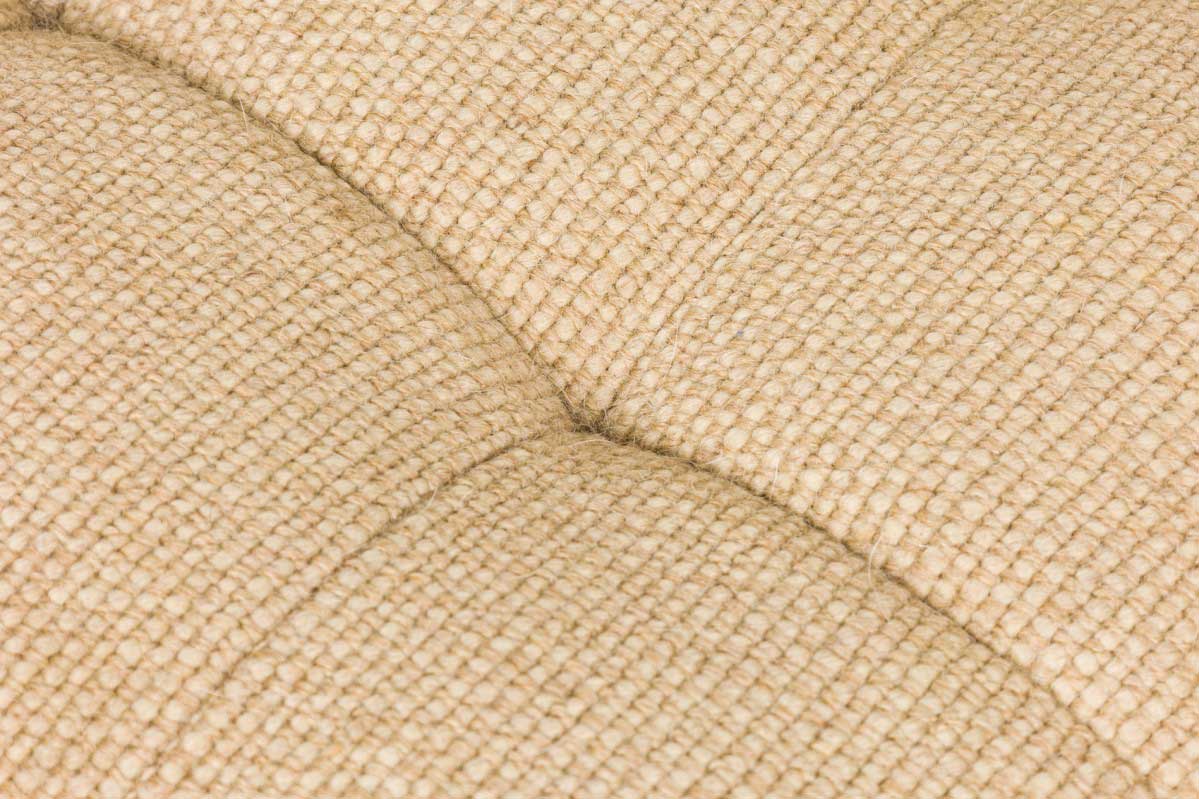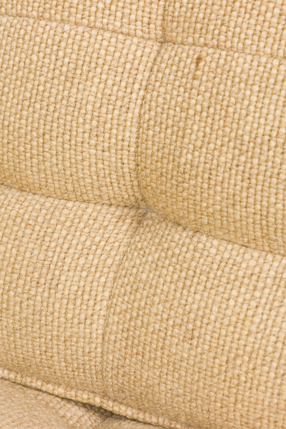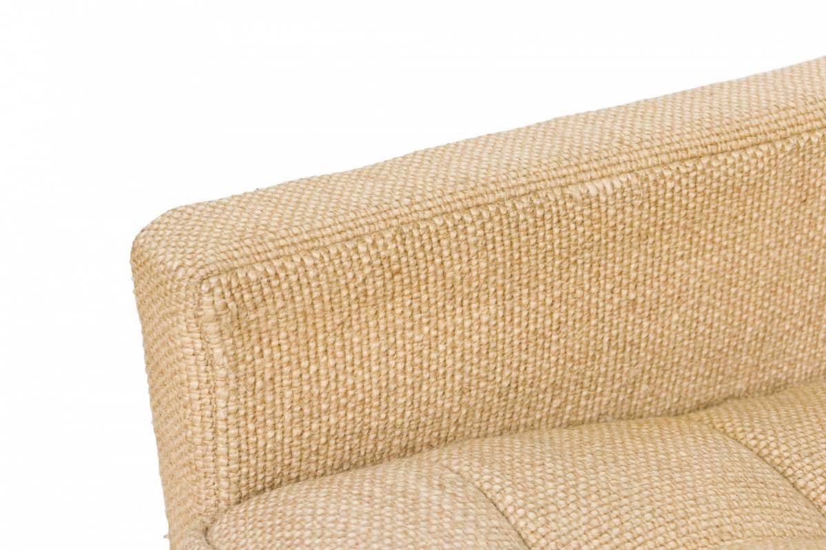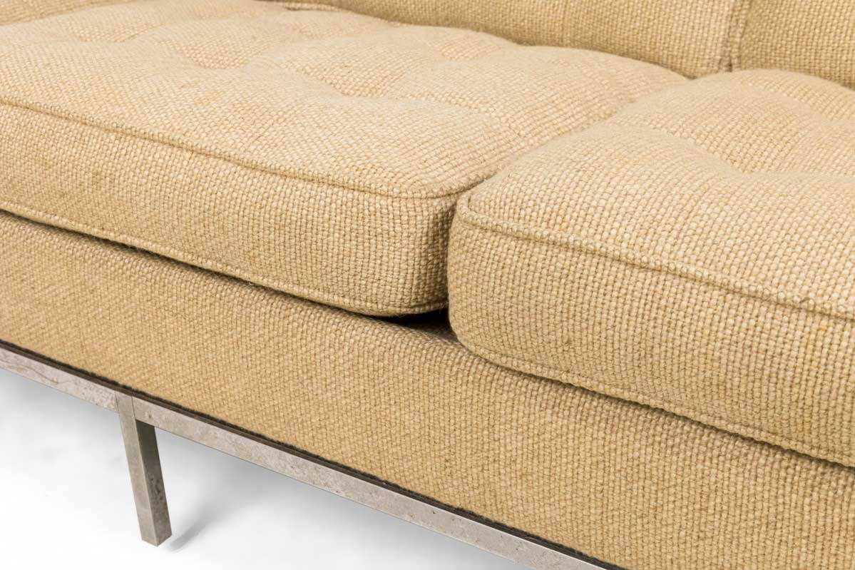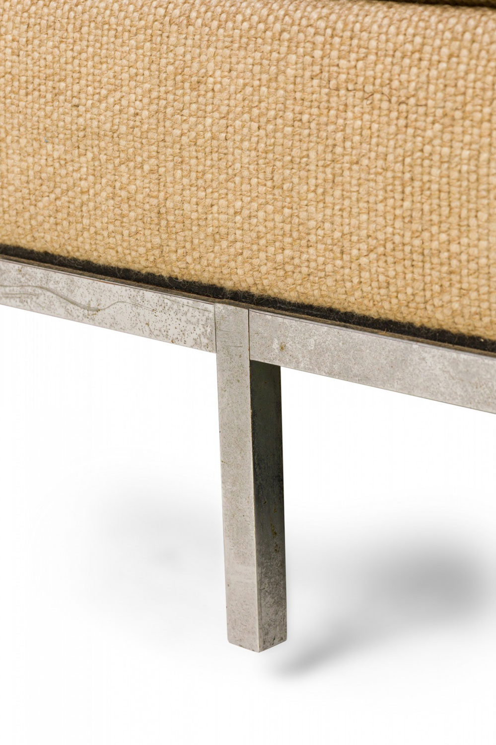 Mid-Century American three-seated sofa upholstered in a beige weave with low back, and three removable seat cushions, standing on a metal frame with 6 legs.