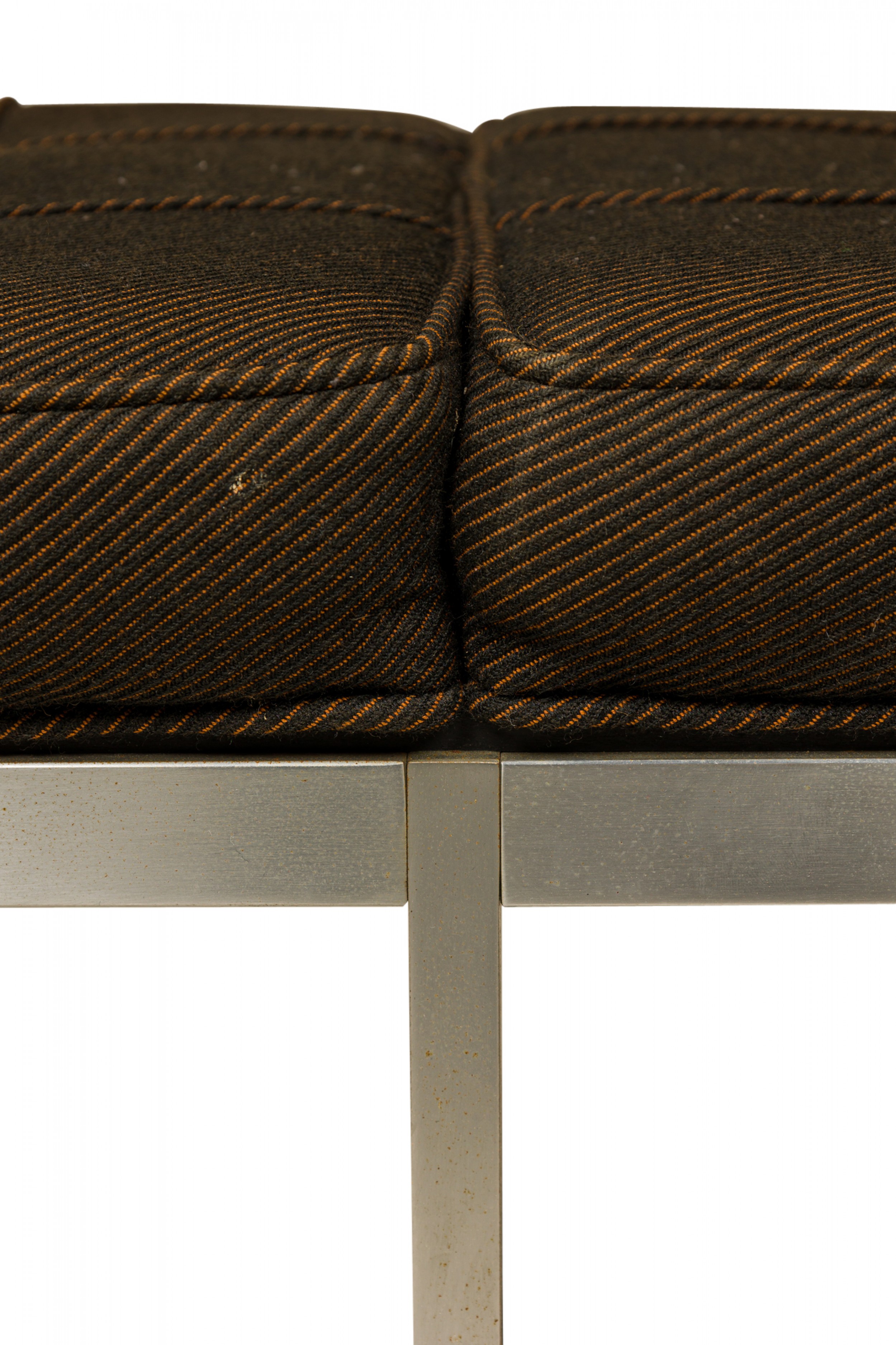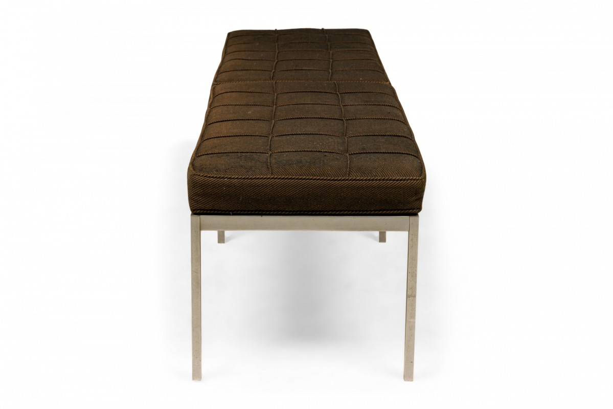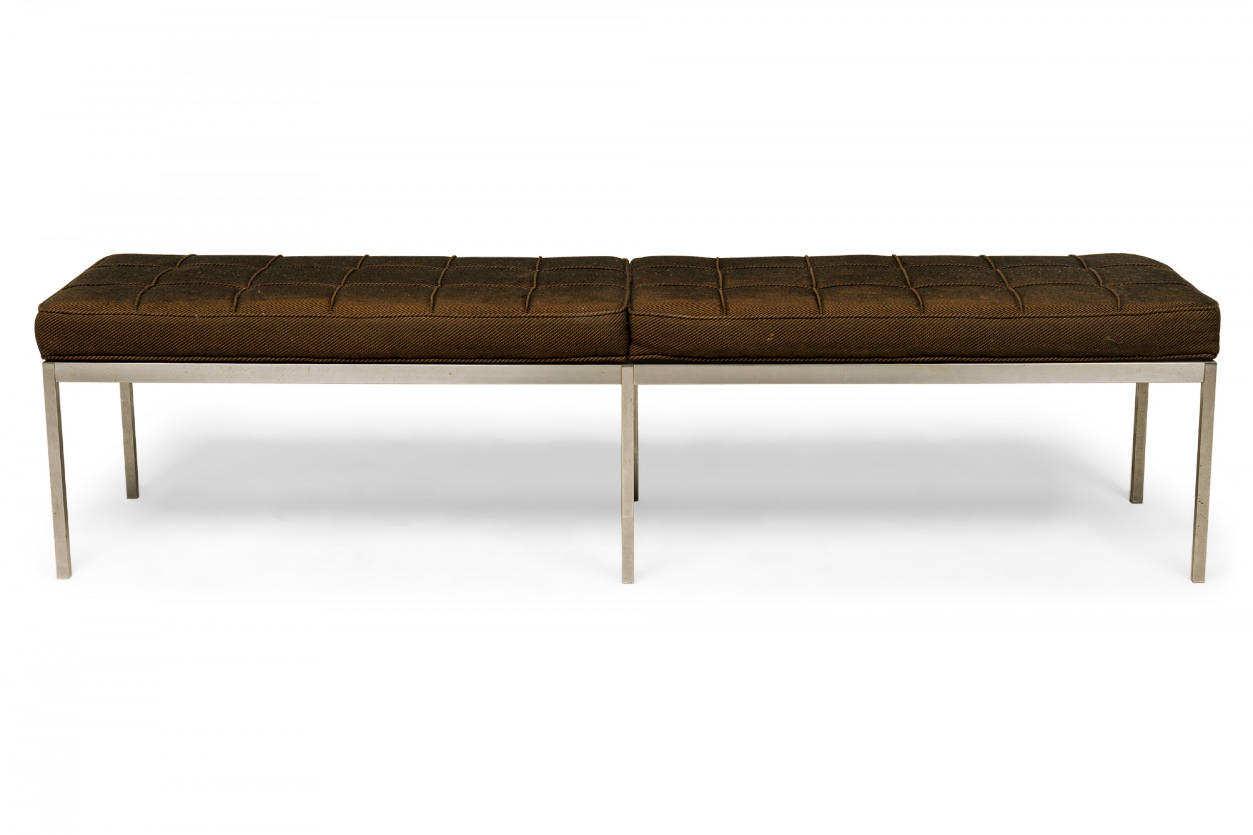 American Mid-Century rectangular museum bench with a brown fabric upholstered square channeled seat resting on a square chrome tube frame.