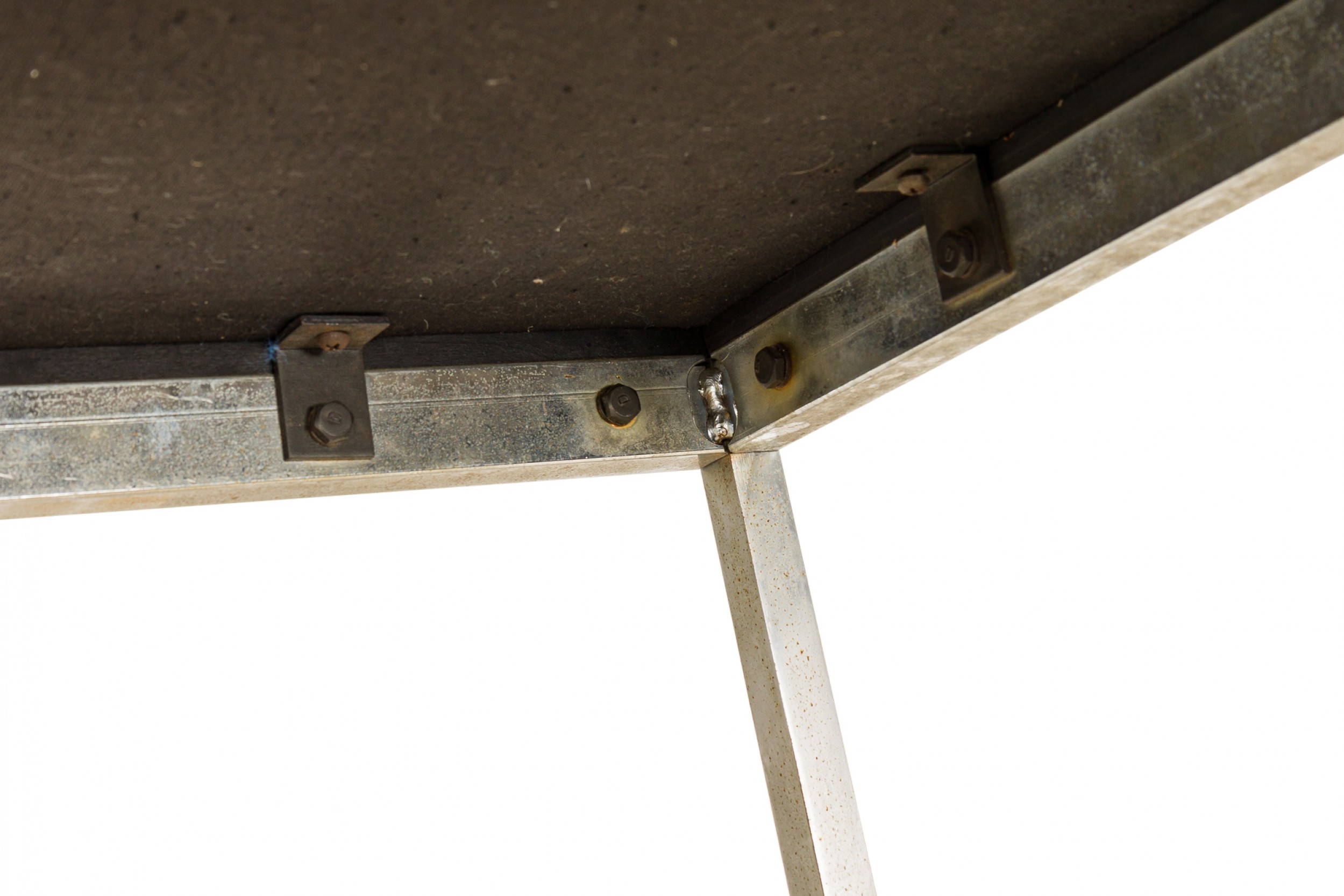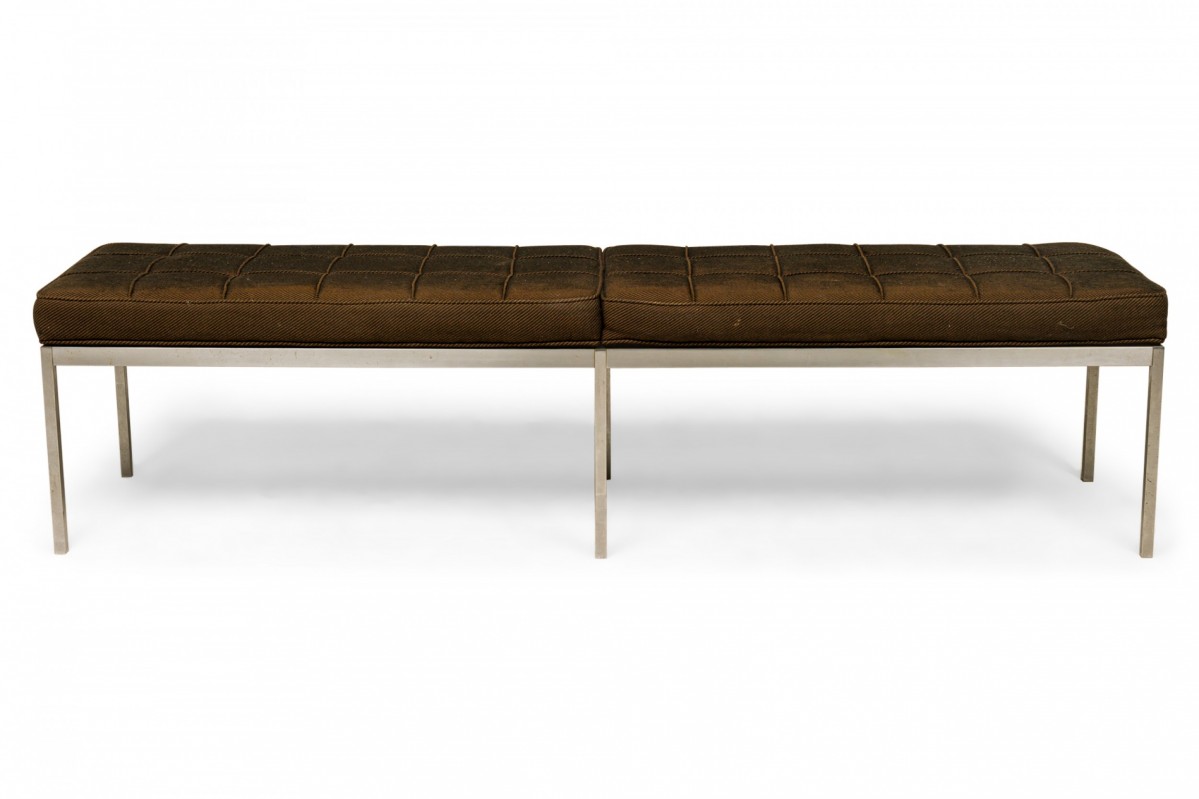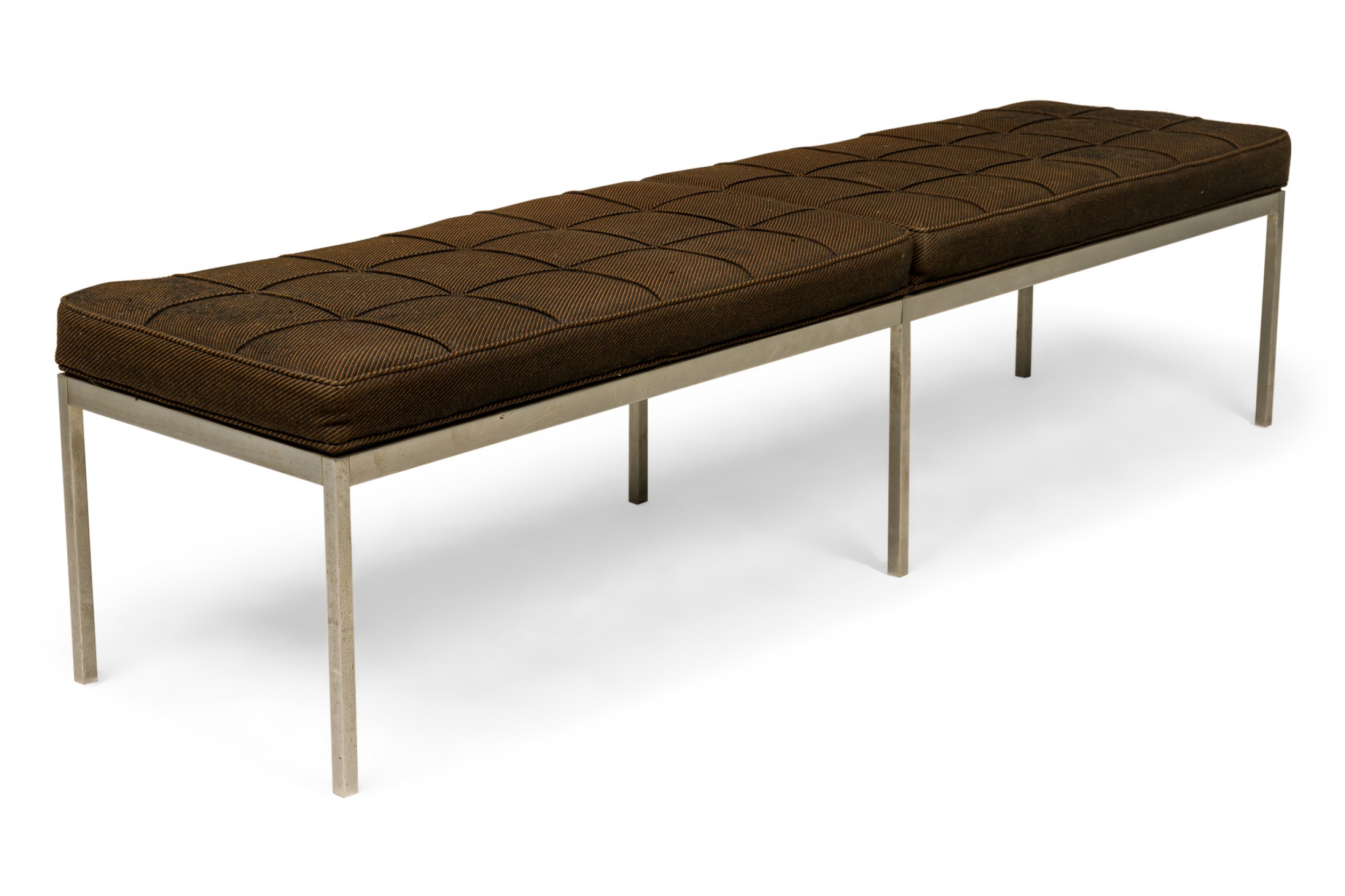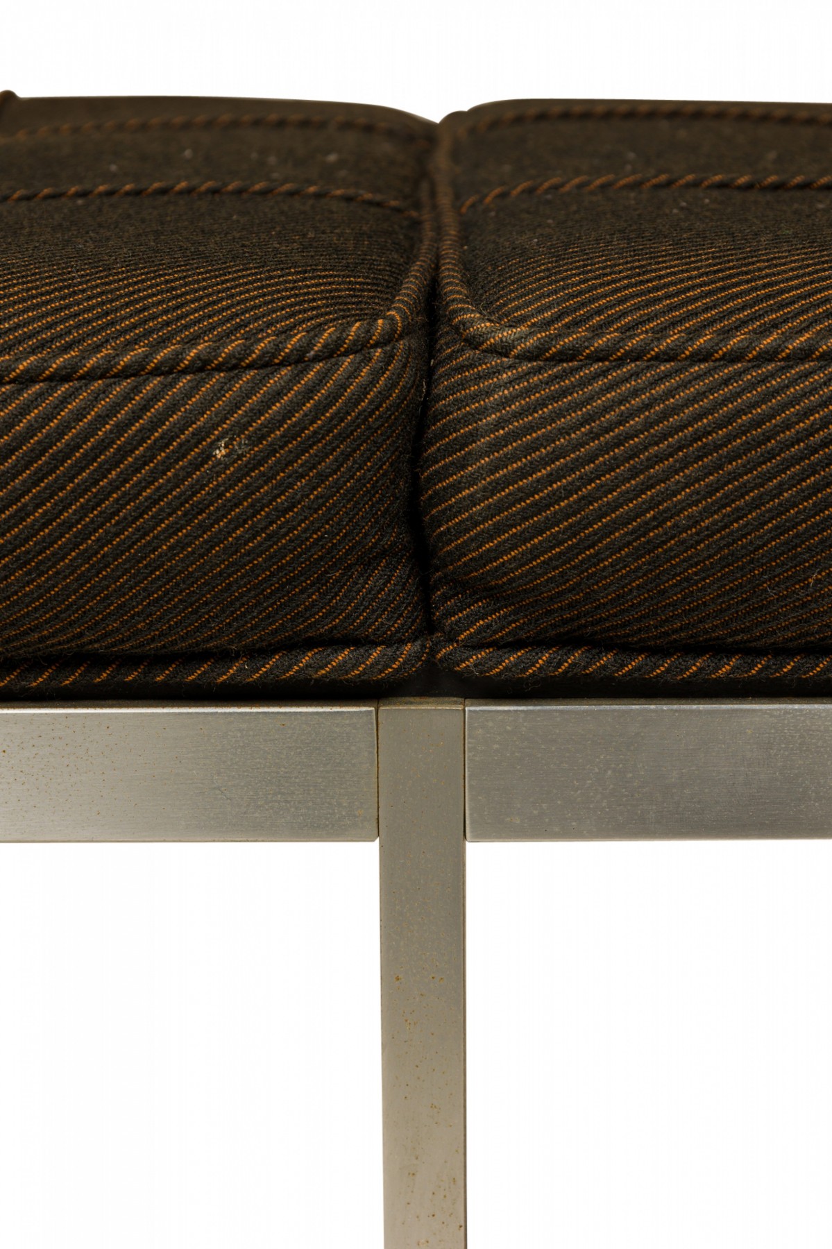 American Mid-Century rectangular museum bench with a brown fabric upholstered square channeled seat resting on a square chrome tube frame.