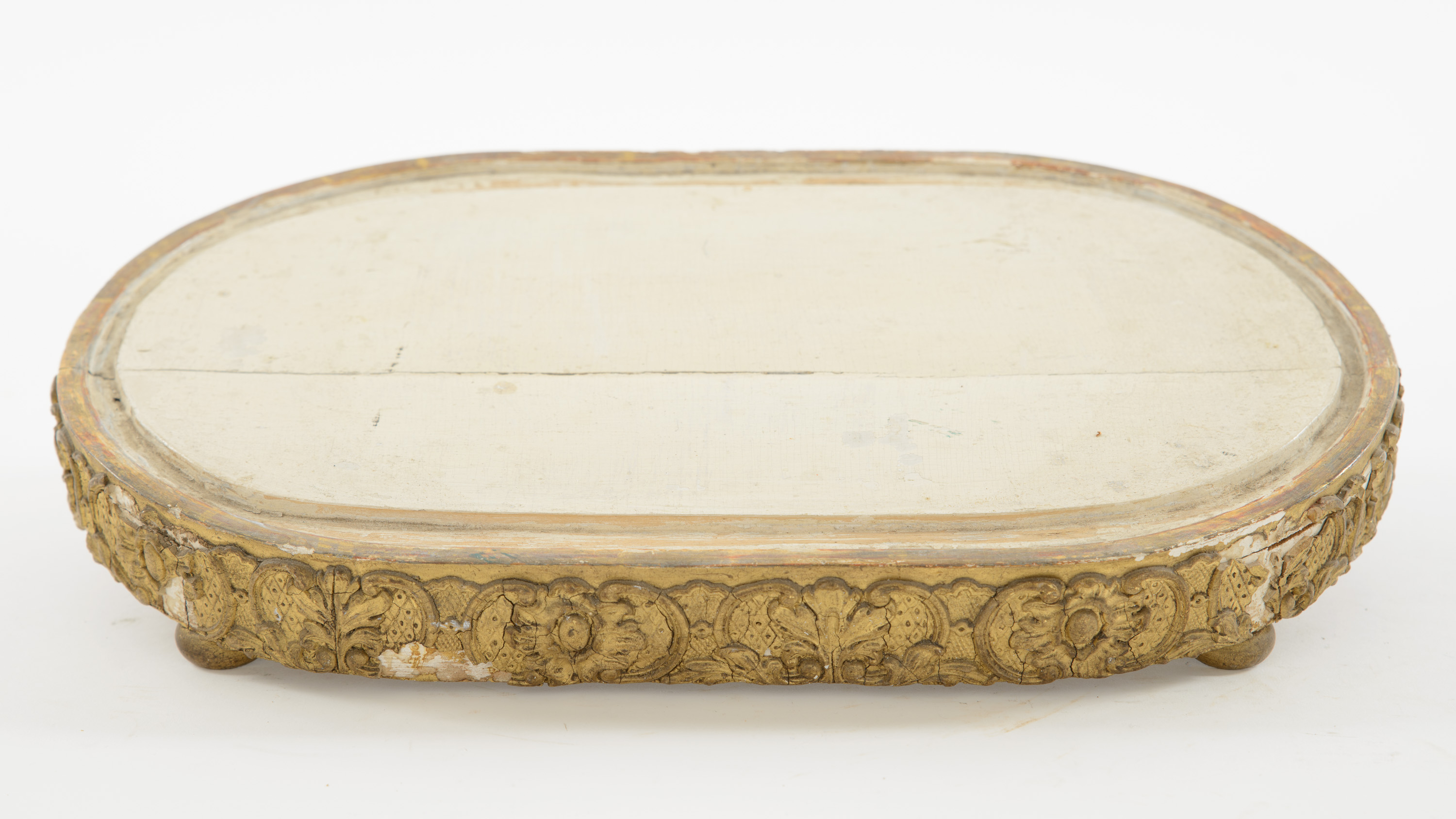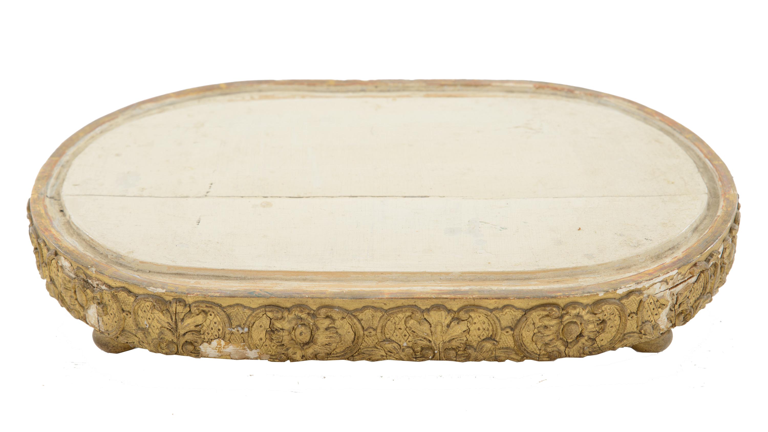 Vintage oval wooden display stand with a white painted top and a gold painted carved Florentine edge with four flattened circular feet