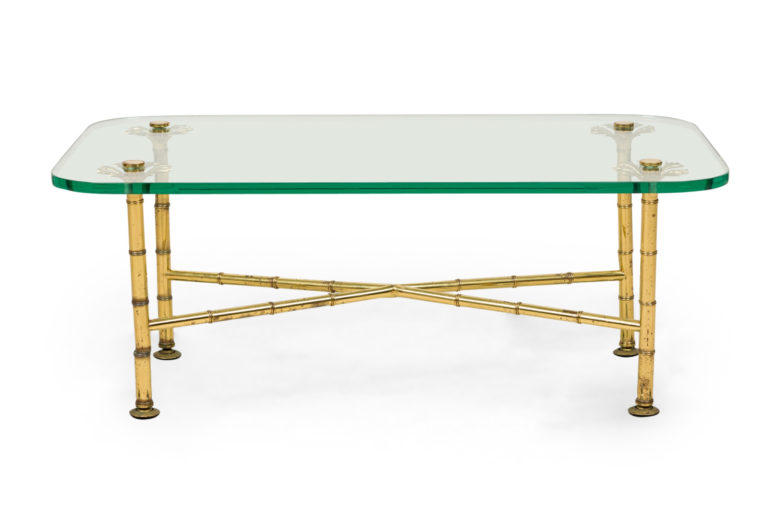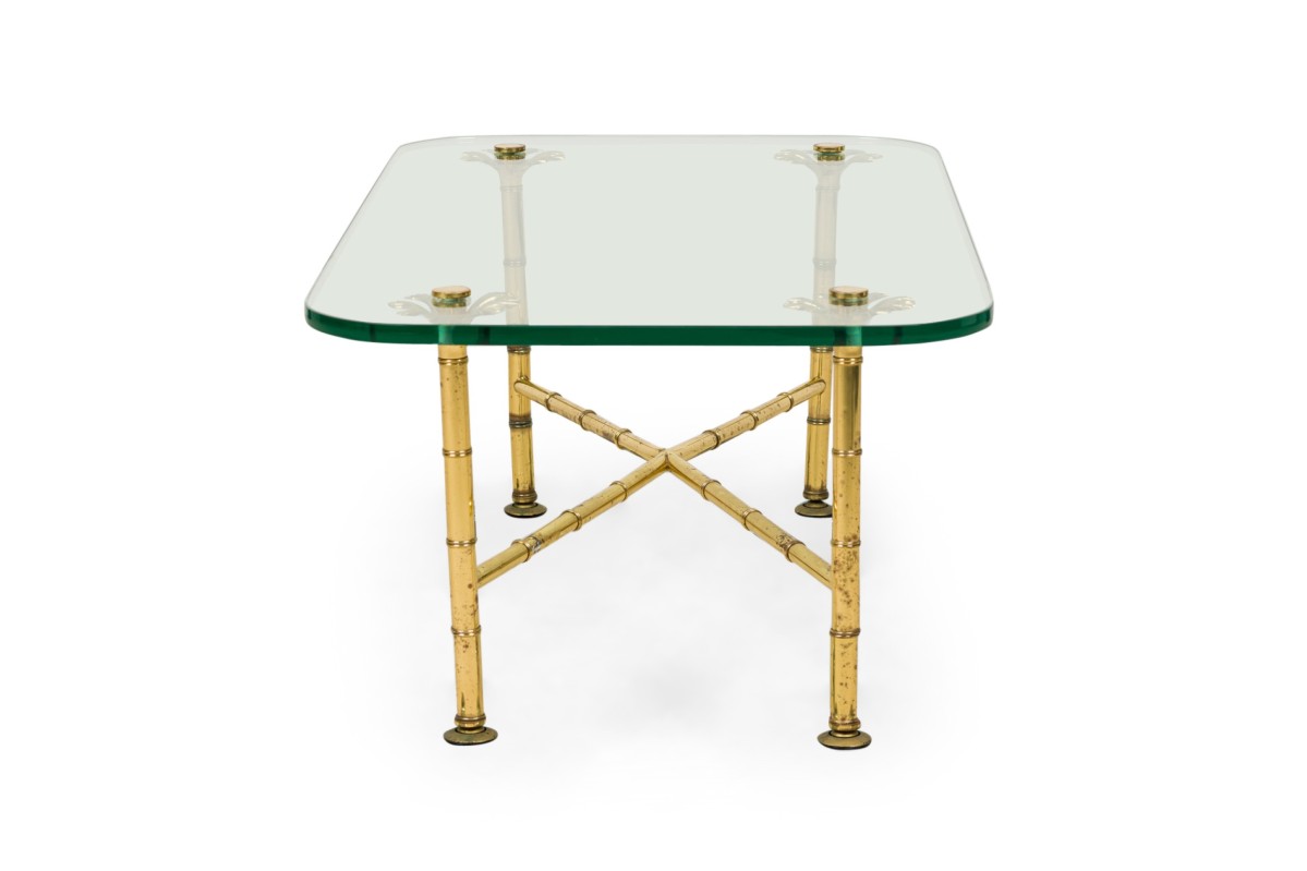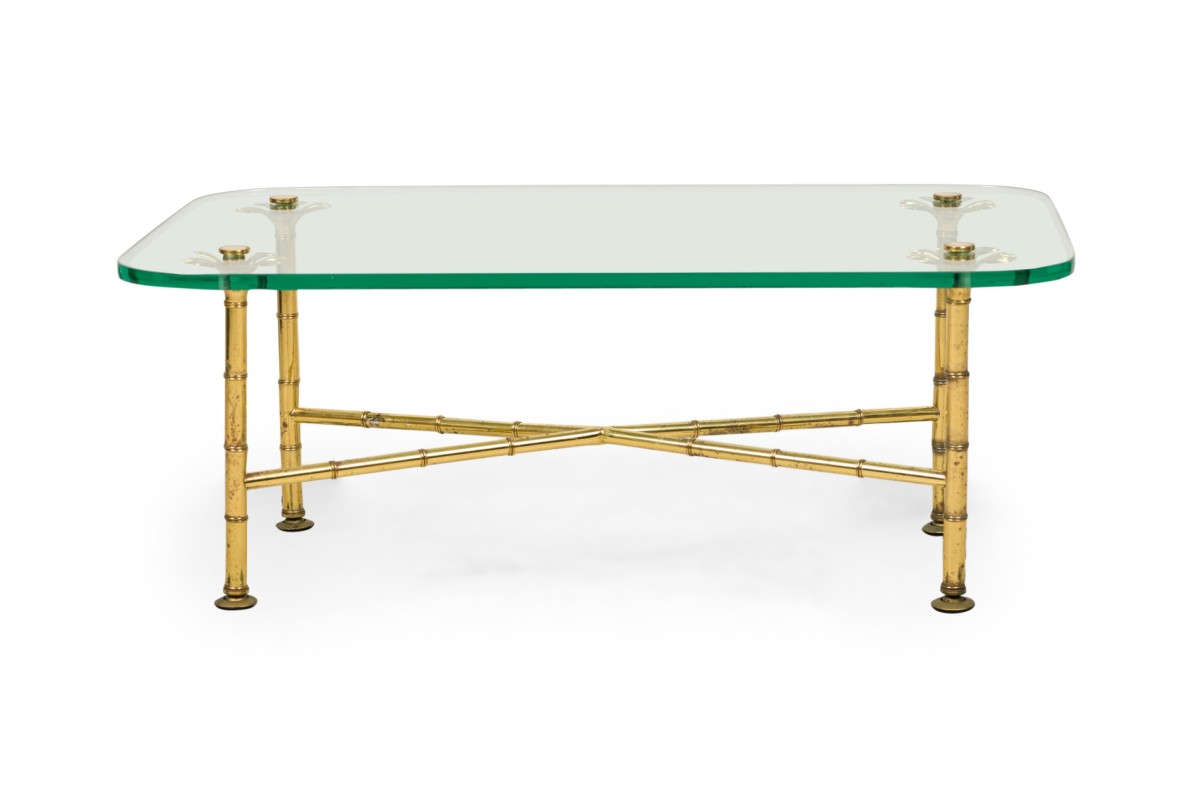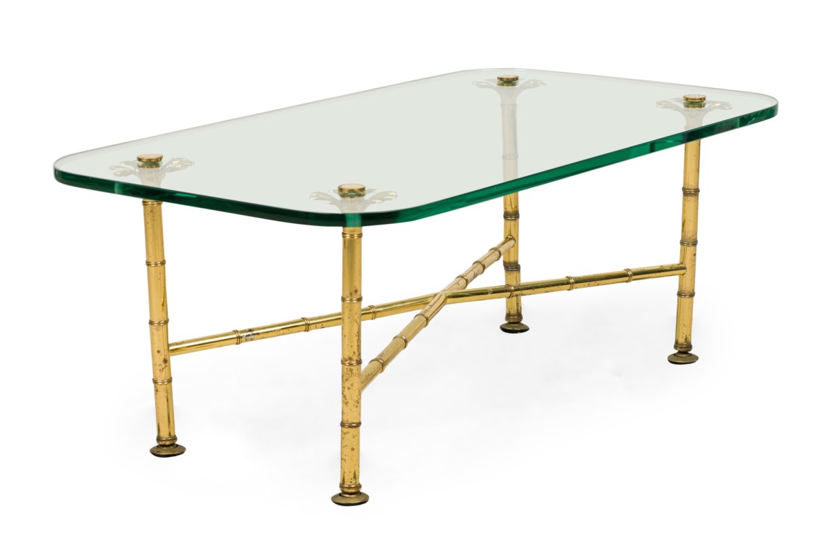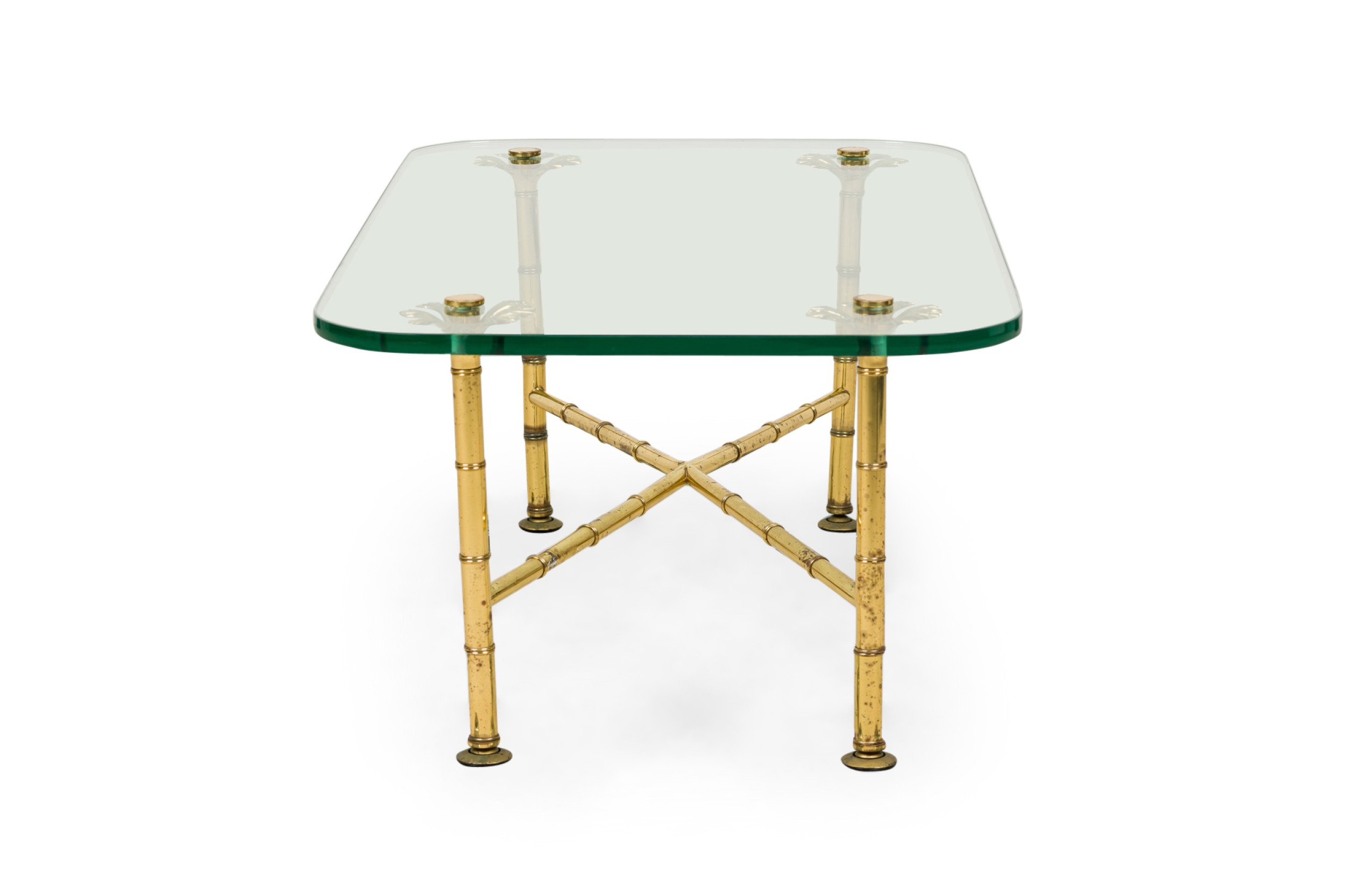 Italian Mid-Century low / coffee tables with x-form brass faux bamboo frames with branch-like upper supports that hold rectangular clear glass tops with rounded corners. (MATCHING TABLE: REG5024A)