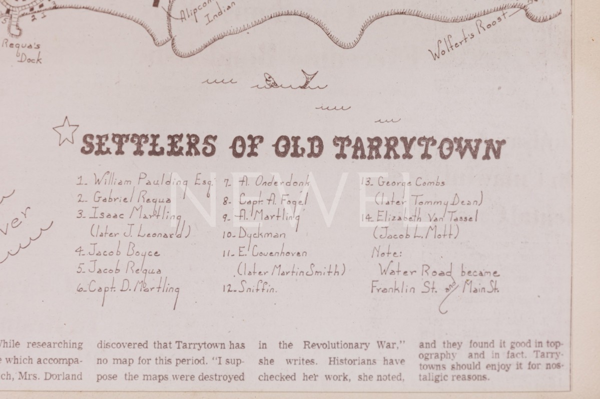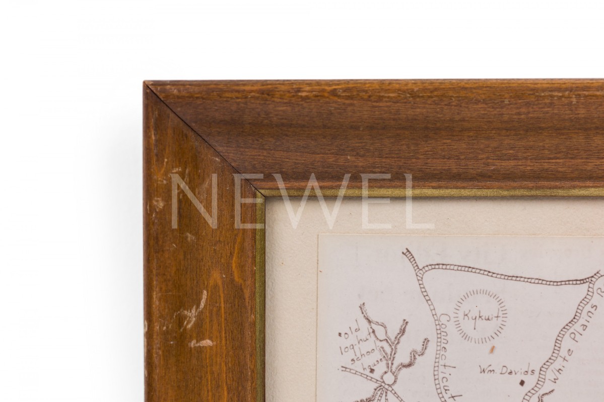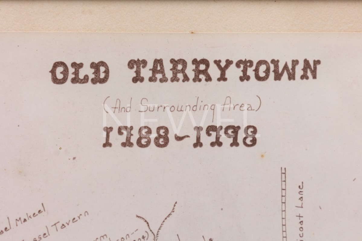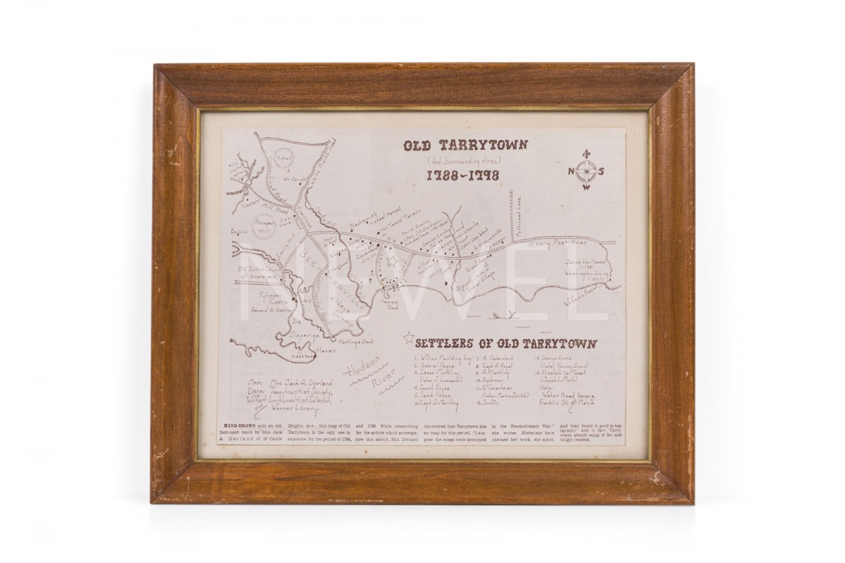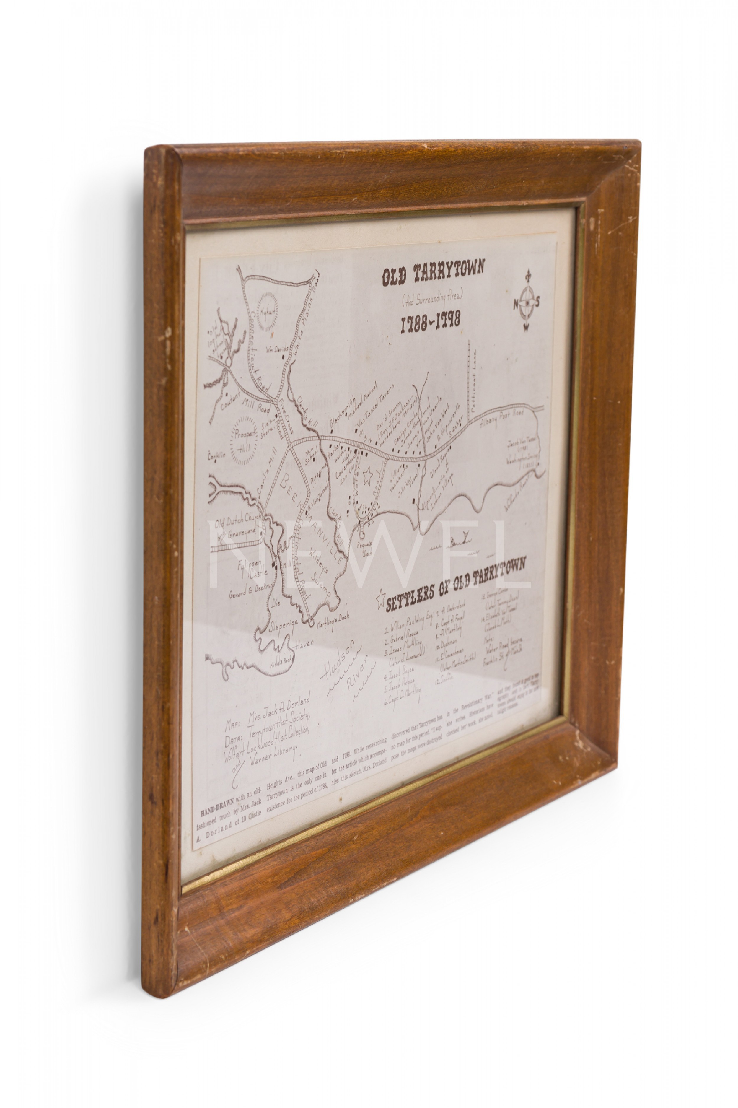American Country "Settlers of Old Tarrytown" 1788-98 map print originally hand-drawn by Mrs. Jack A. Dorland of 10 Castle Heights Avenue mounted in a rectangular wood frame with inset gold leaf painted border.