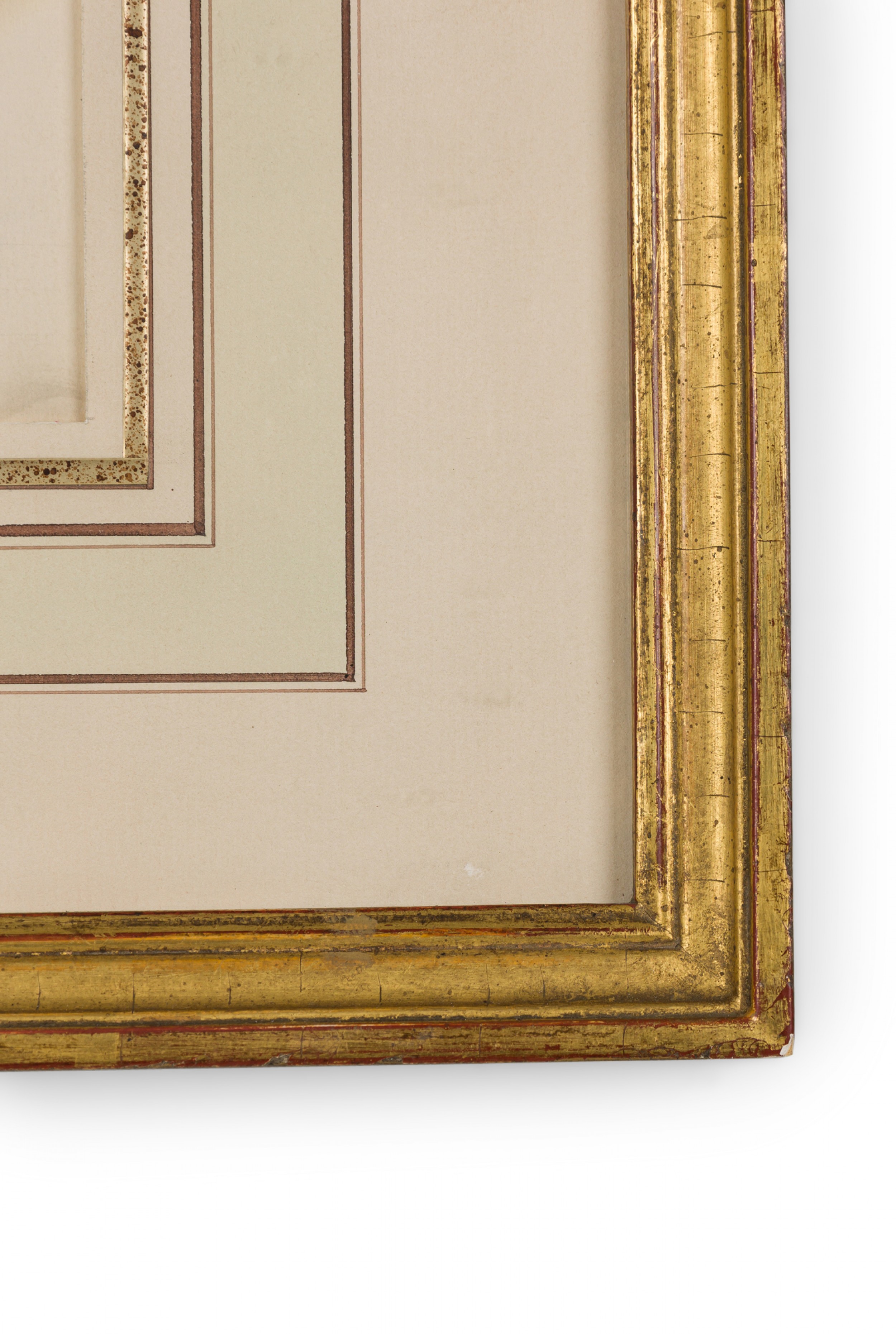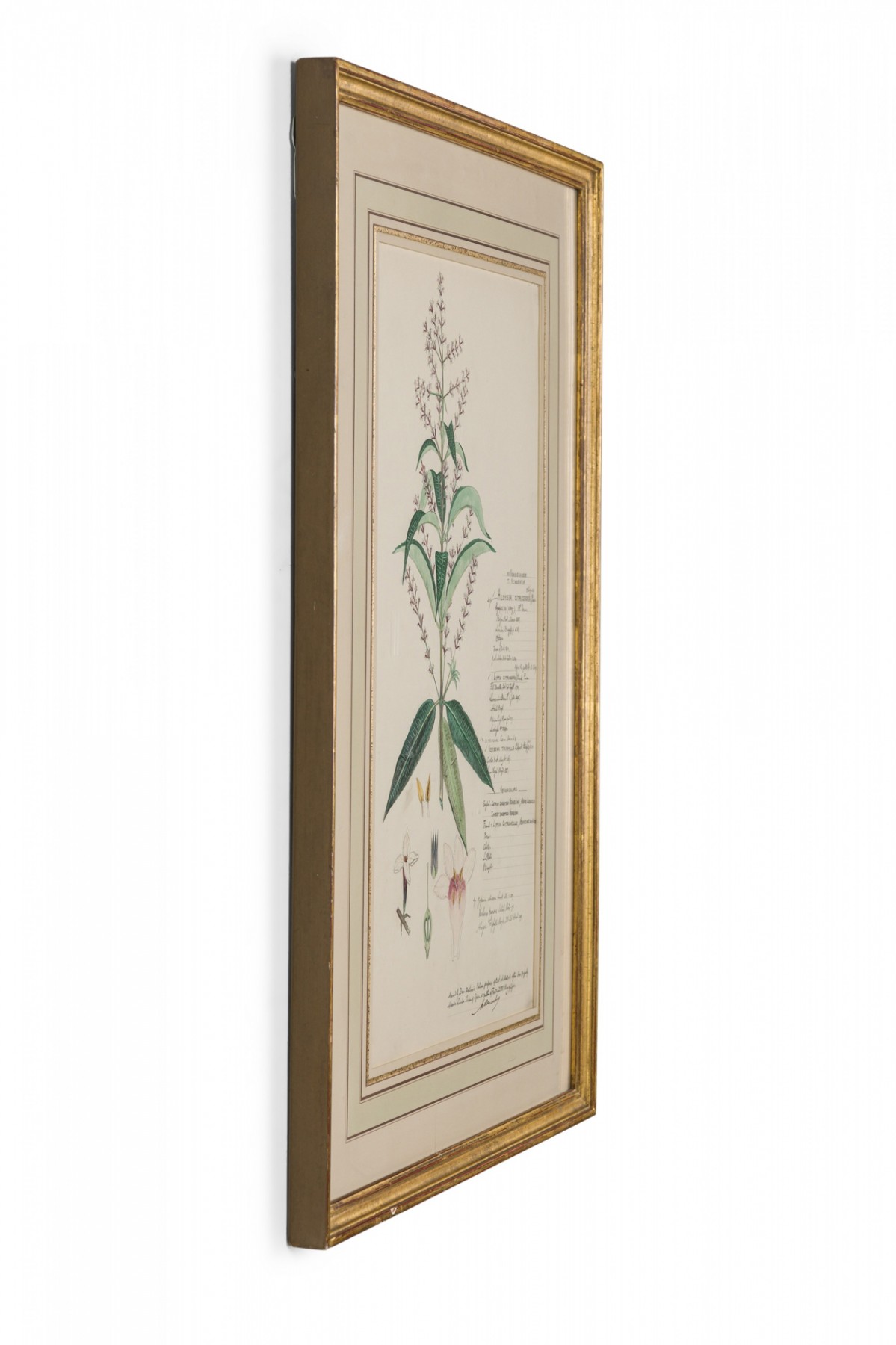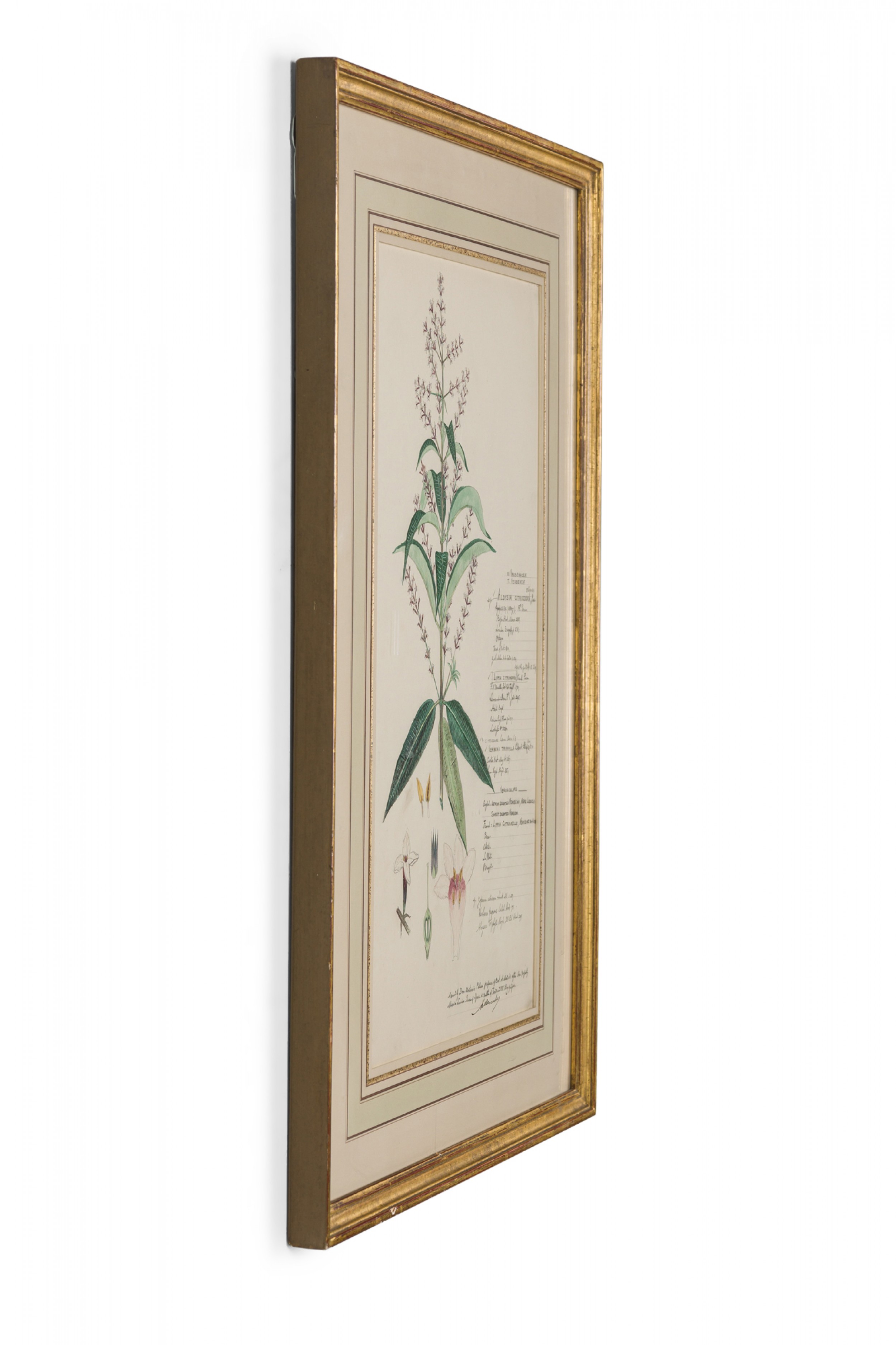 American Victorian (19th Century) watercolor, ink, and pencil botanical drawing depicting a Aloysia Citriodora plant in green tones against a beige background, matted in a beveled parcel gilt painted wood frame.(Companion pieces: 063653-063701)