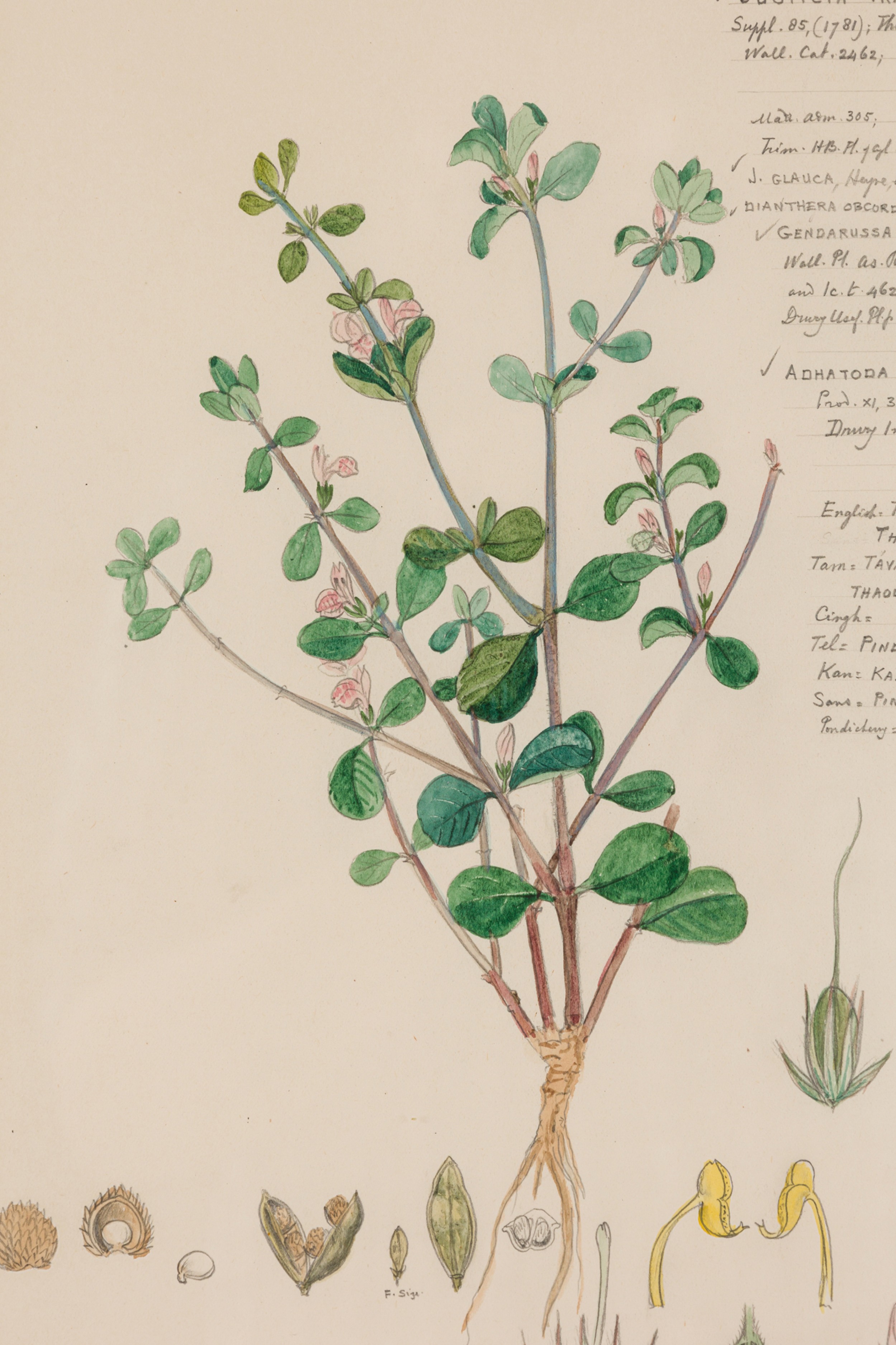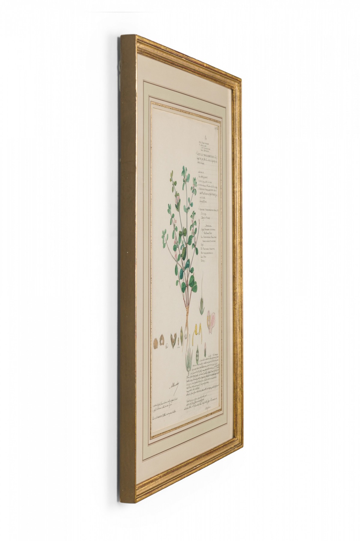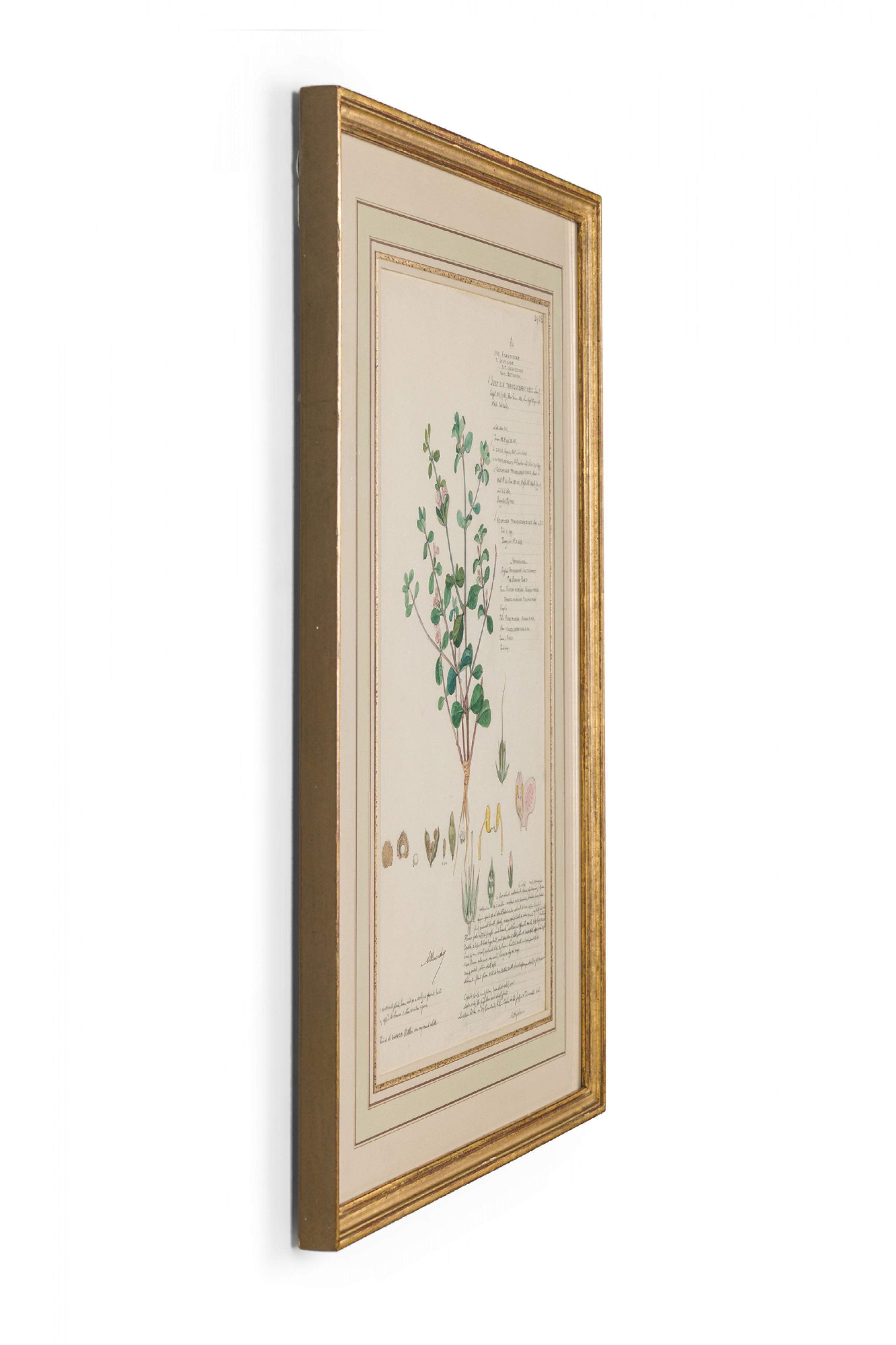 American Victorian (19th Century) watercolor, ink, and pencil botanical drawing depicting a Justicia Tranquebariensis plant in green tones against a beige background, matted in a beveled parcel gilt painted wood frame. (Companion pieces: 063653-063701)