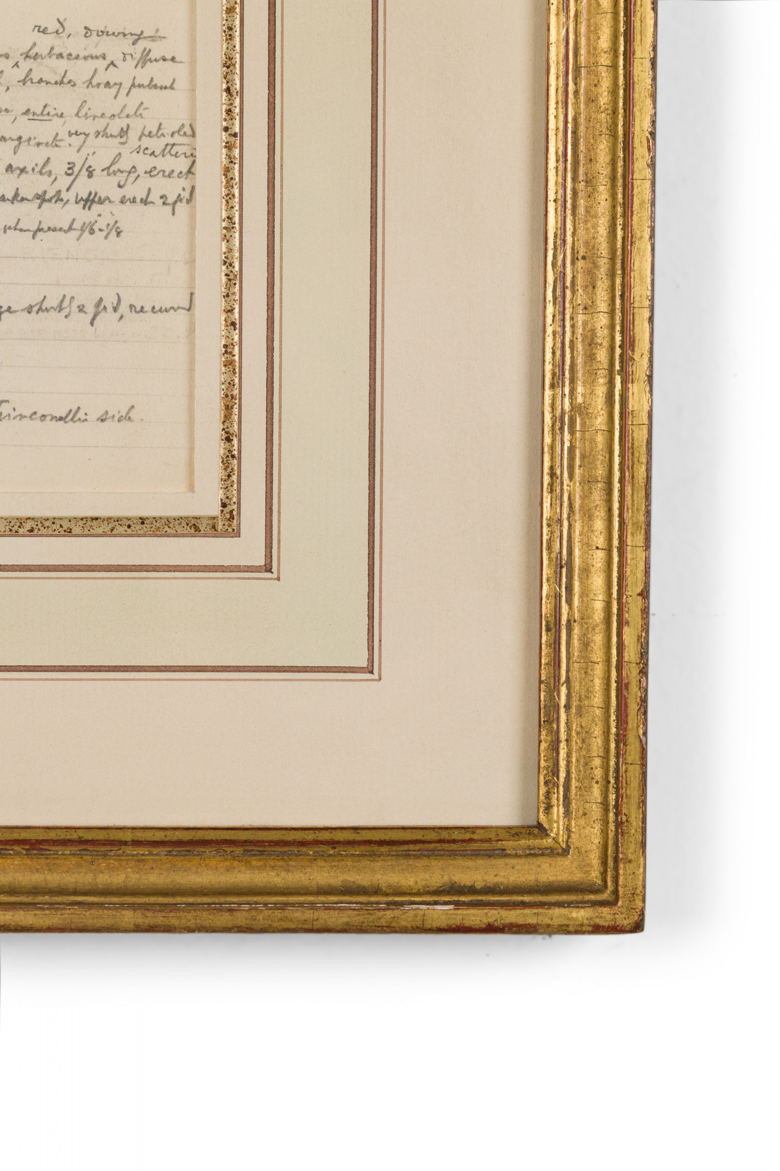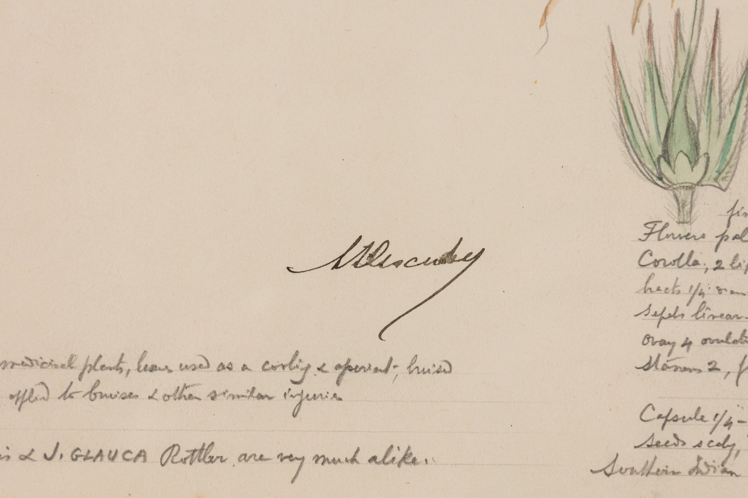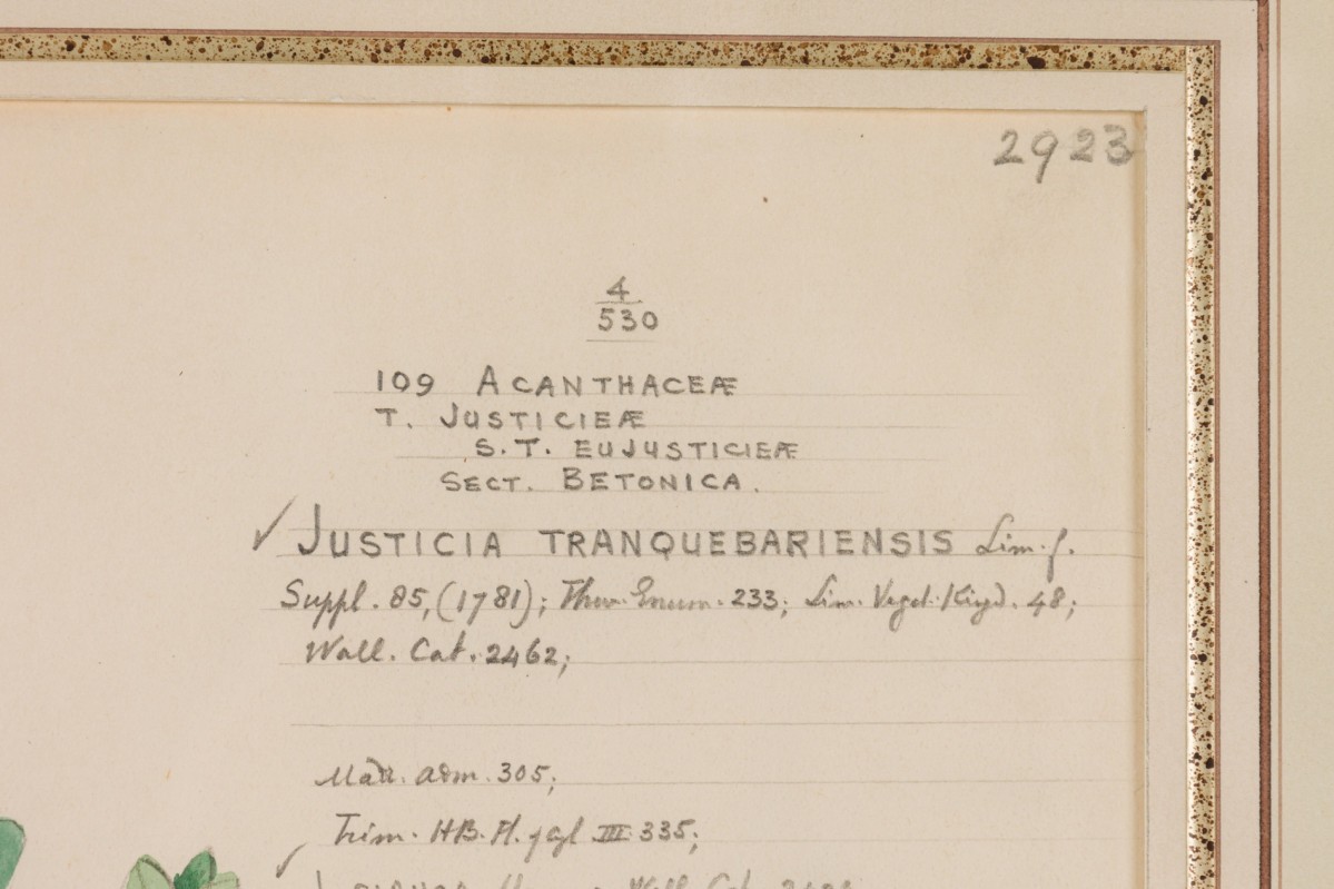 American Victorian (19th Century) watercolor, ink, and pencil botanical drawing depicting a Justicia Tranquebariensis plant in green tones against a beige background, matted in a beveled parcel gilt painted wood frame. (Companion pieces: 063653-063701)