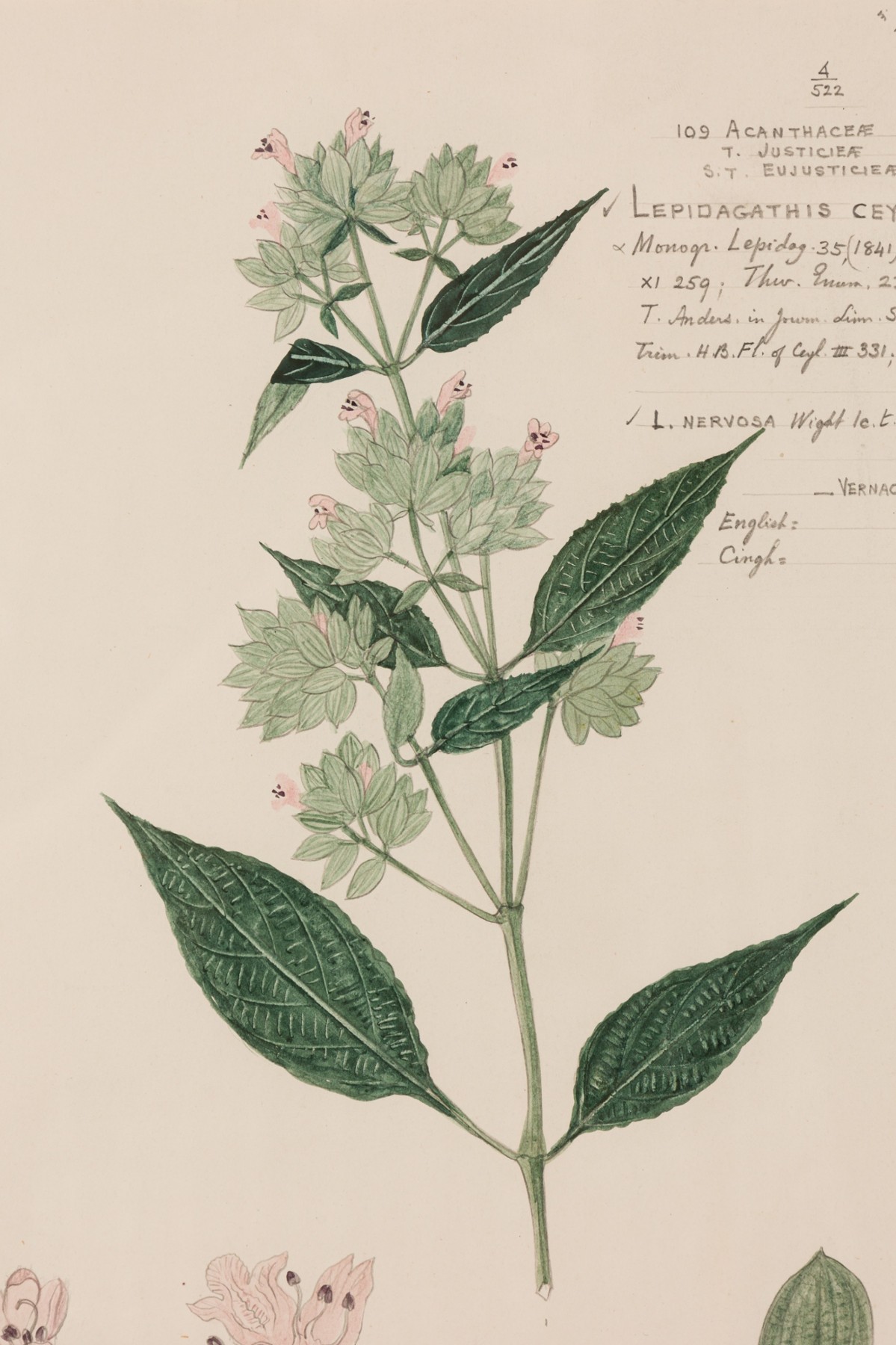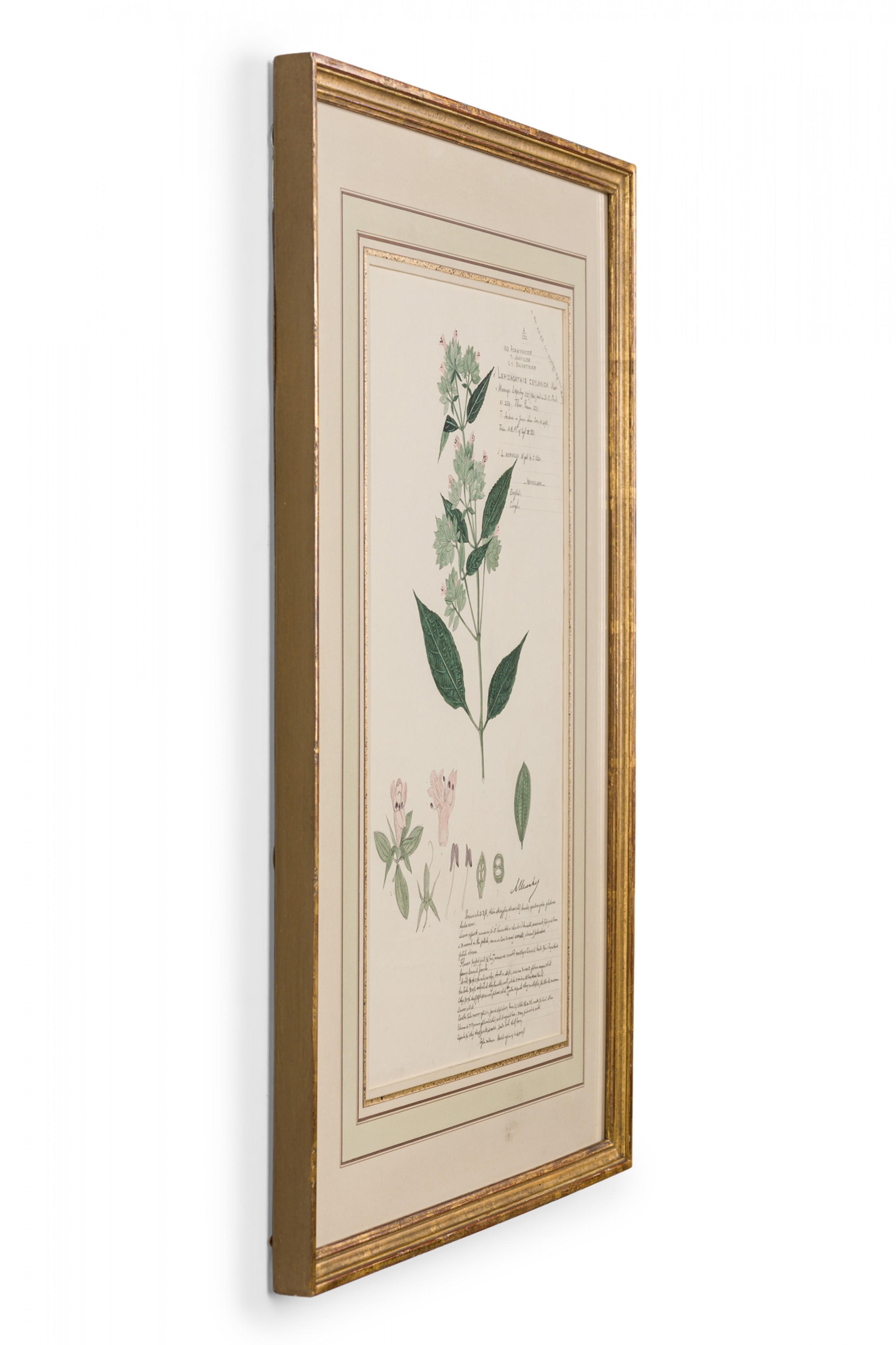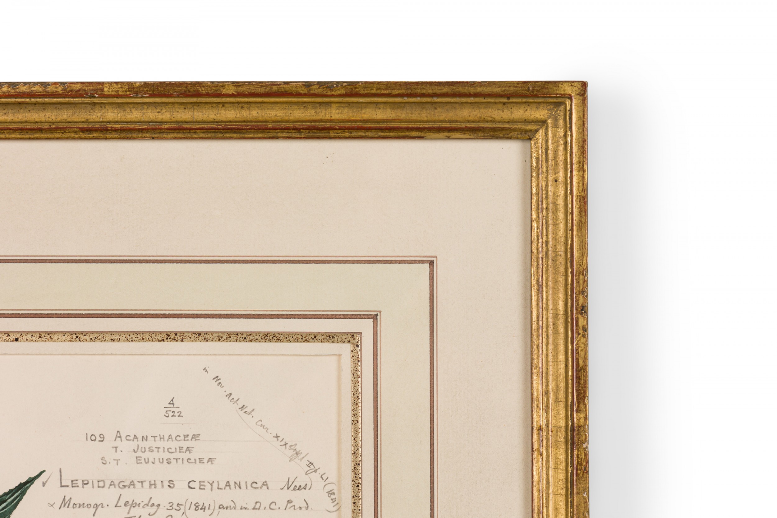 American Victorian (19th Century) watercolor, ink, and pencil botanical drawing depicting a Lepidagathis Ceylanica plant in green tones against a beige background, matted in a beveled parcel gilt painted wood frame. (Companion pieces: 063653-063701)