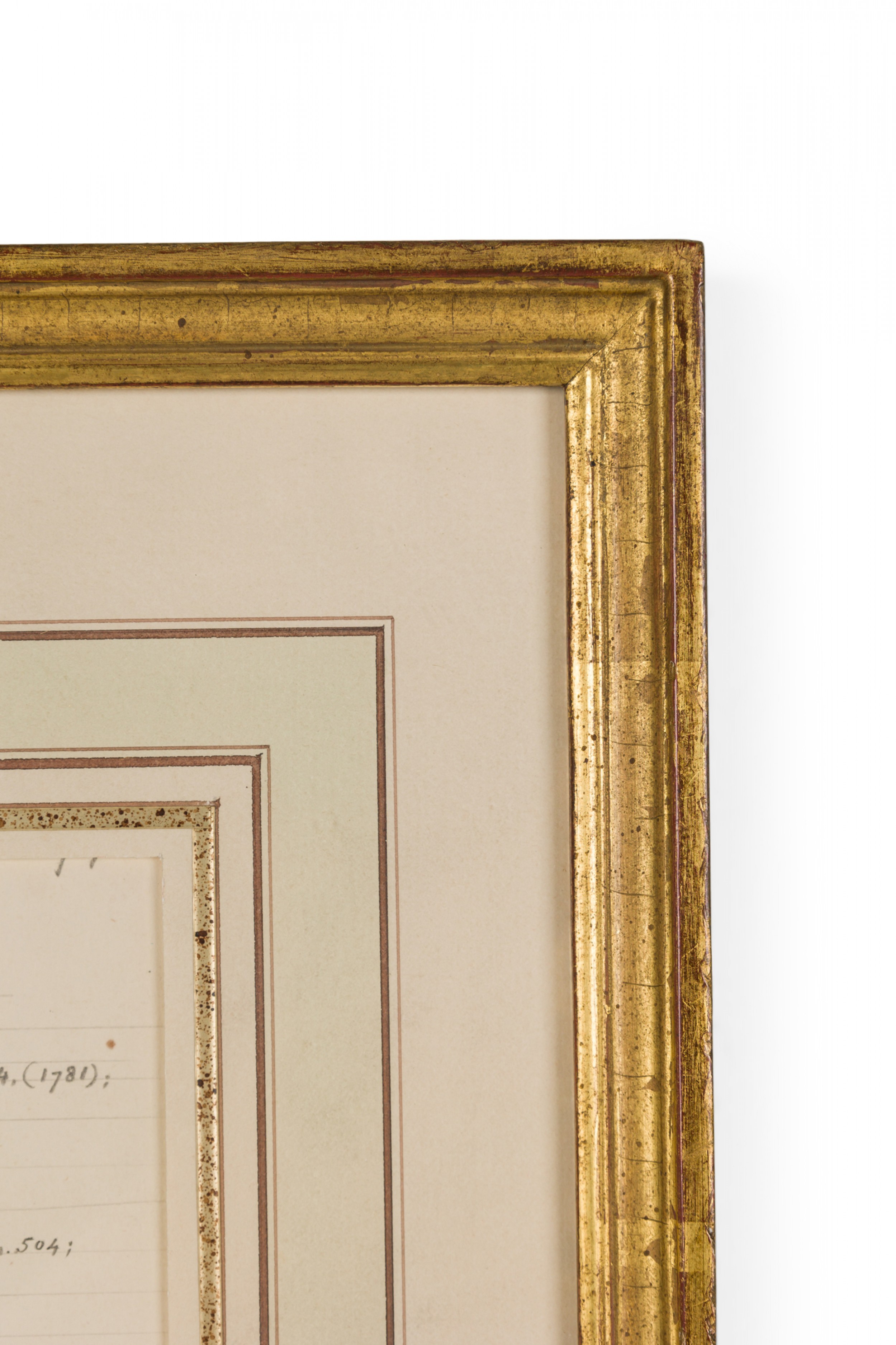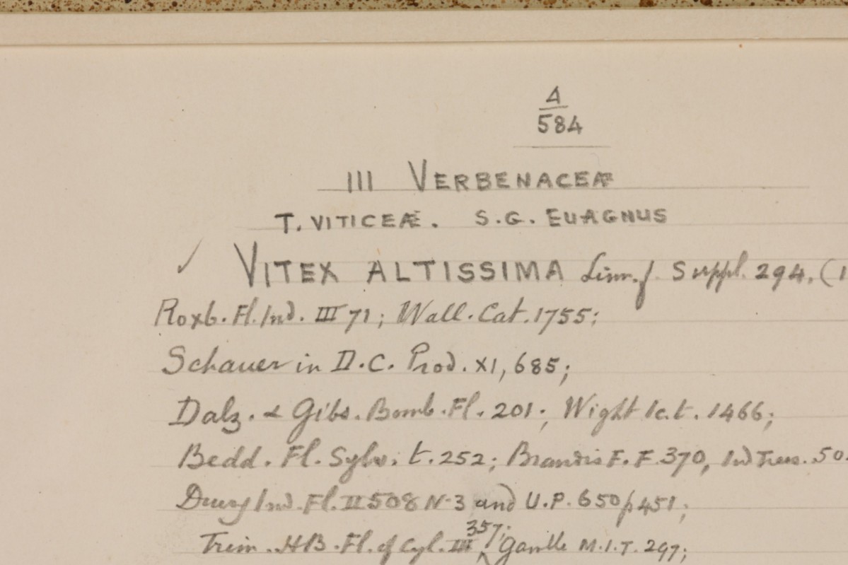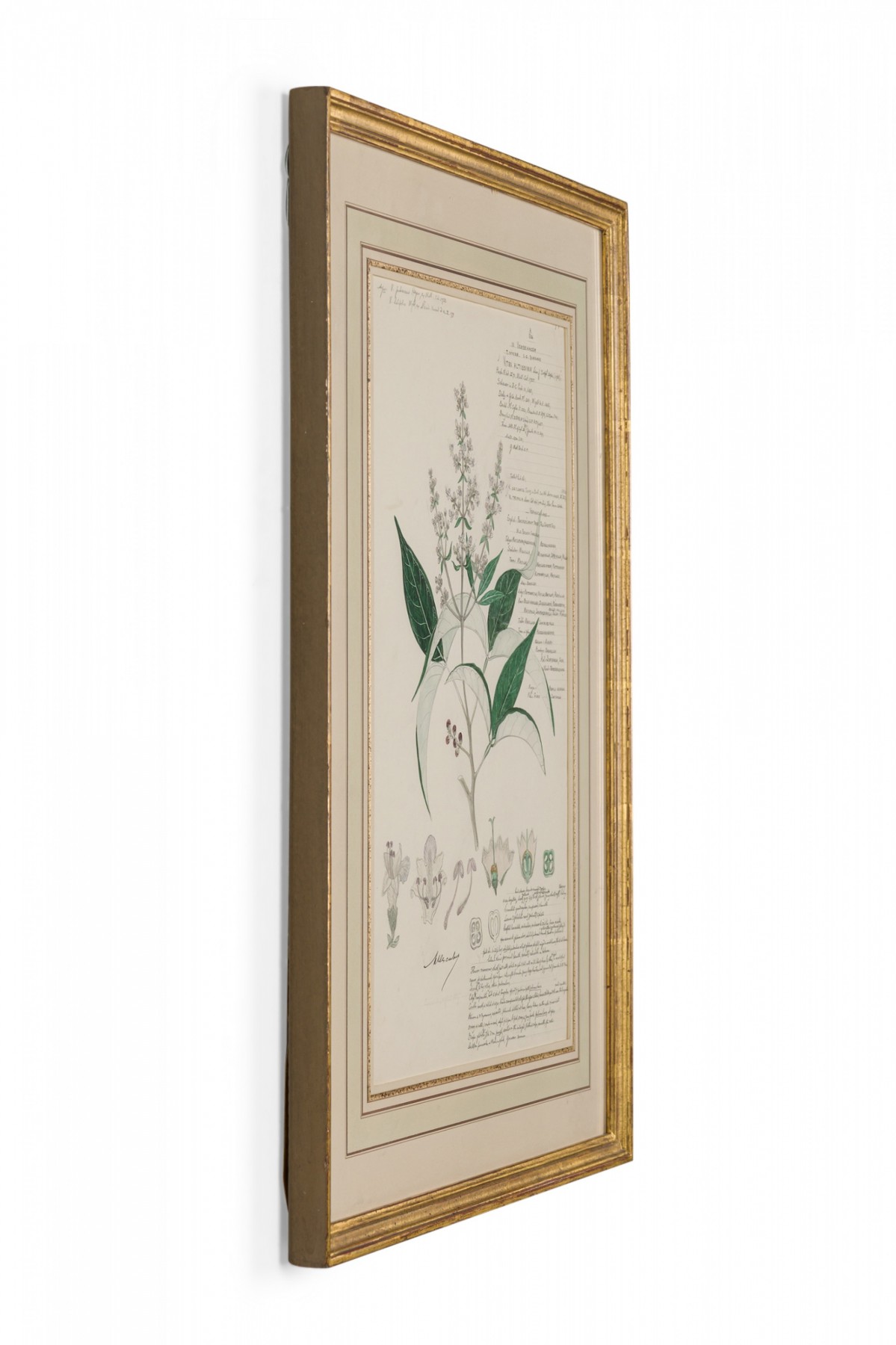 American Victorian (19th Century) watercolor, ink, and pencil botanical drawing depicting a Vitex Altissima plant in green tones against a beige background, matted in a beveled parcel gilt painted wood frame. (Companion pieces: 063653-063701)