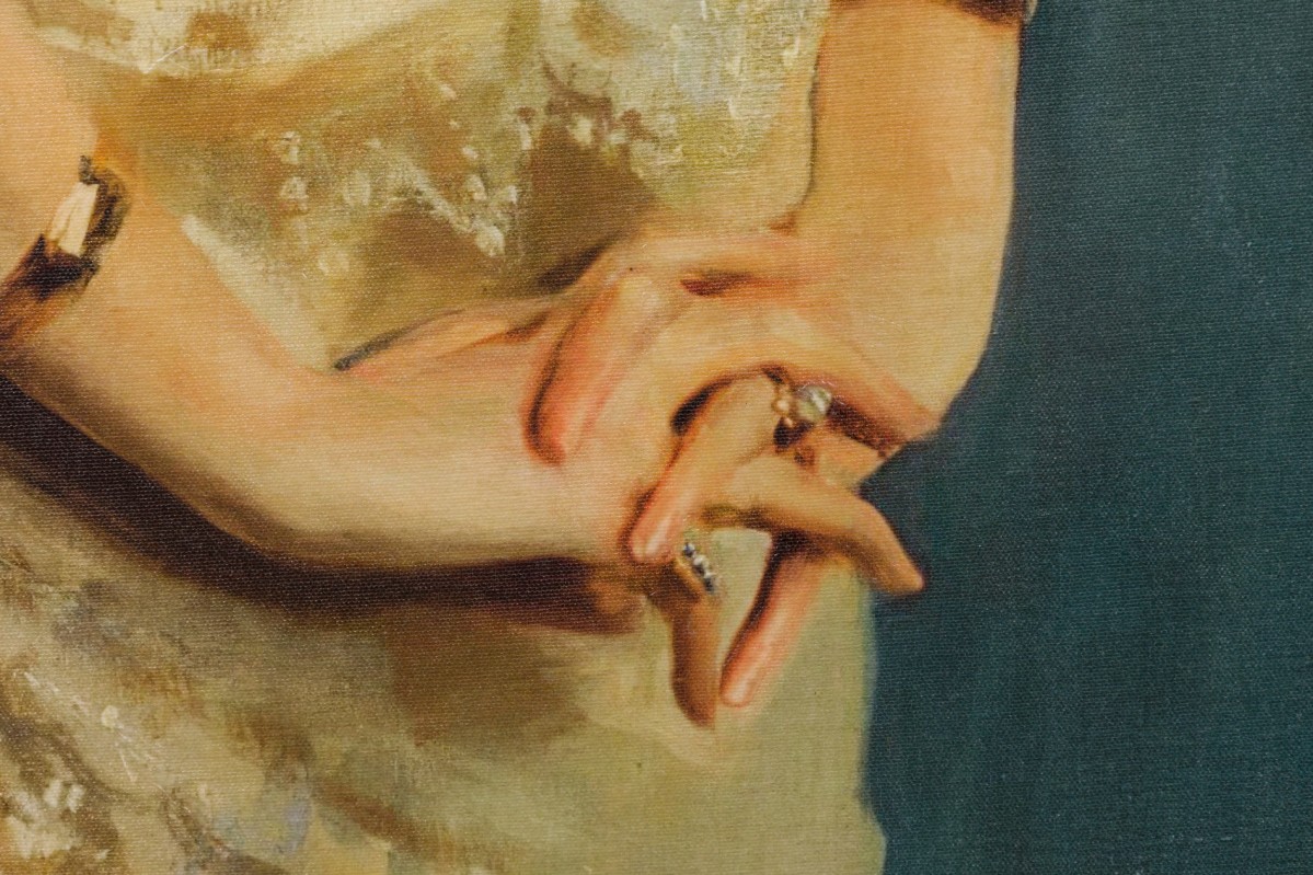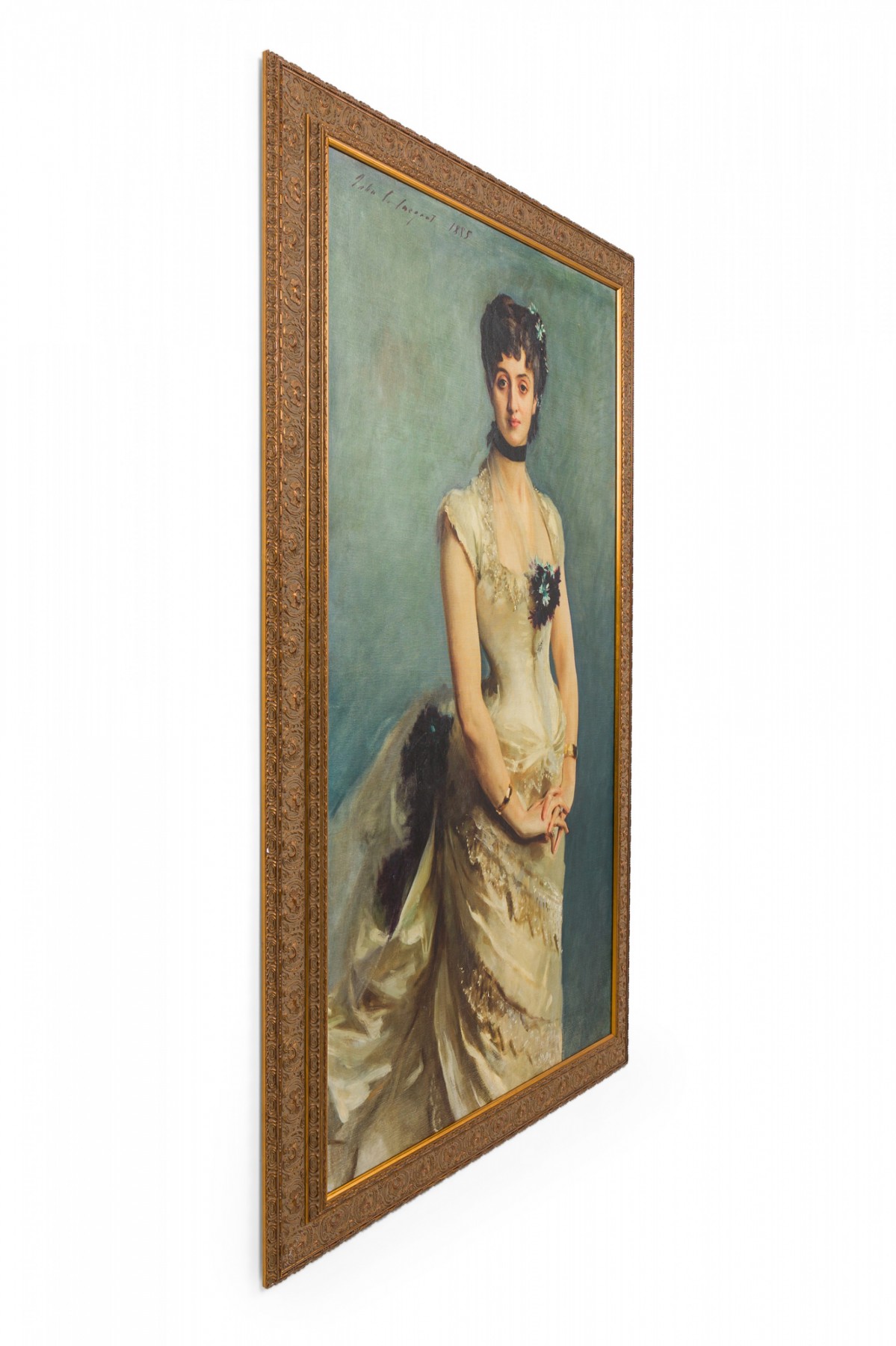 American Victorian style canvas print of an oil portrait depicts a brunette lady standing with hands clasped, wearing a navy blue choker, matching corsage and bustle against a gray background, mounted in a patterned relief giltwood frame.
