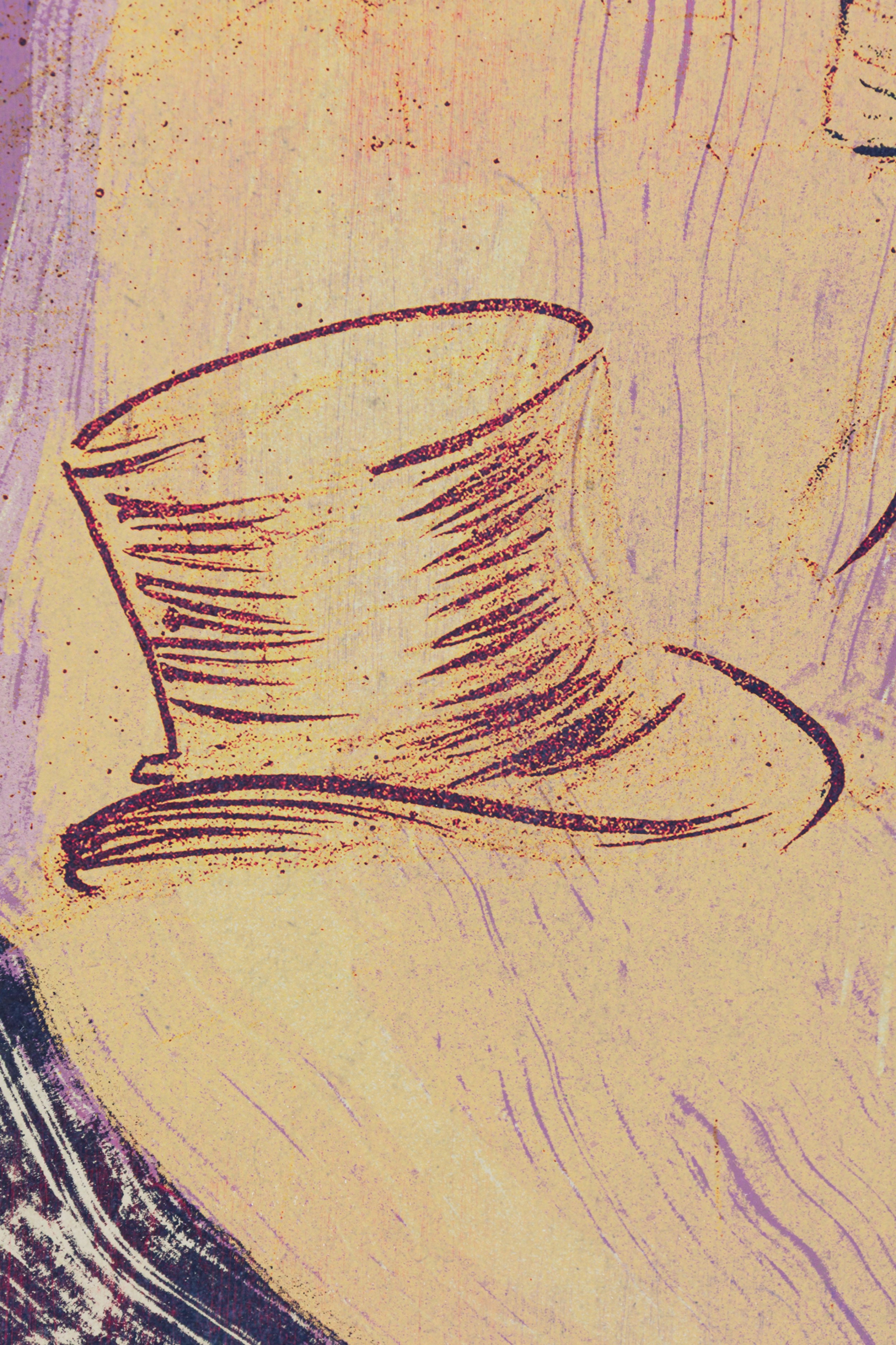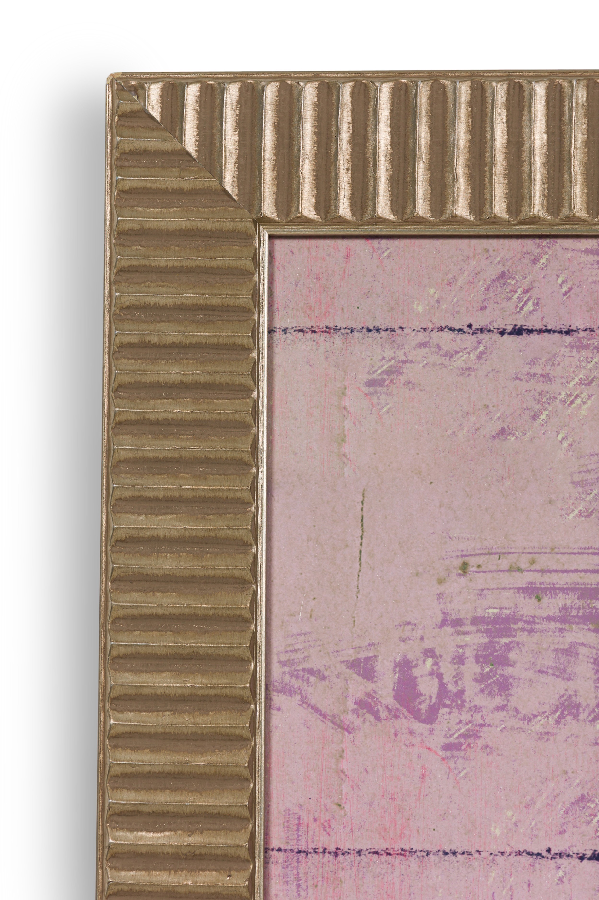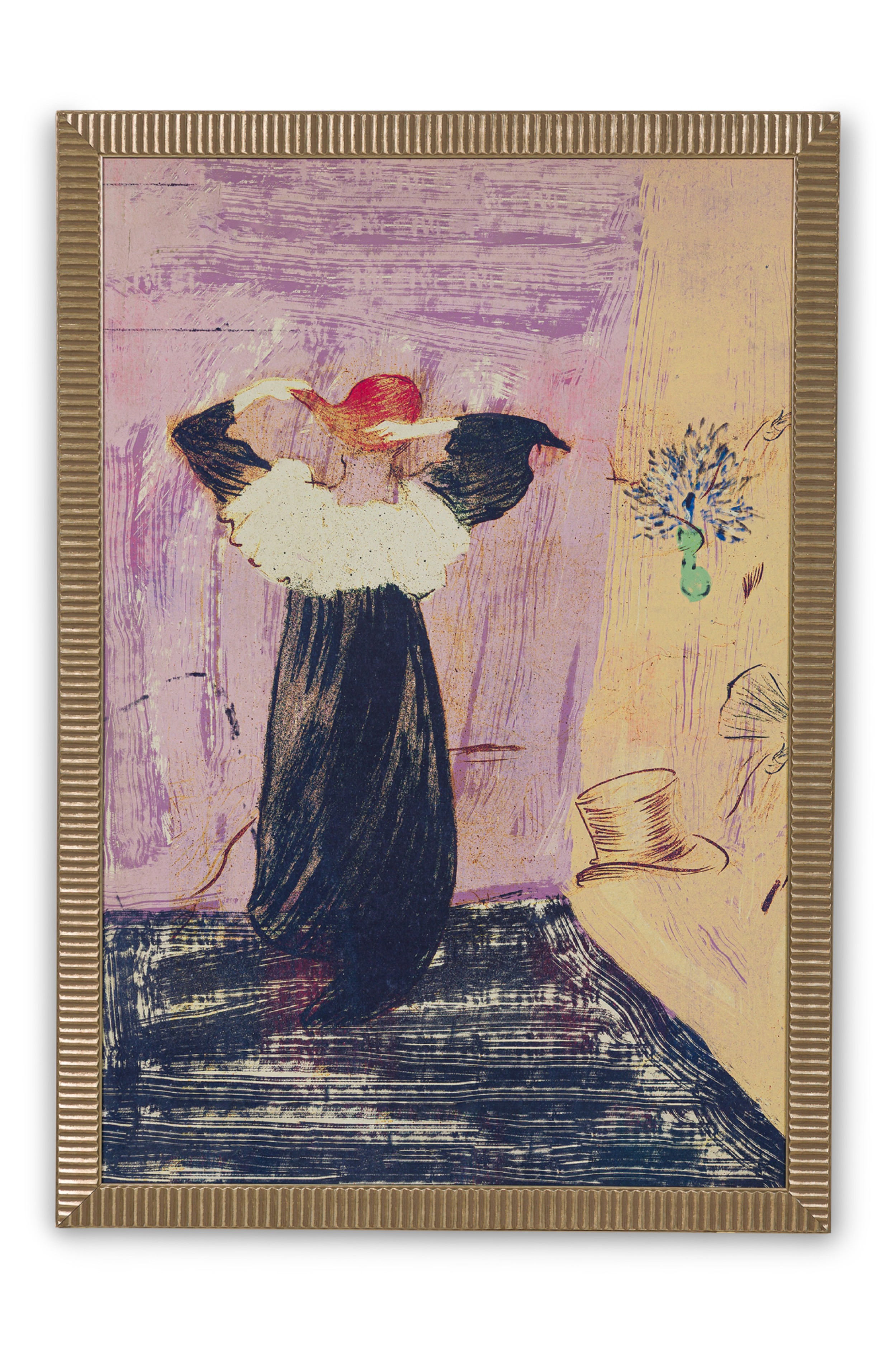 Post-Impressionism style abstract print of a woman in blue and white ruffled dress combing her hair in a bedroom setting with a floating vase and flat crowned top hat against a lilac and yellow background and framed with a fluted gold moulding