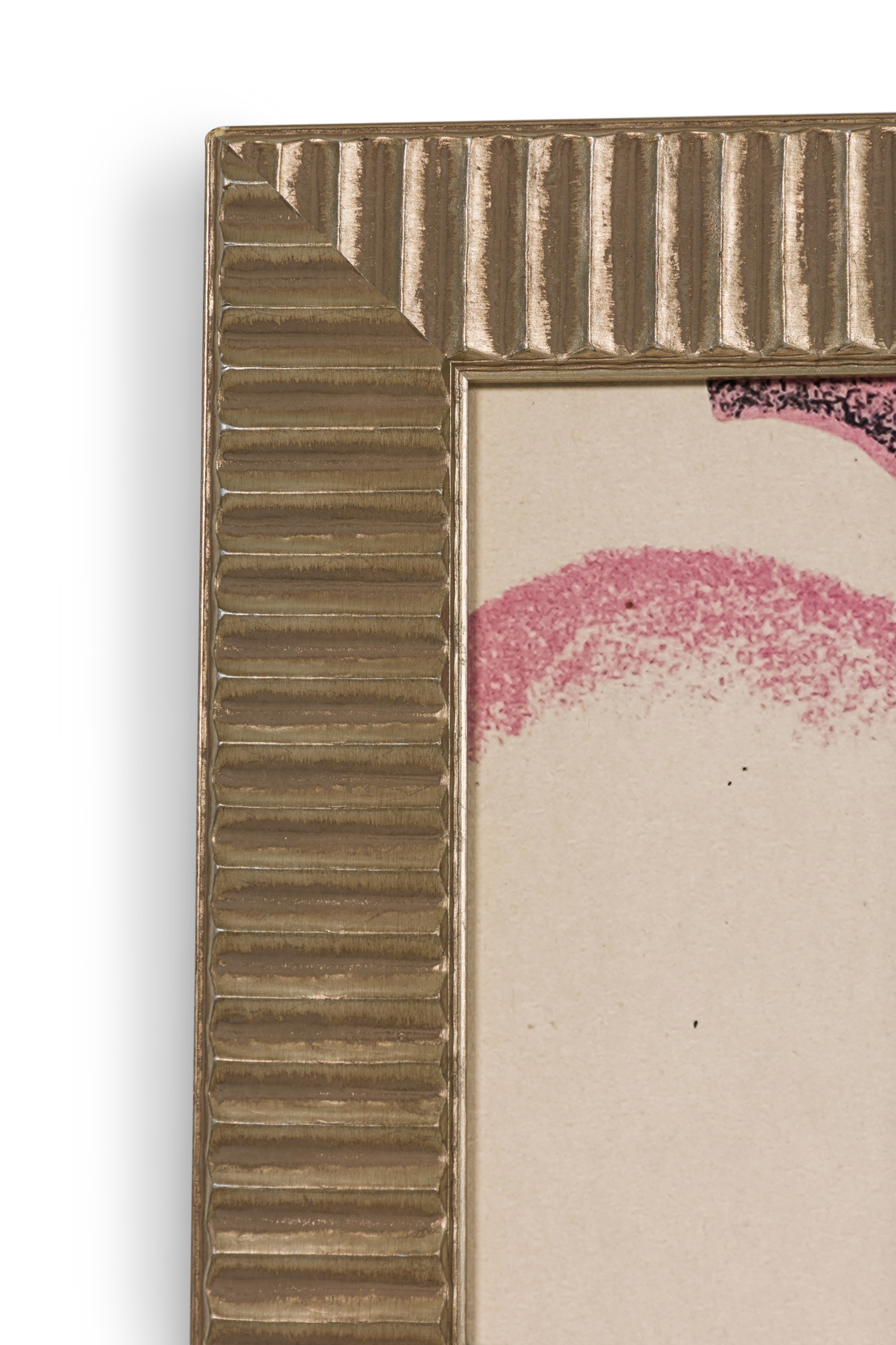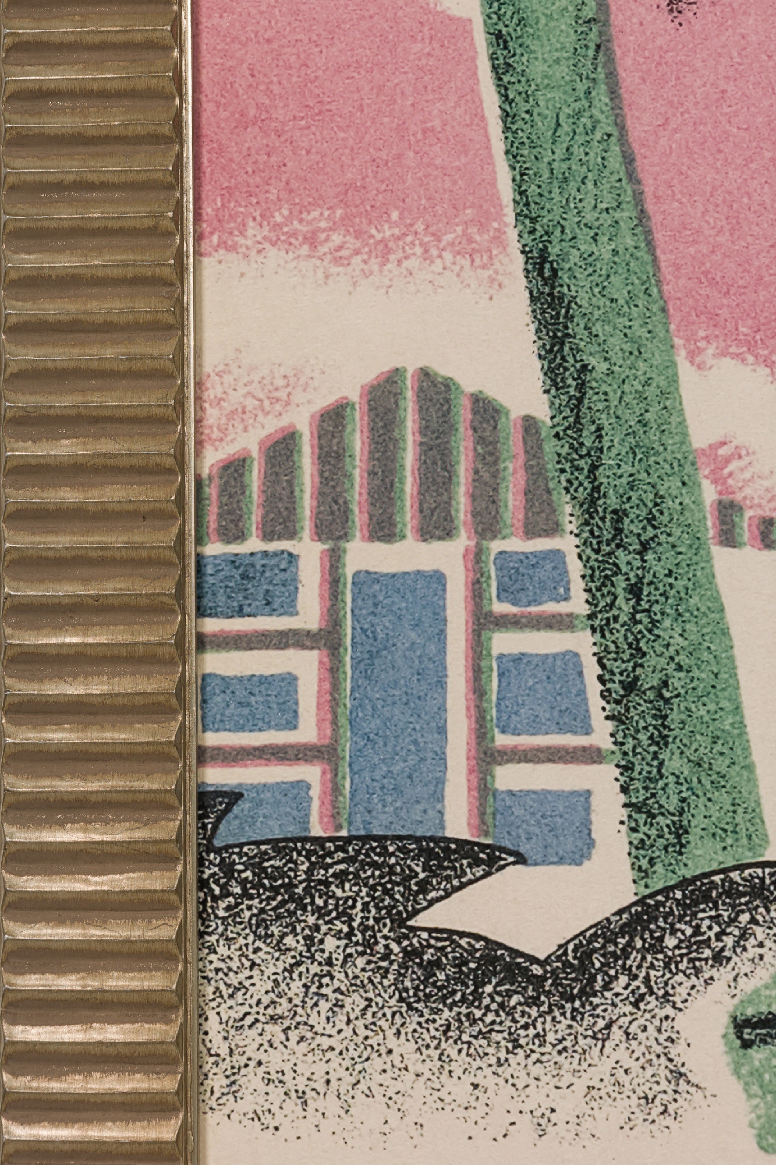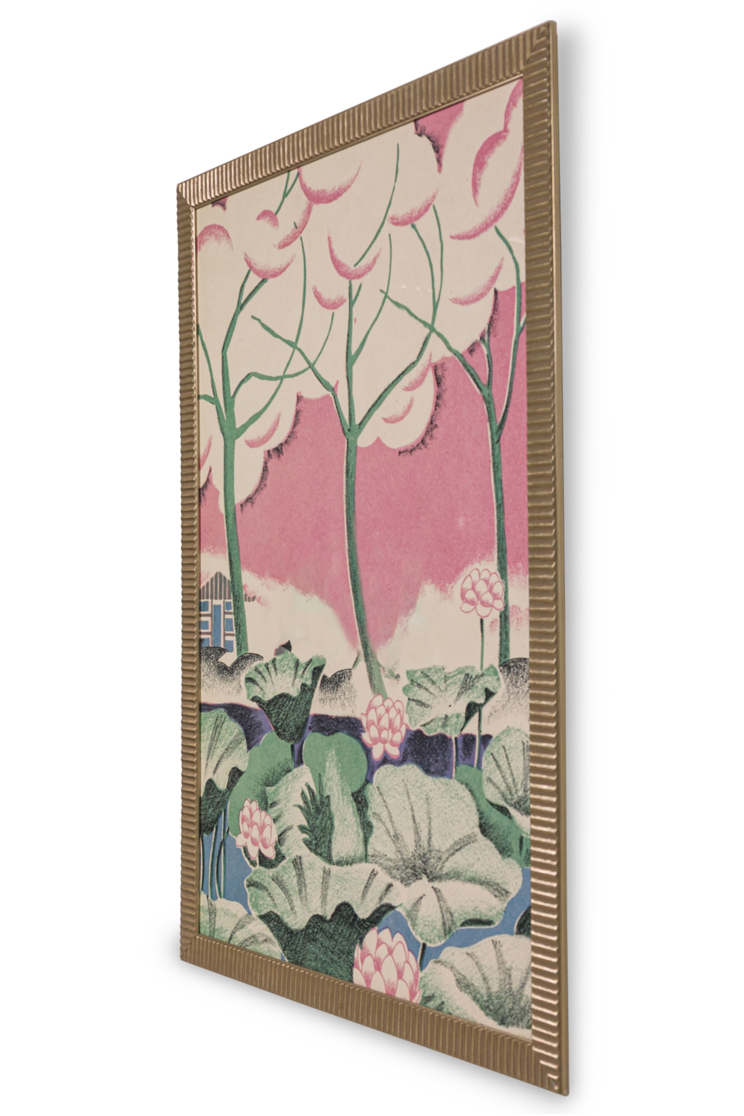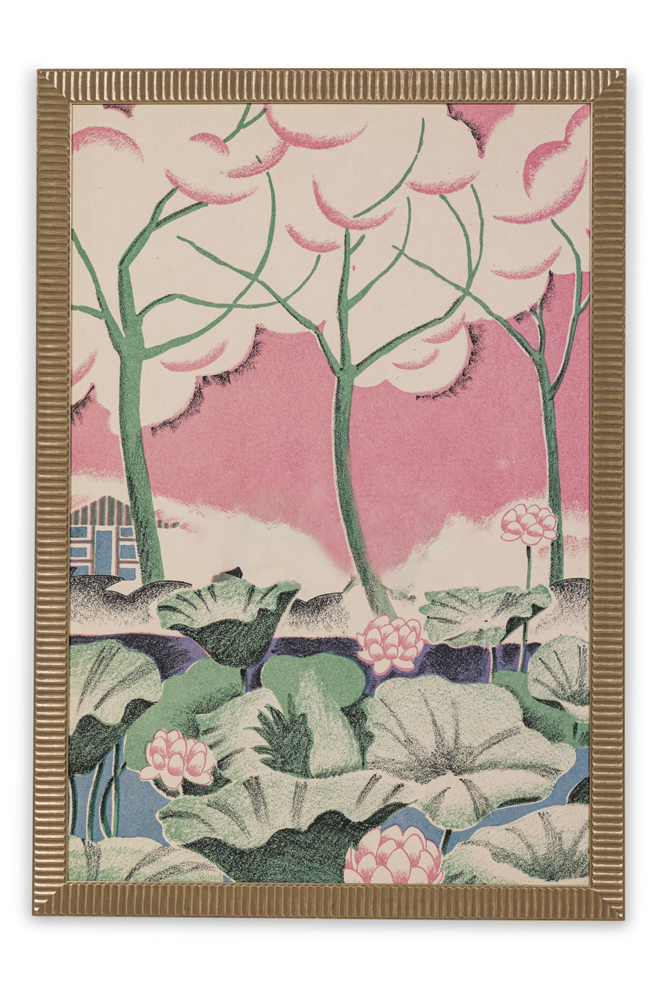 Post-Impressionism style abstract print of water lilies along a wooded riverbank with a small hut on the horizon against a pink clouded sky and framed with a fluted gold moulding (Smaller version: NWL8332)