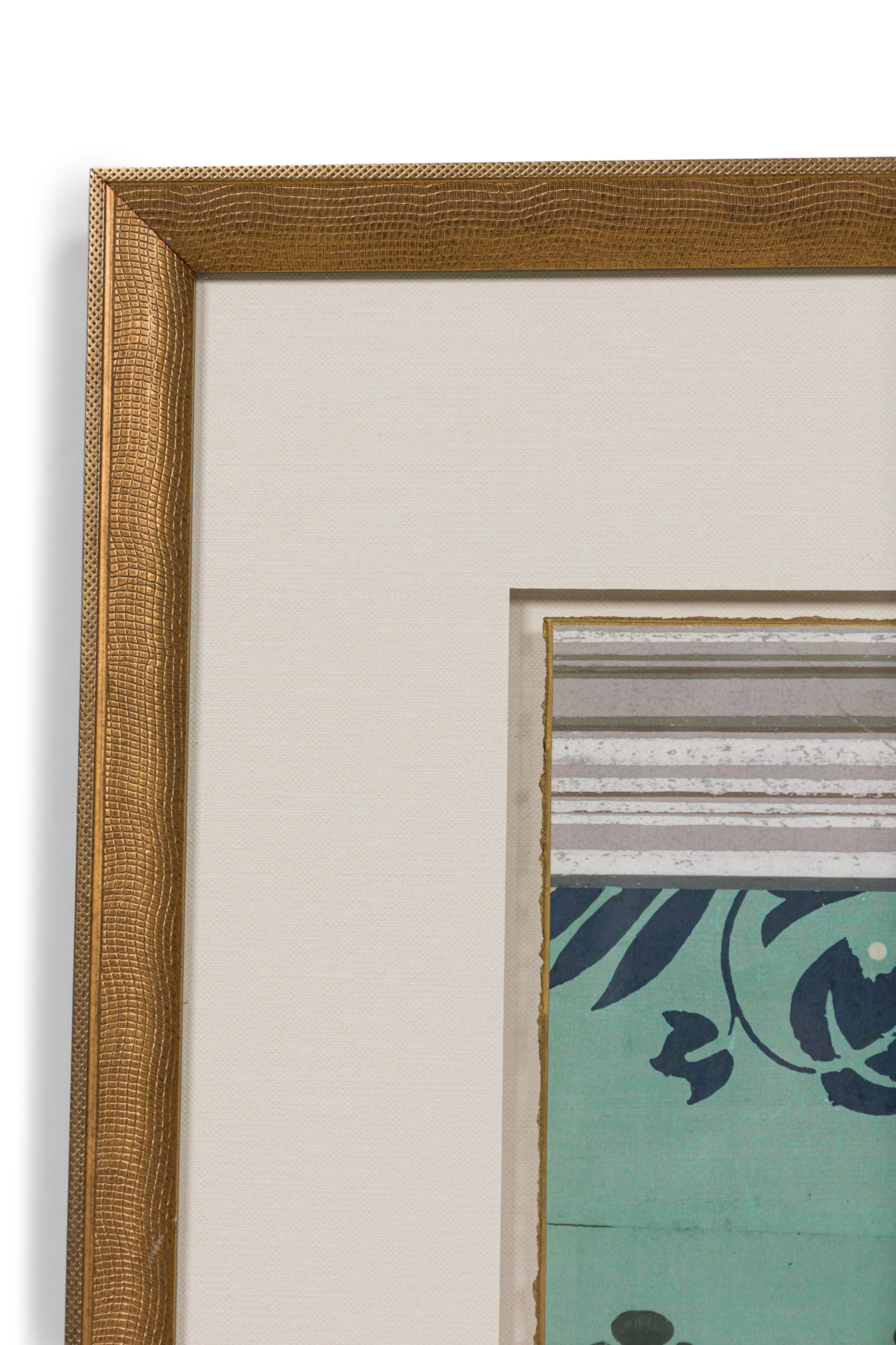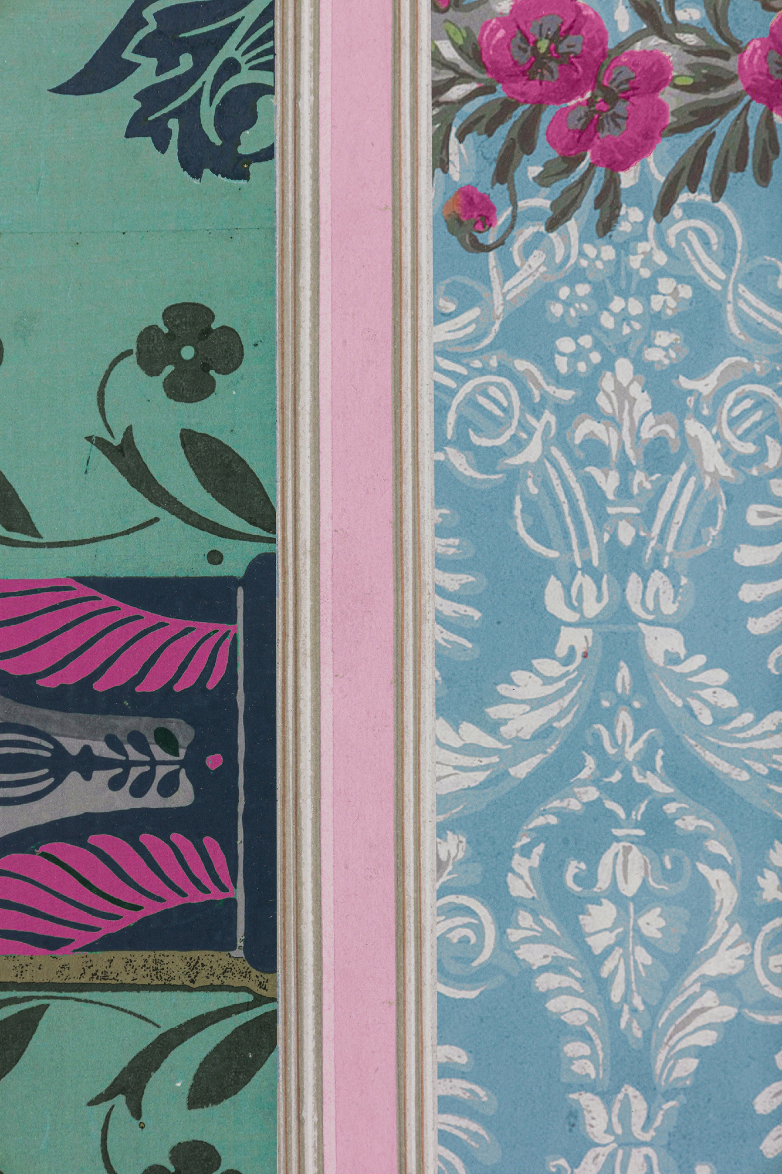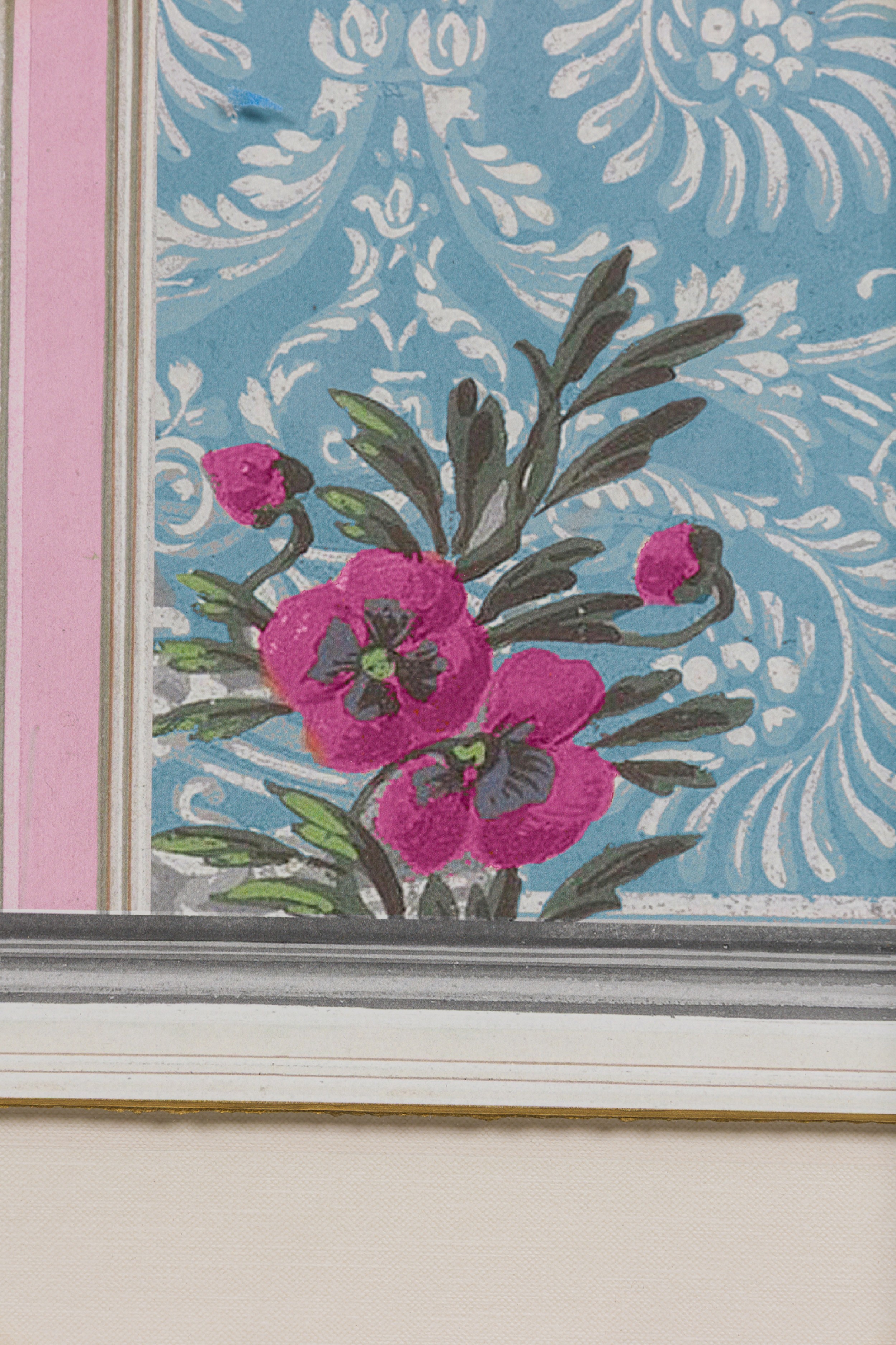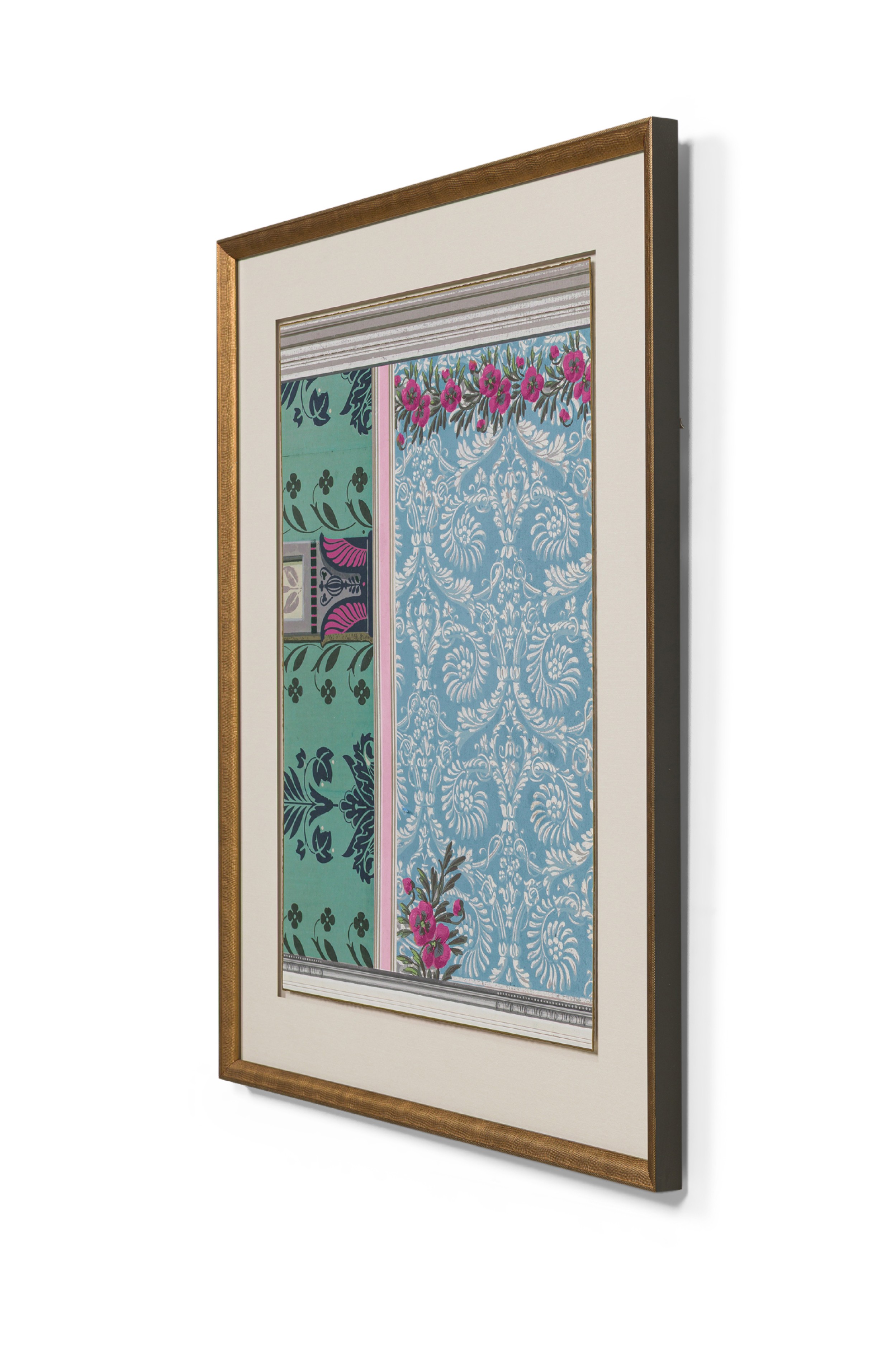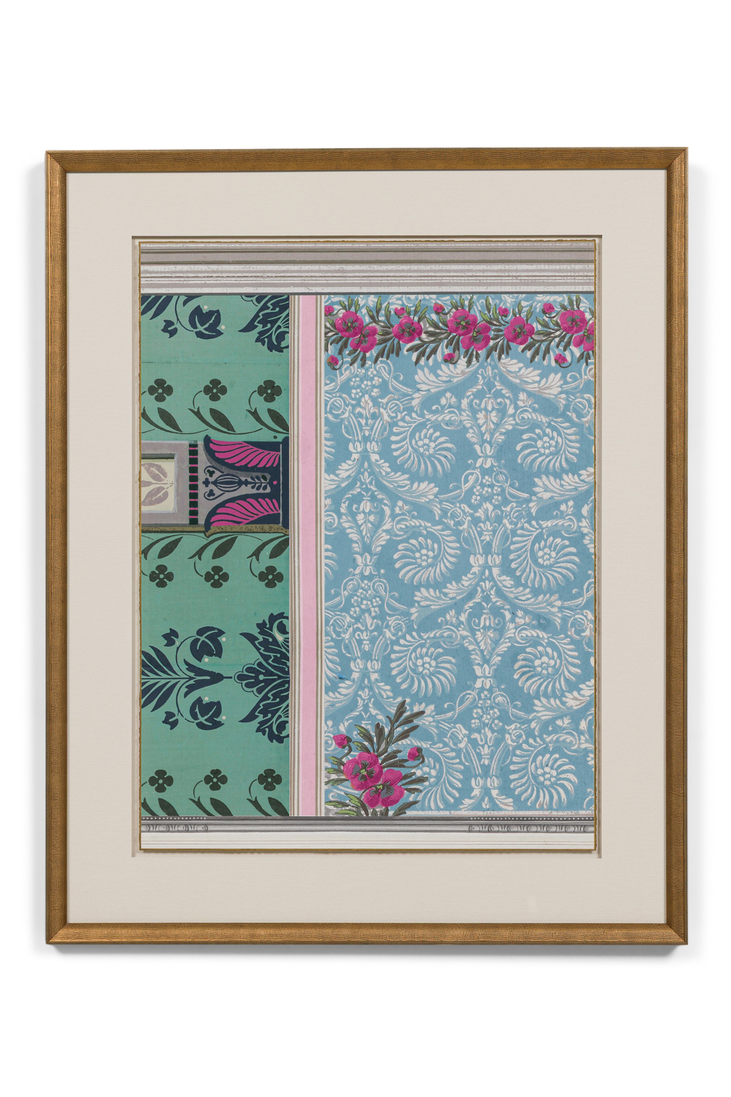 Framed print of a decorative wallpaper design, featuring intricate blue and green floral patterns with fuchsia botanical accents. Displayed in a light gold frame with a white matte.
