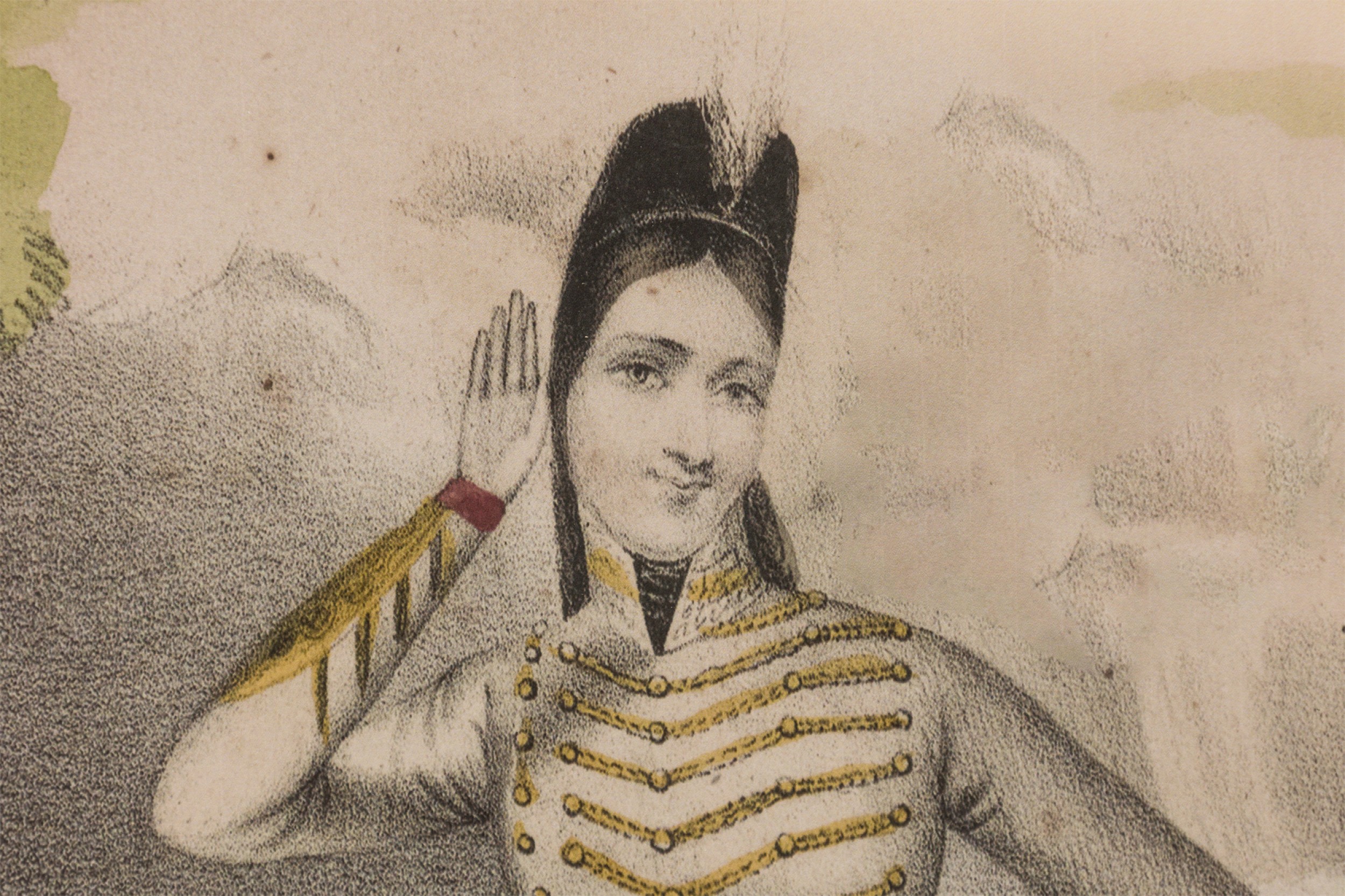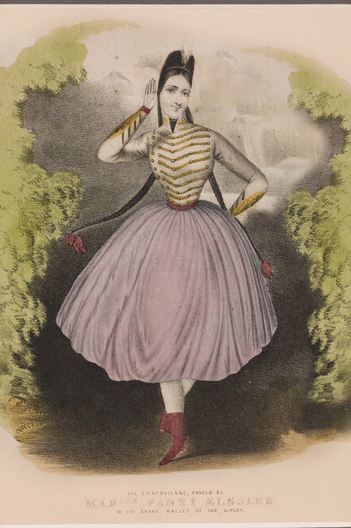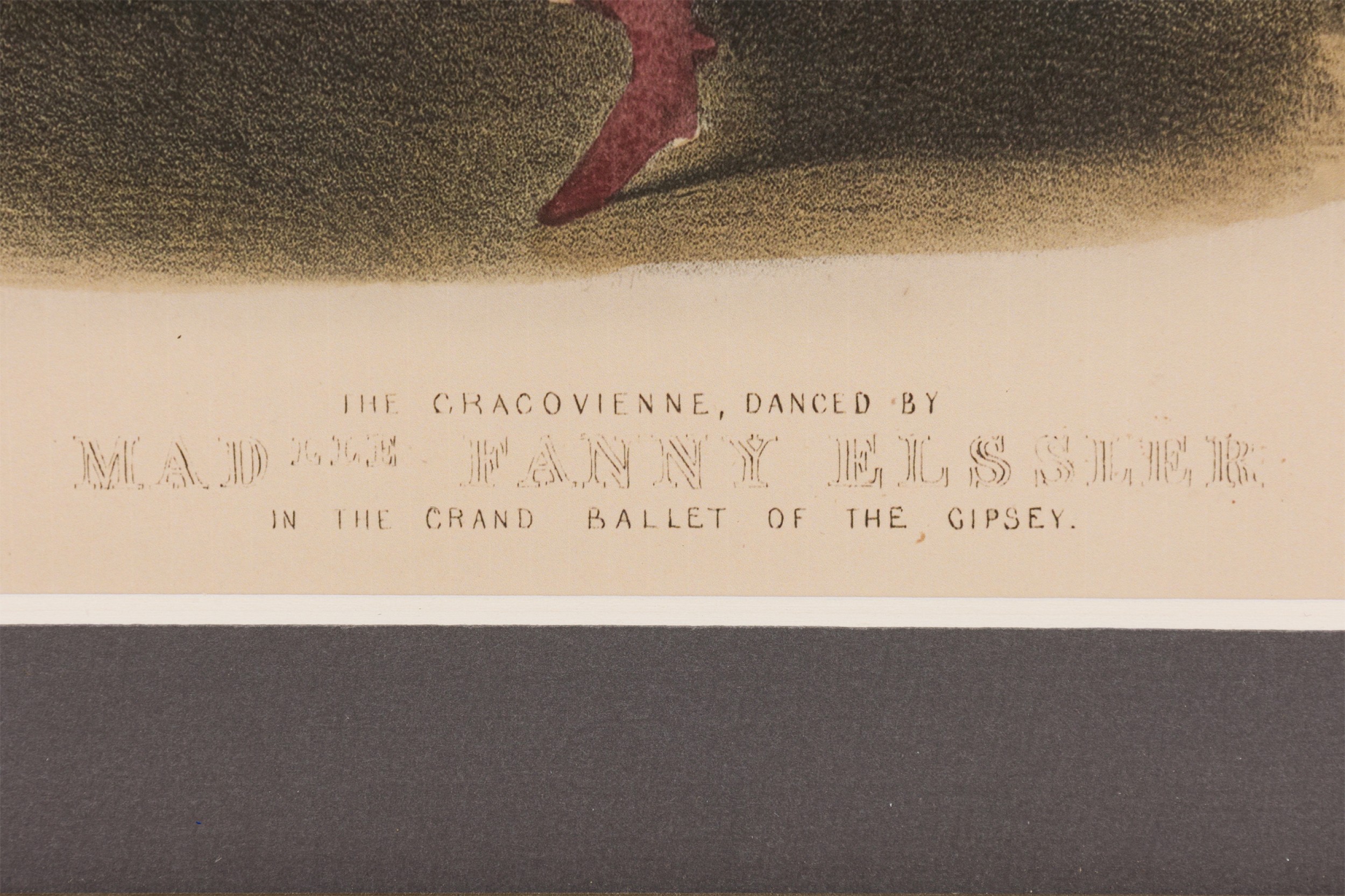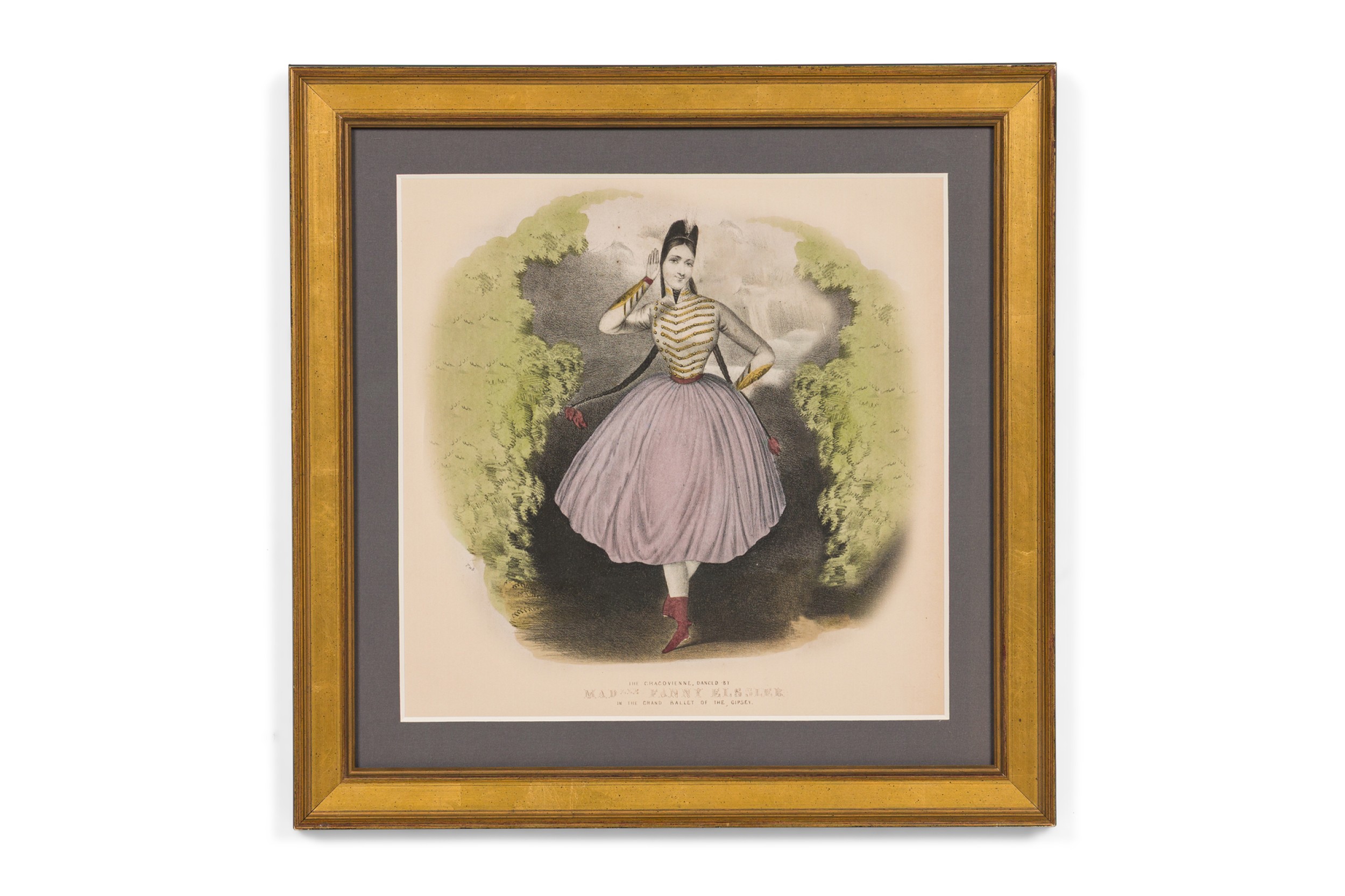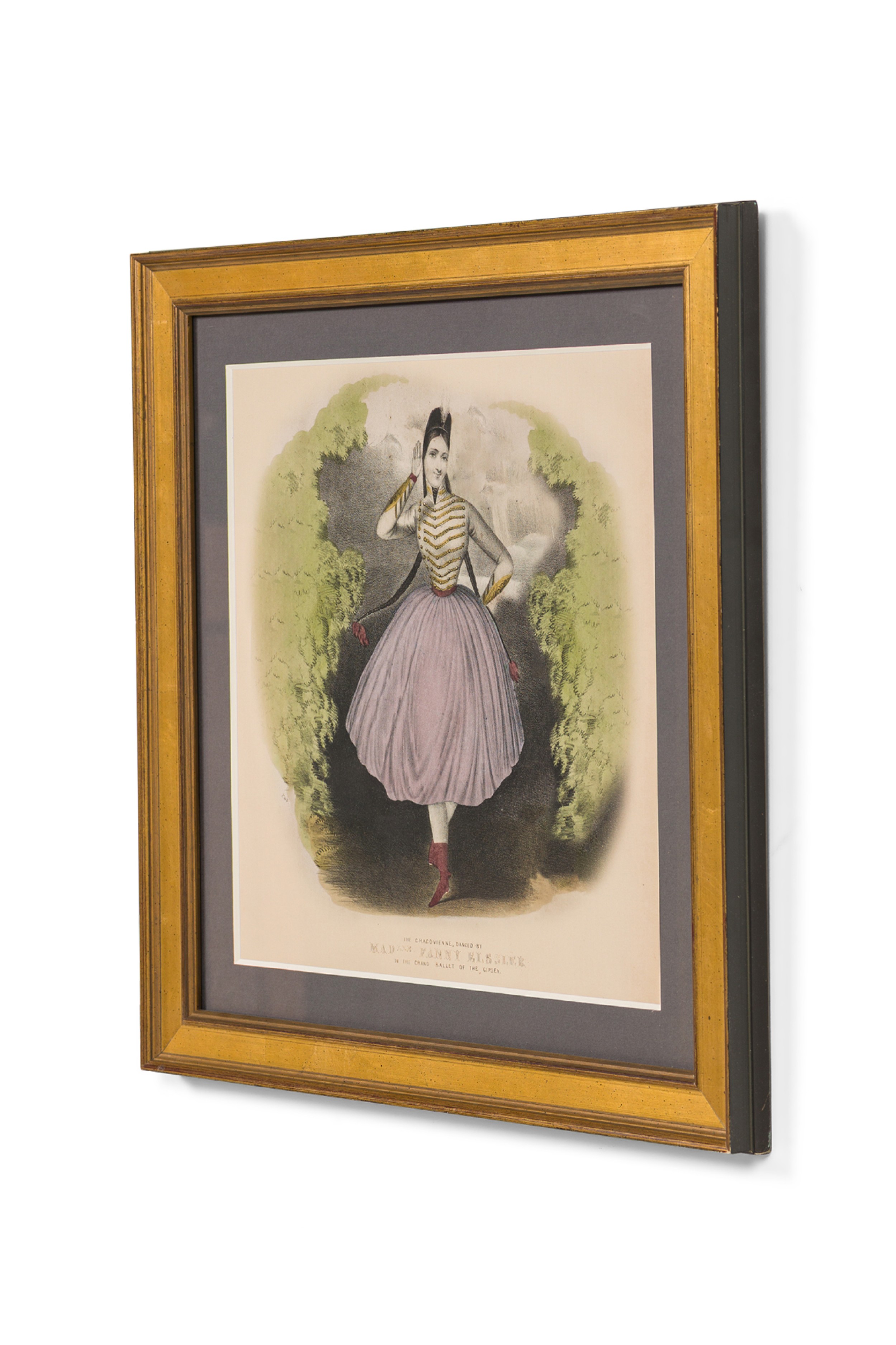 Framed print of a 19th-century hand-colored lithograph titled The Championess, depicting Mademoiselle Fanny Elssler in a theatrical ballet costume. She stands in a dramatic pose with one hand to her ear, framed by a garden backdrop. Displayed in a gilt wood frame with a gray matte.