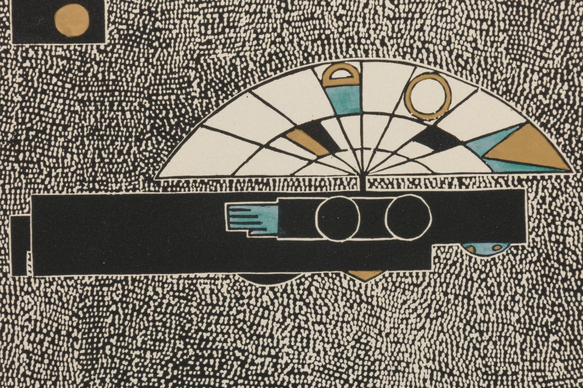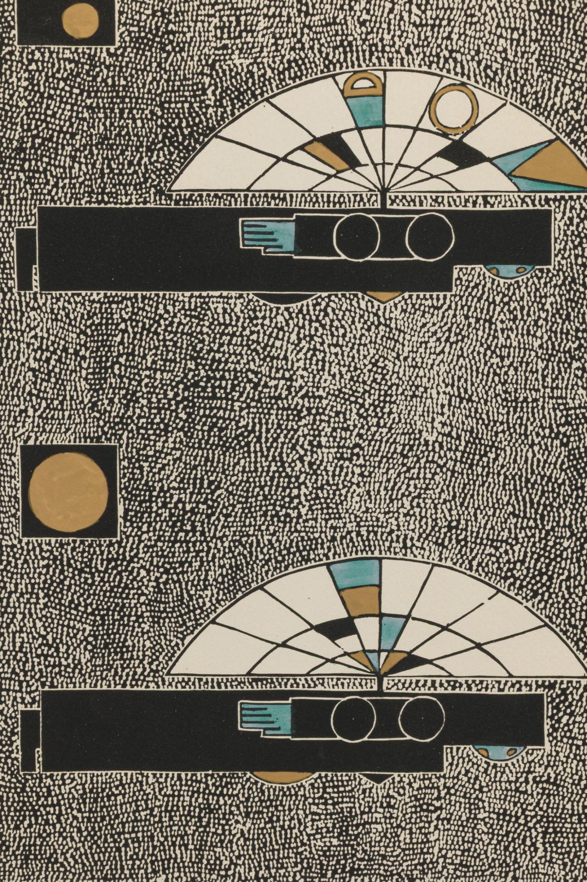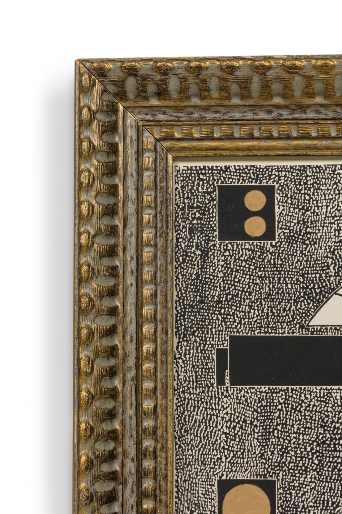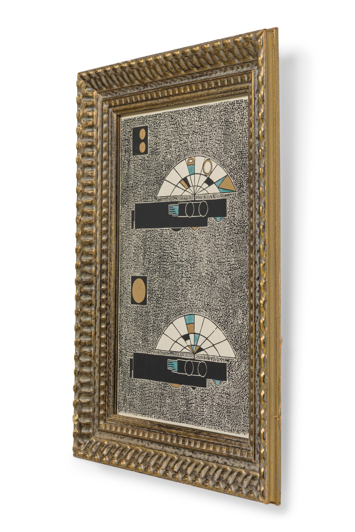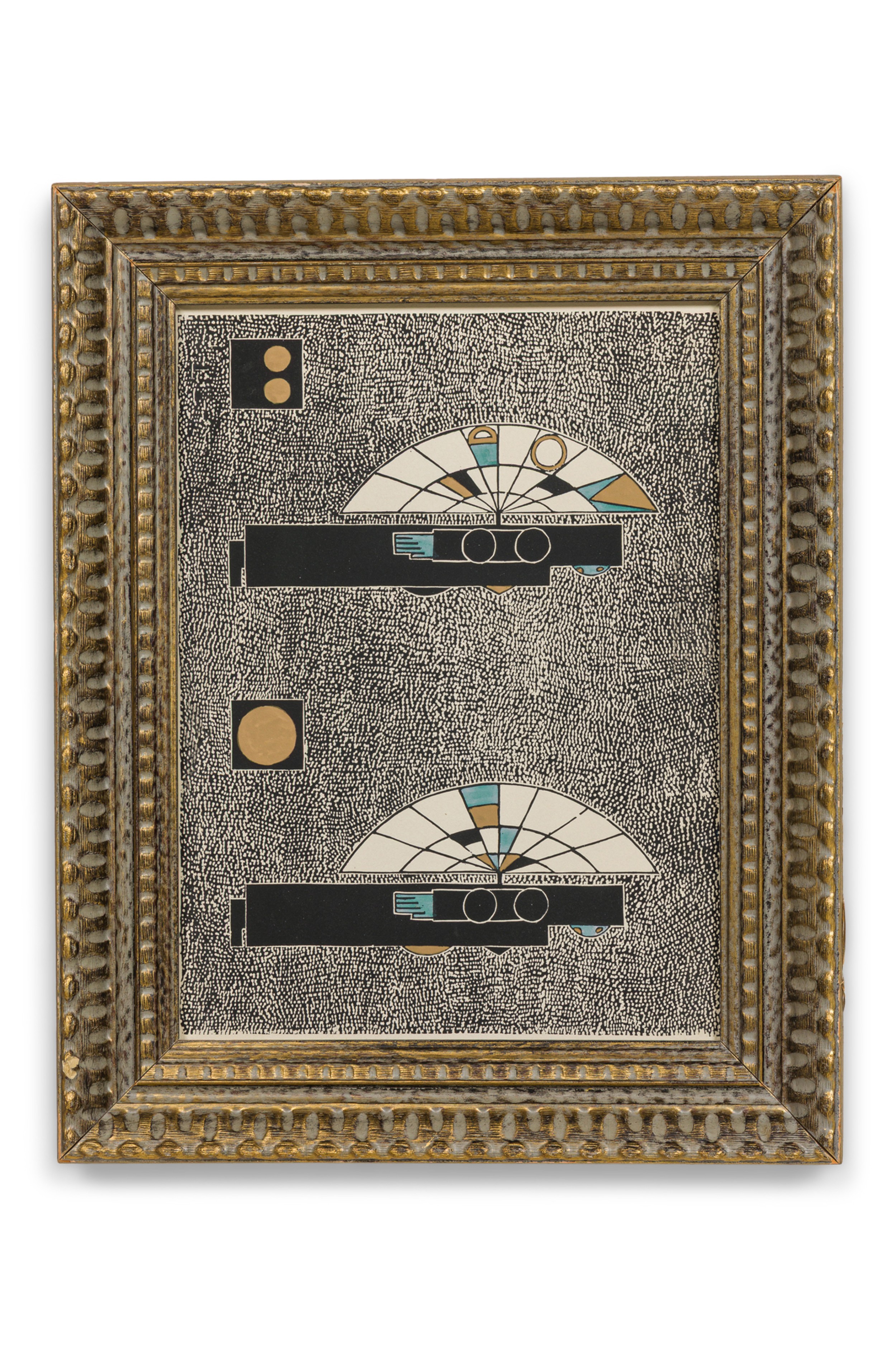 Framed print of a geometric abstract composition featuring two symmetrical, fan-like forms with stylized linear and circular elements in black, gold, teal, and cream. Set against a densely stippled black-and-white background. Displayed in a deeply carved, gilded wood frame with a vintage patina.