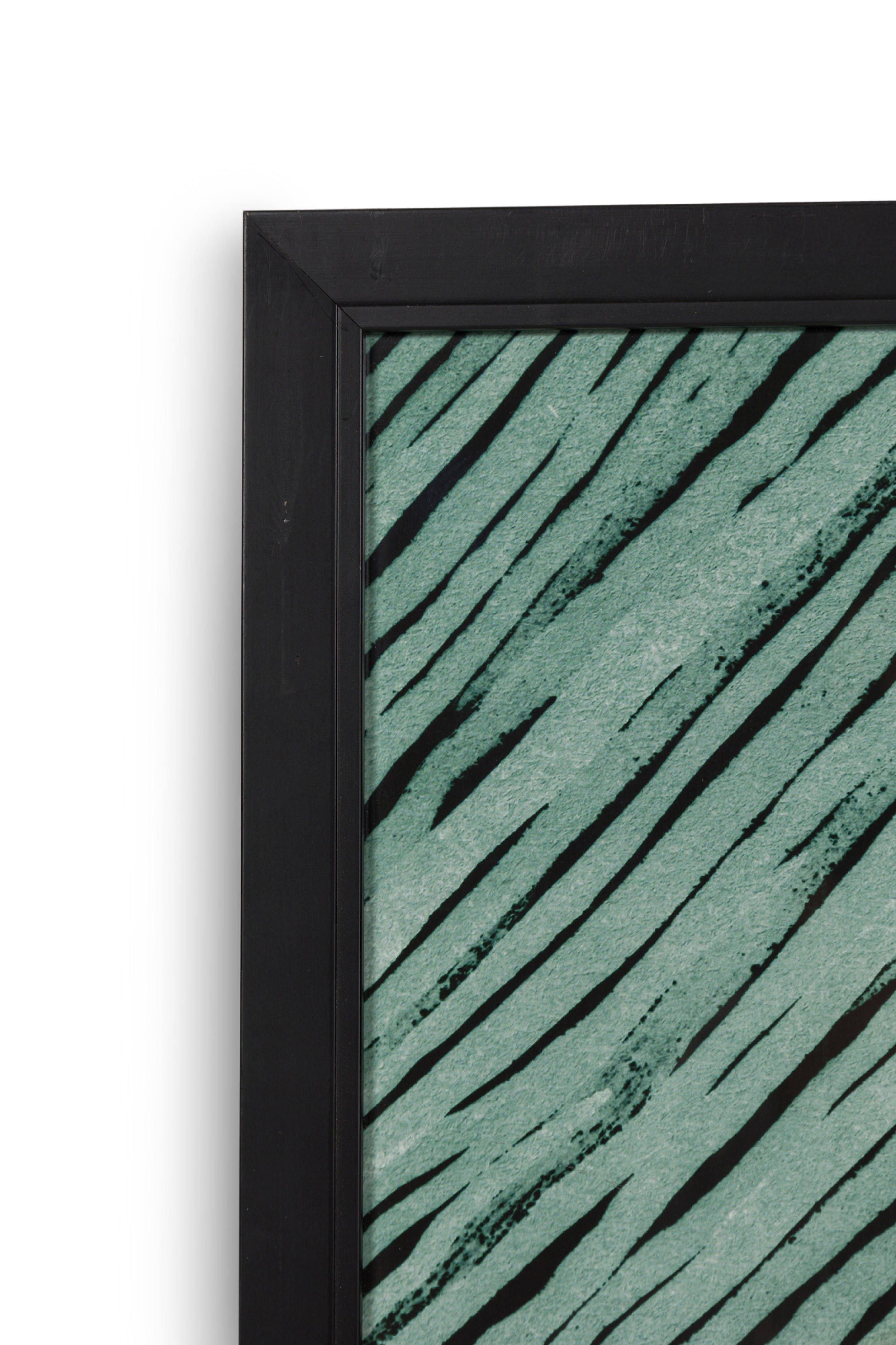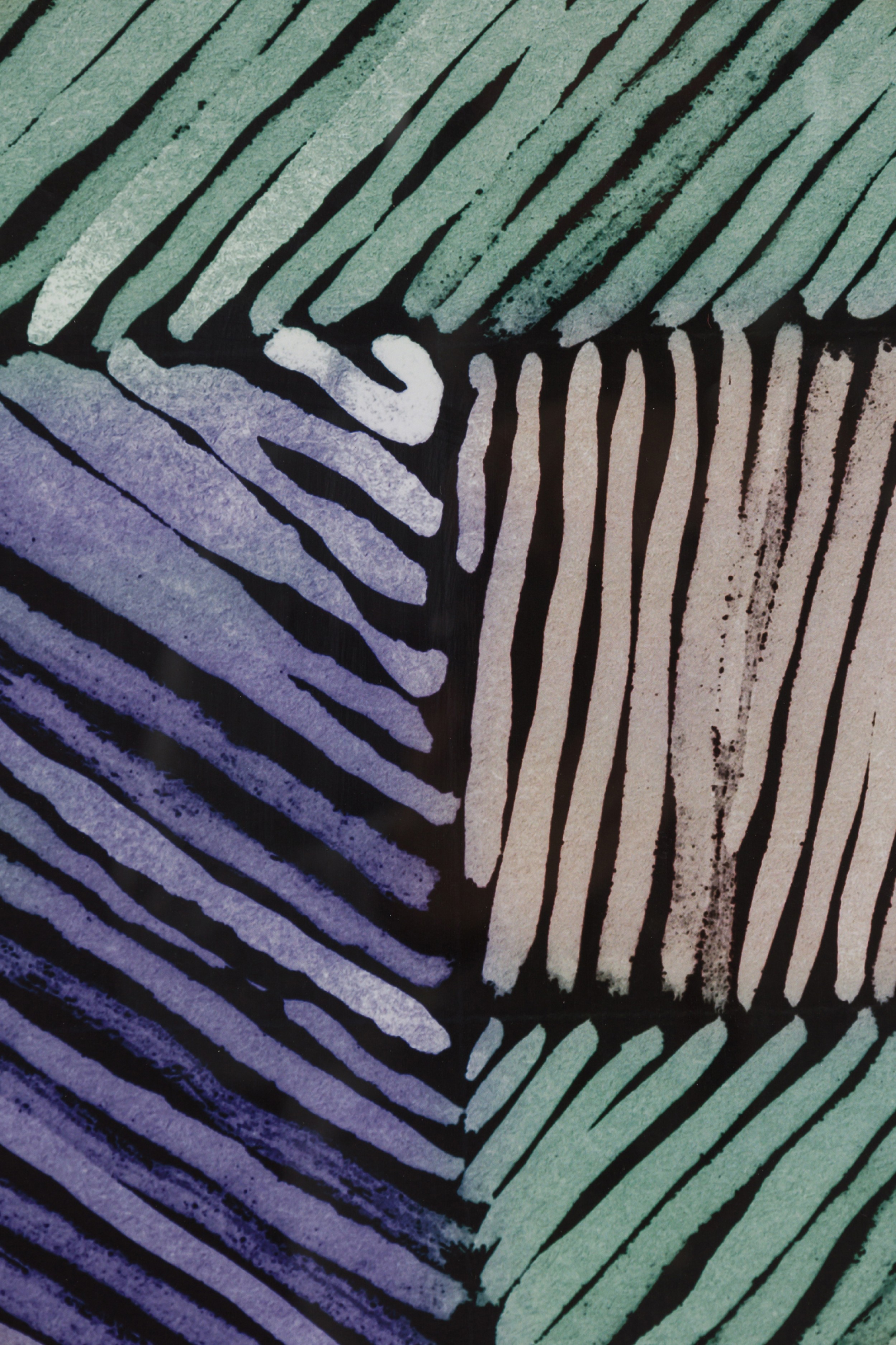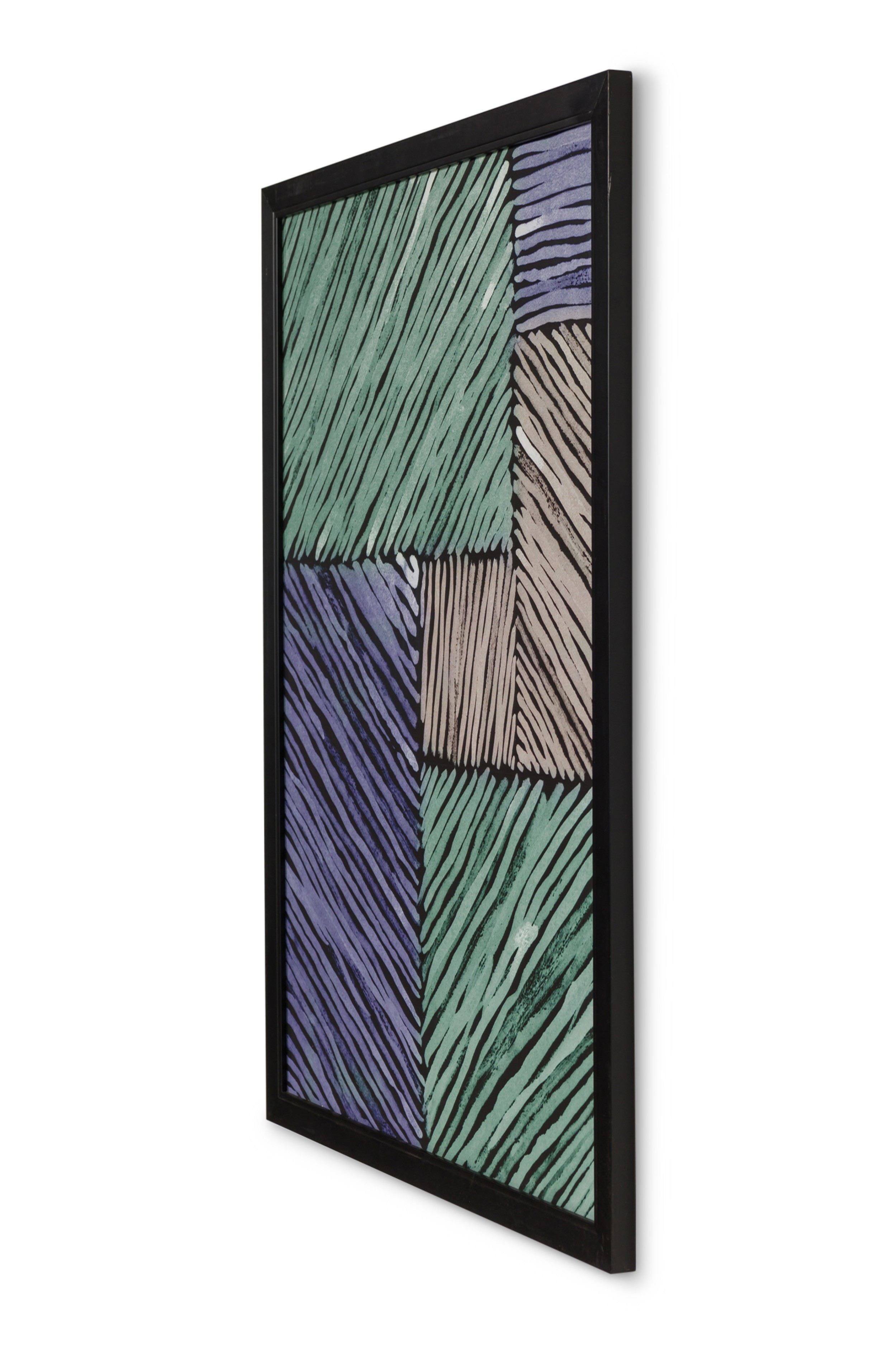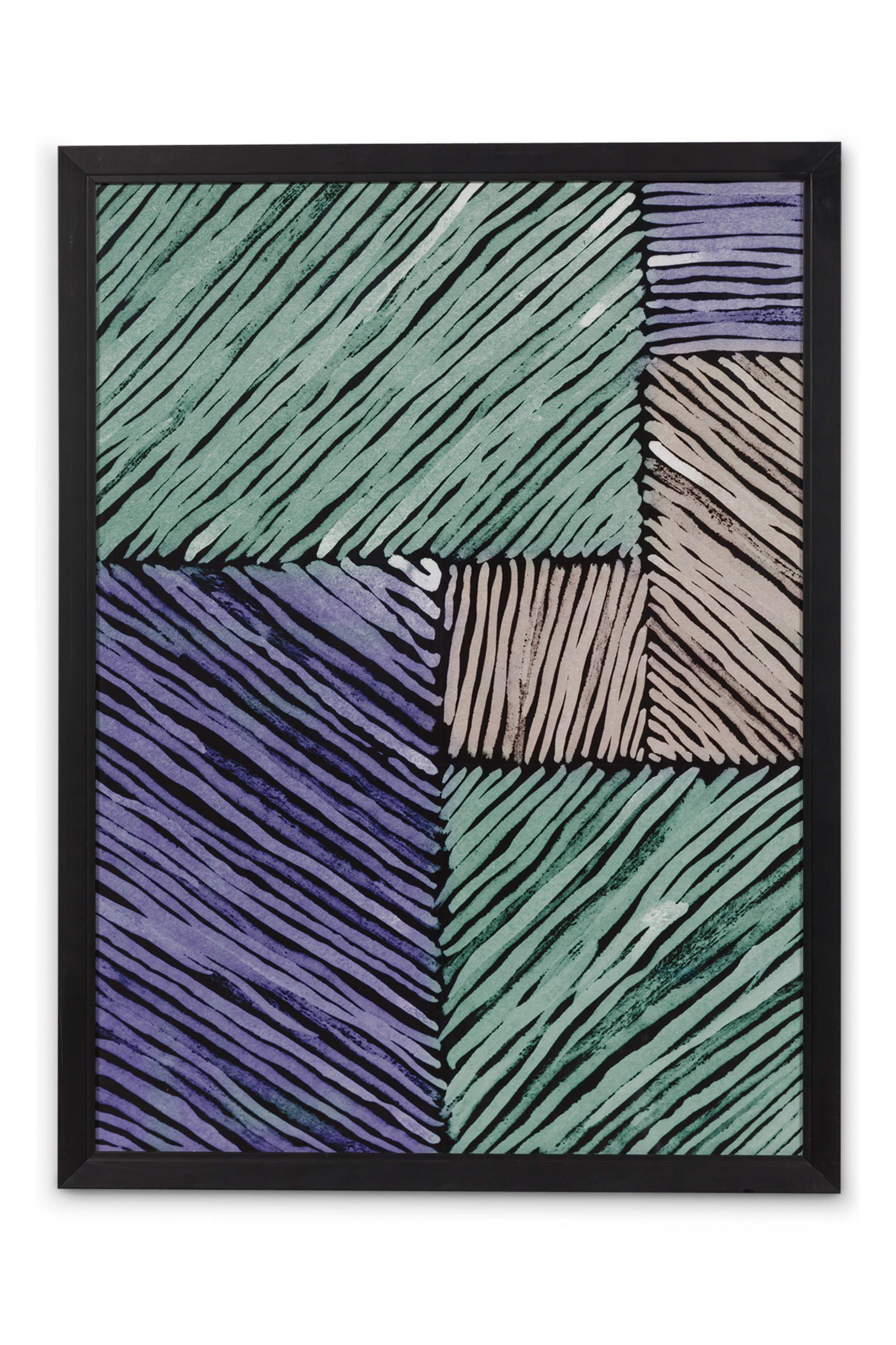 Framed print of an abstract painting composed of overlapping blocks of diagonal lines in green, lavender, and deep blue, rendered in a geometric pattern with expressionist brushwork in a black frame.