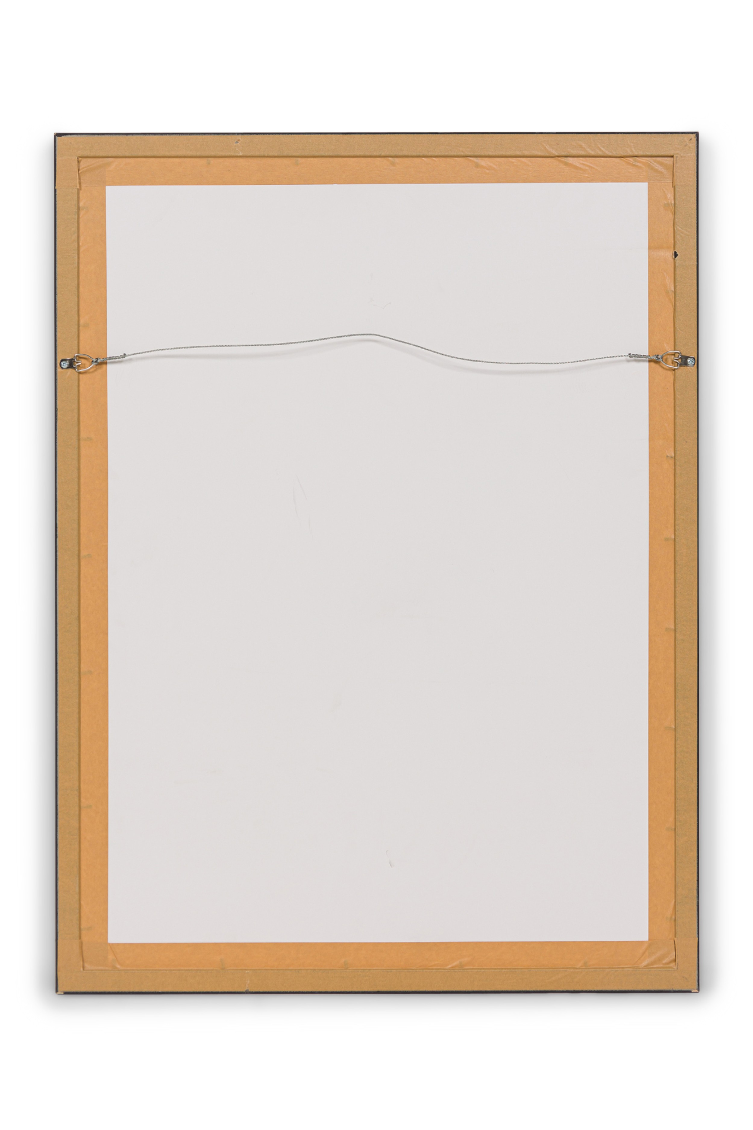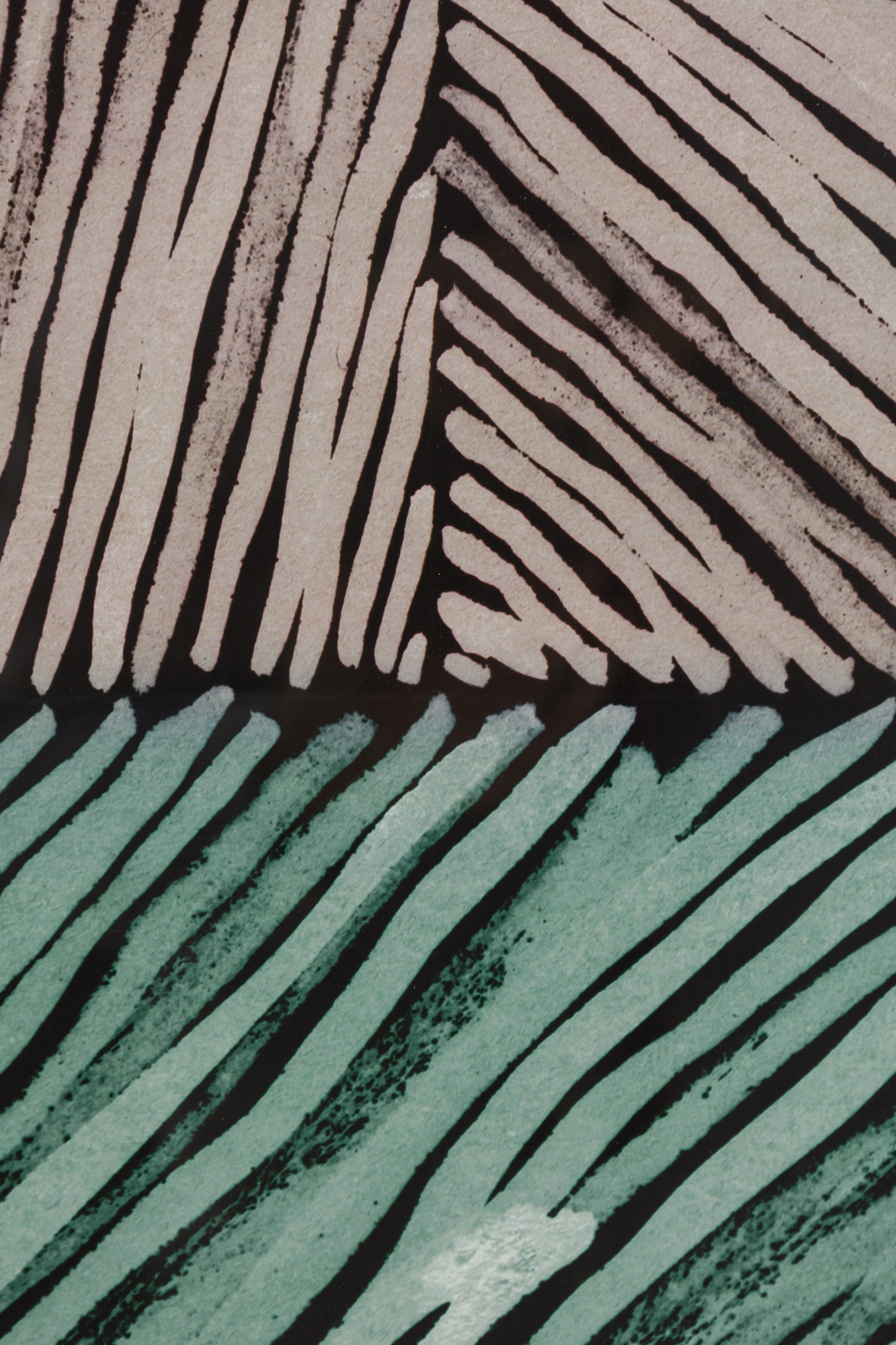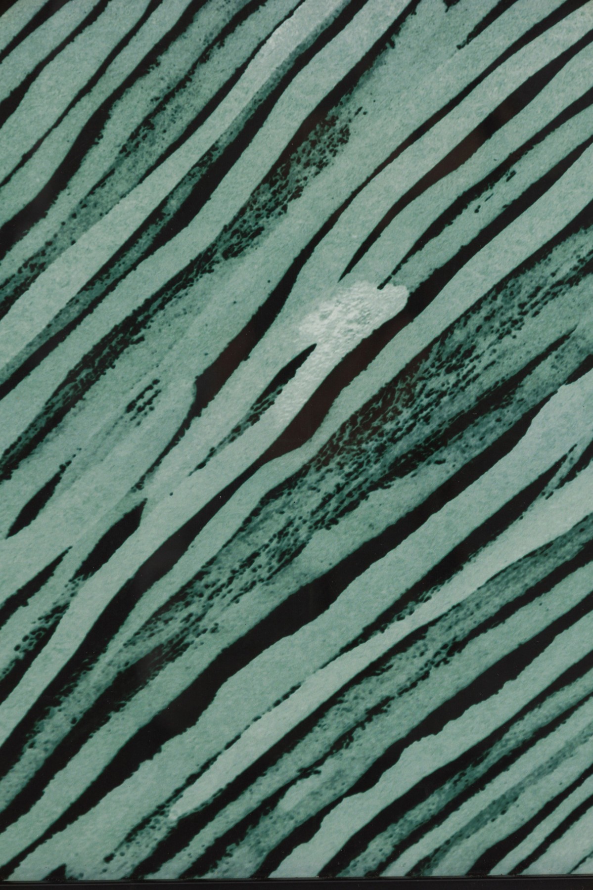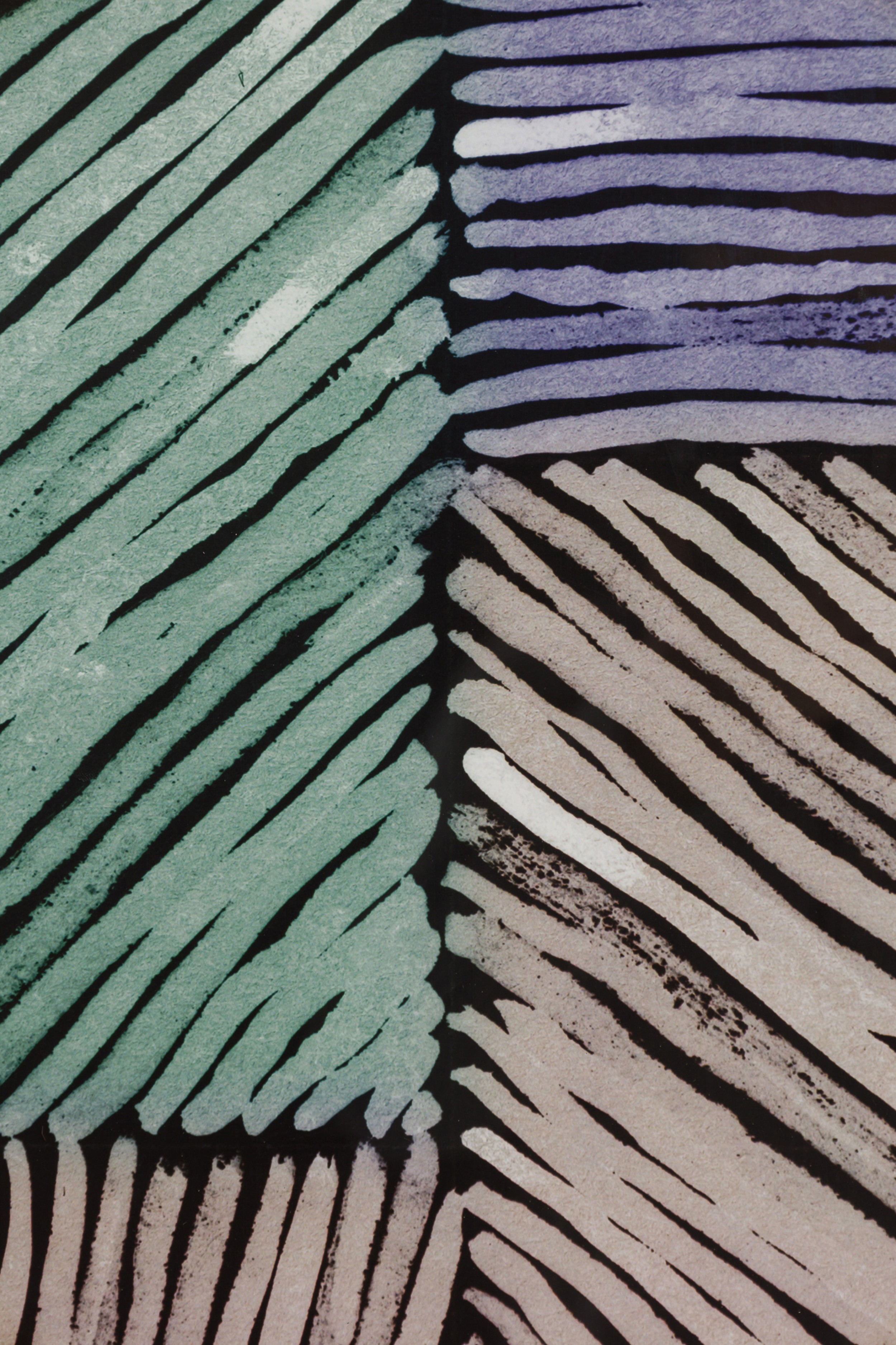 Framed print of an abstract painting composed of overlapping blocks of diagonal lines in green, lavender, and deep blue, rendered in a geometric pattern with expressionist brushwork in a black frame.