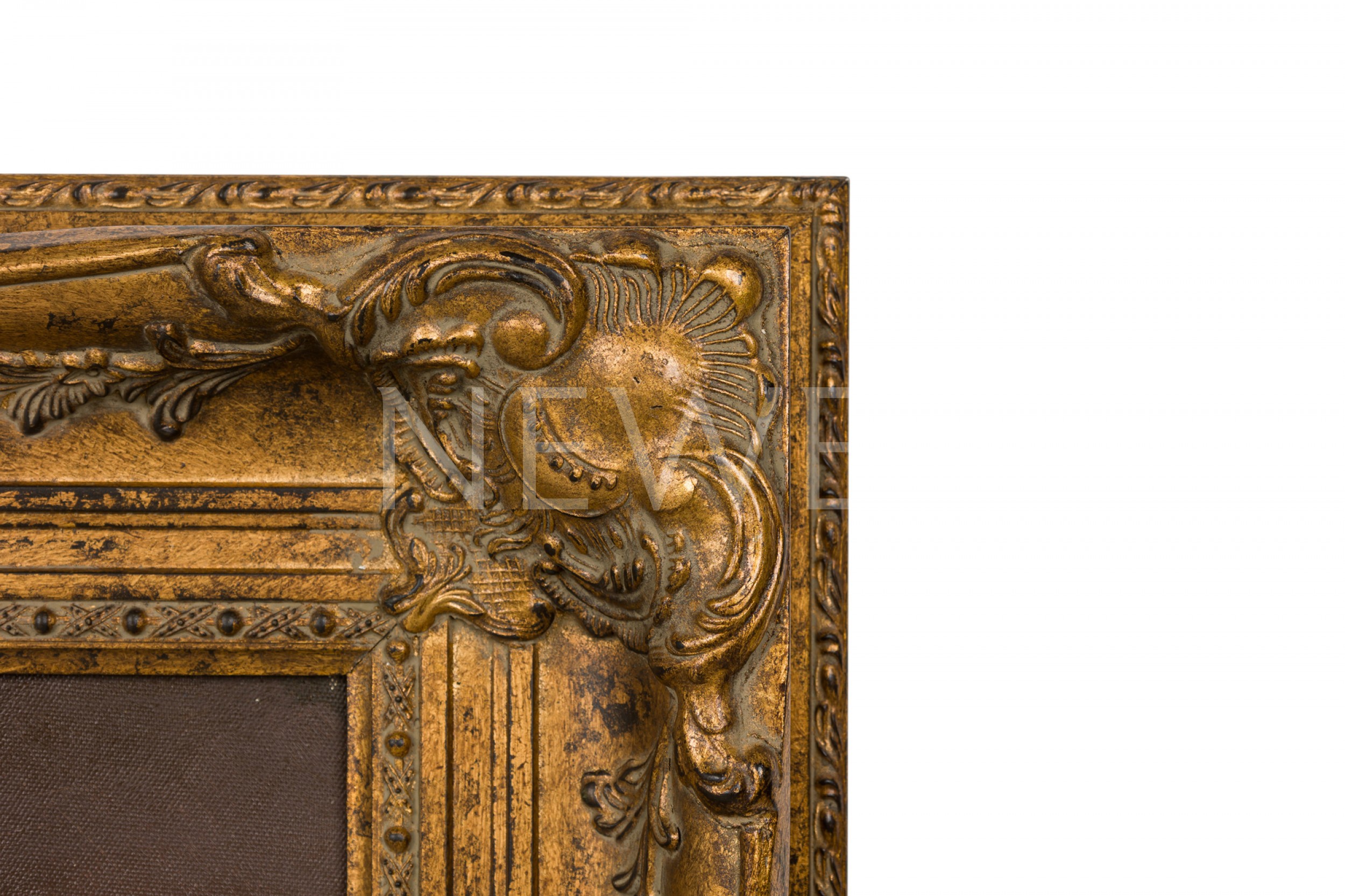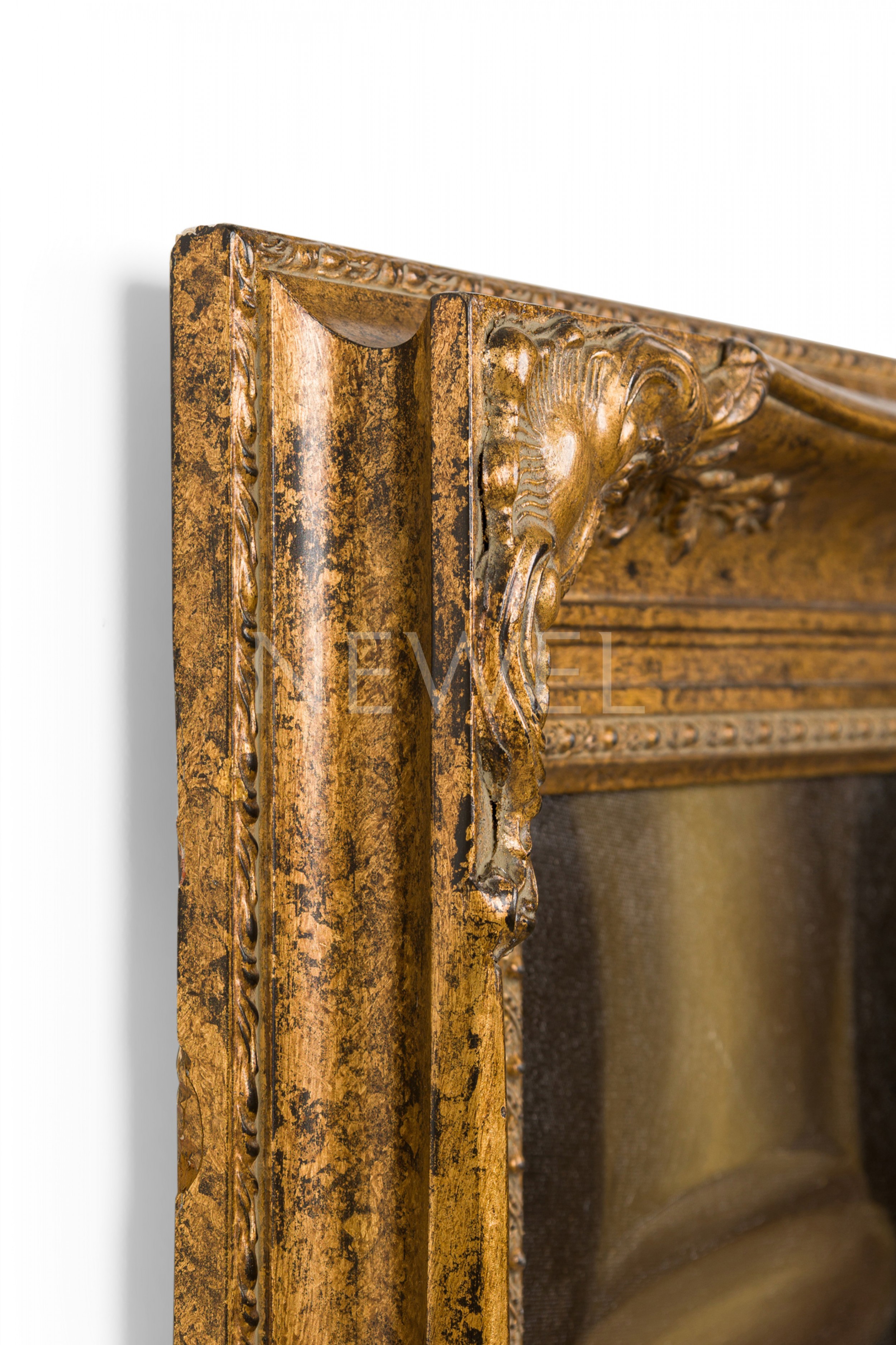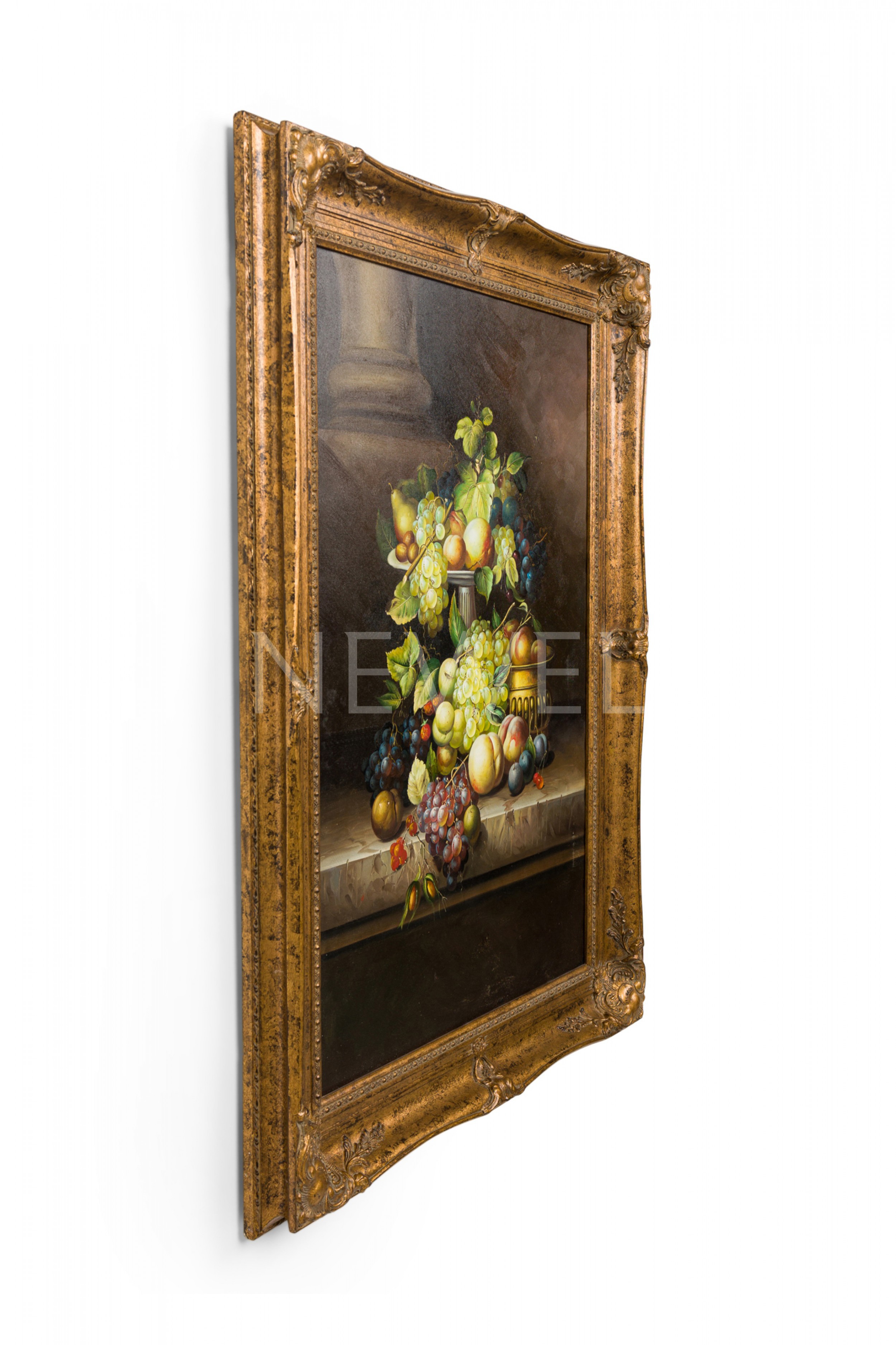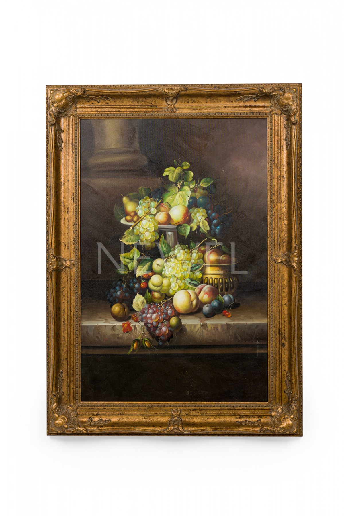 Mid-Century Dutch-style still life centerpiece of cascading fruit with adjacent gilt bowl resting on a table top with shadowed column behind, painted in robust oils on canvas mounted in an elaborate, high relief textured gilt wood frame.