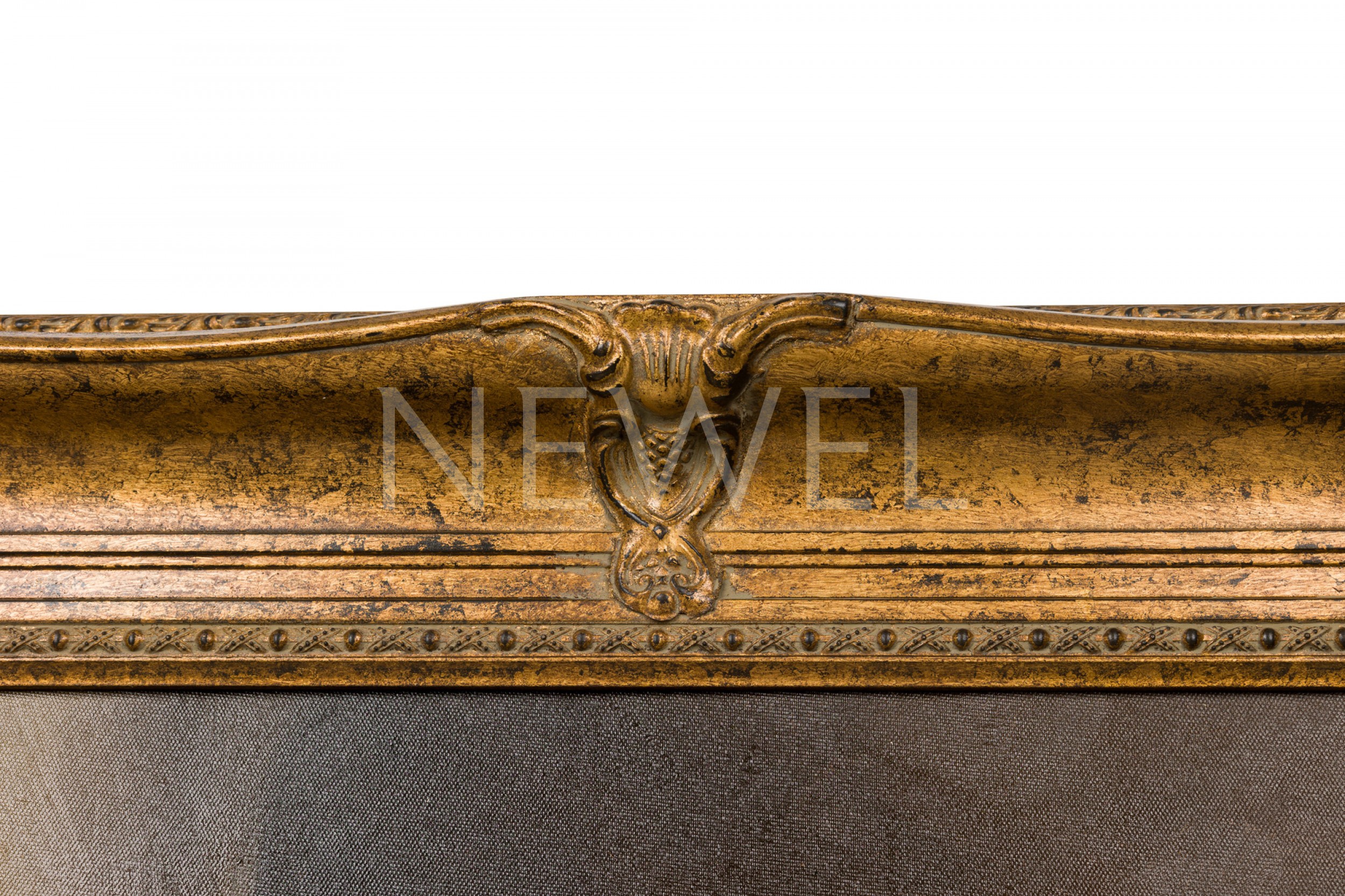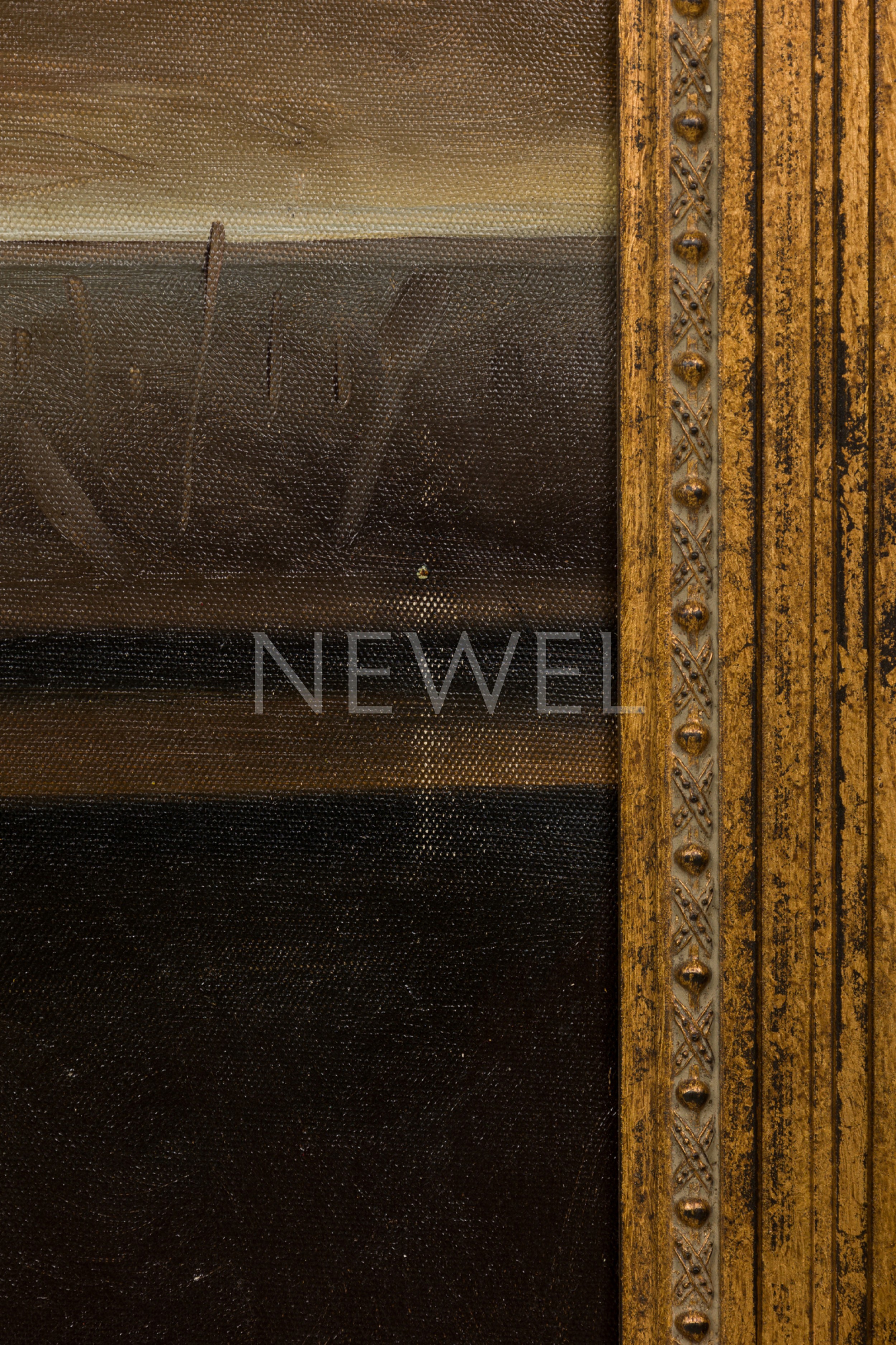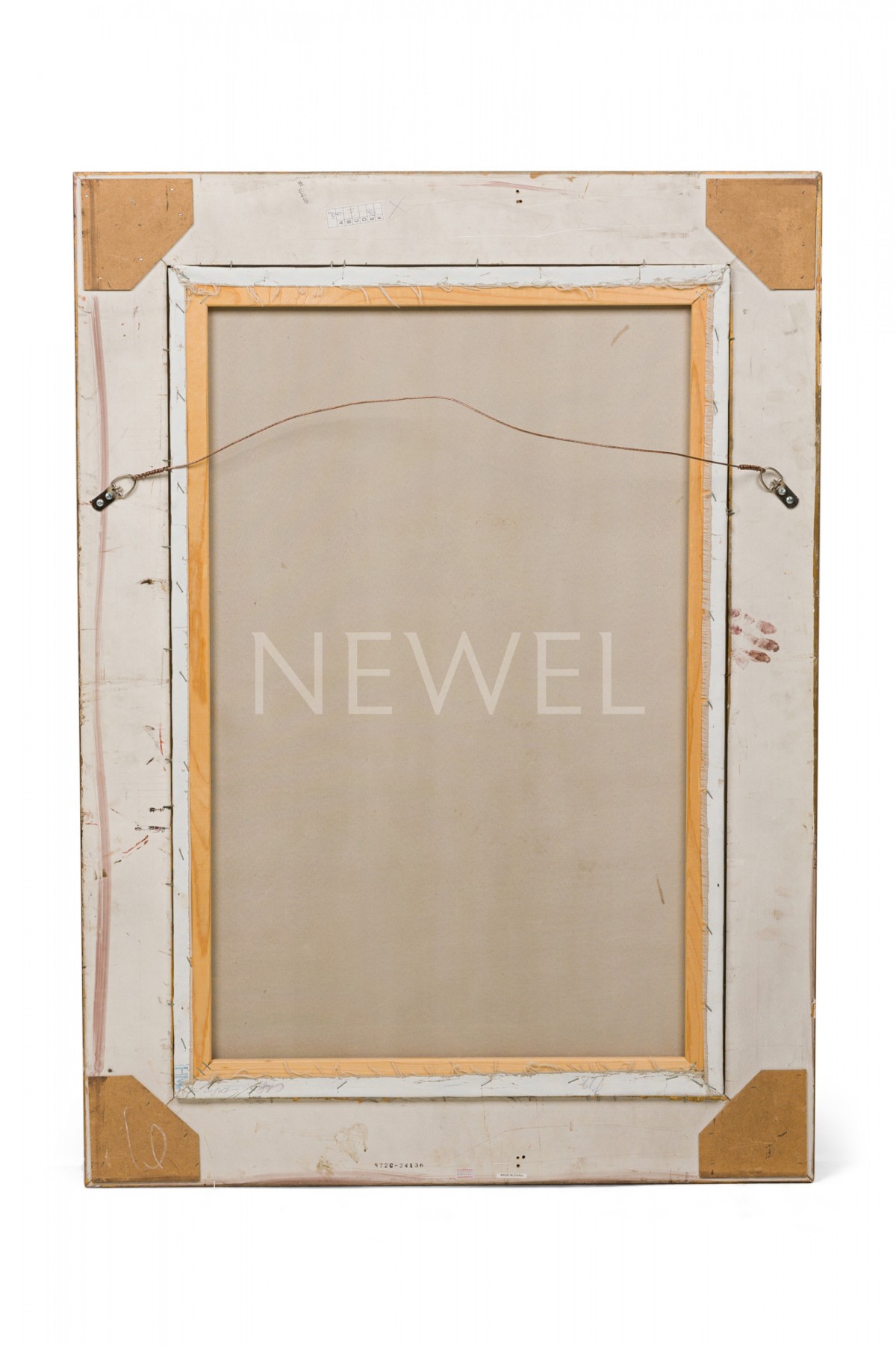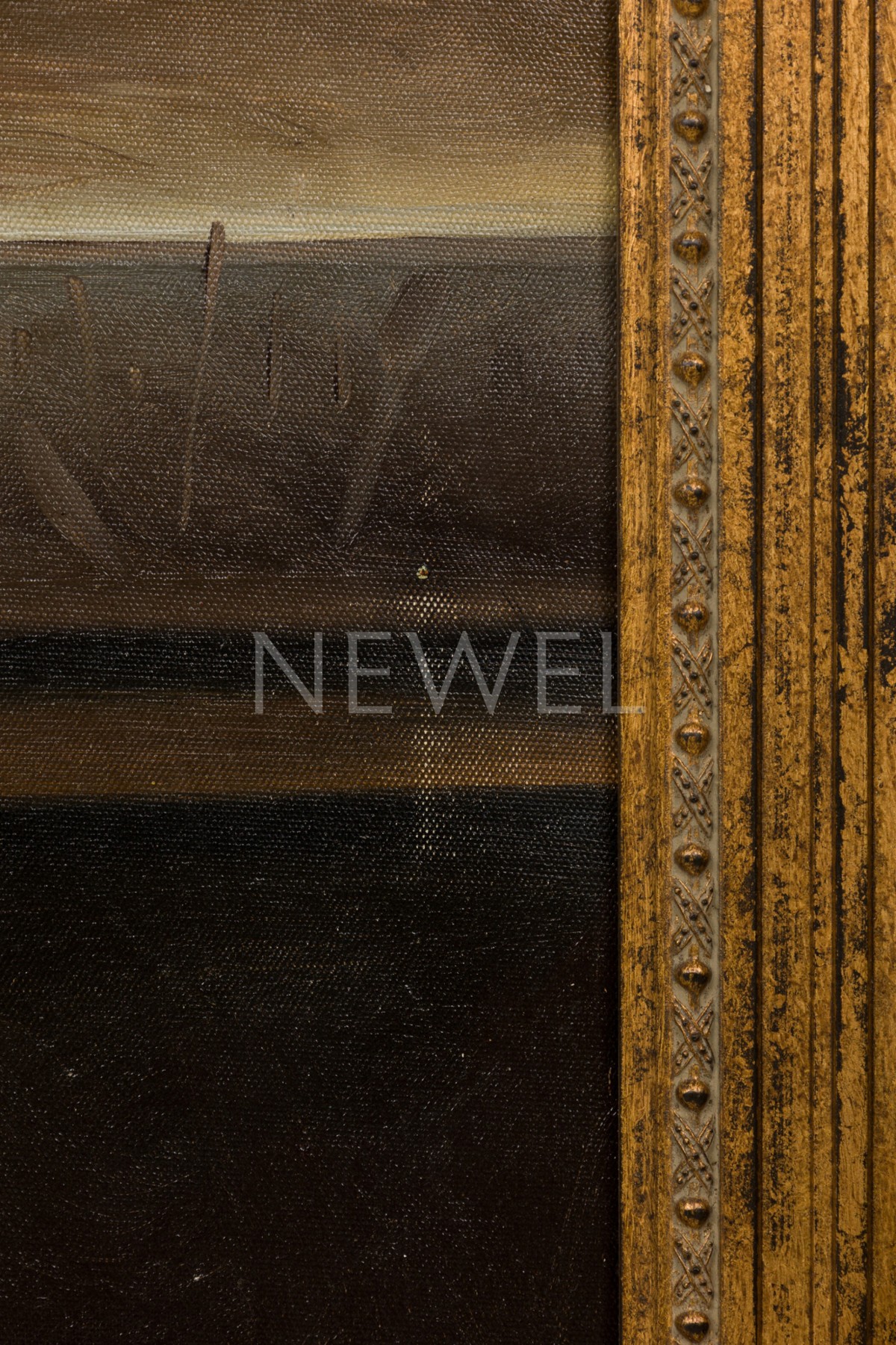 Mid-Century Dutch-style still life centerpiece of cascading fruit with adjacent gilt bowl resting on a table top with shadowed column behind, painted in robust oils on canvas mounted in an elaborate, high relief textured gilt wood frame.