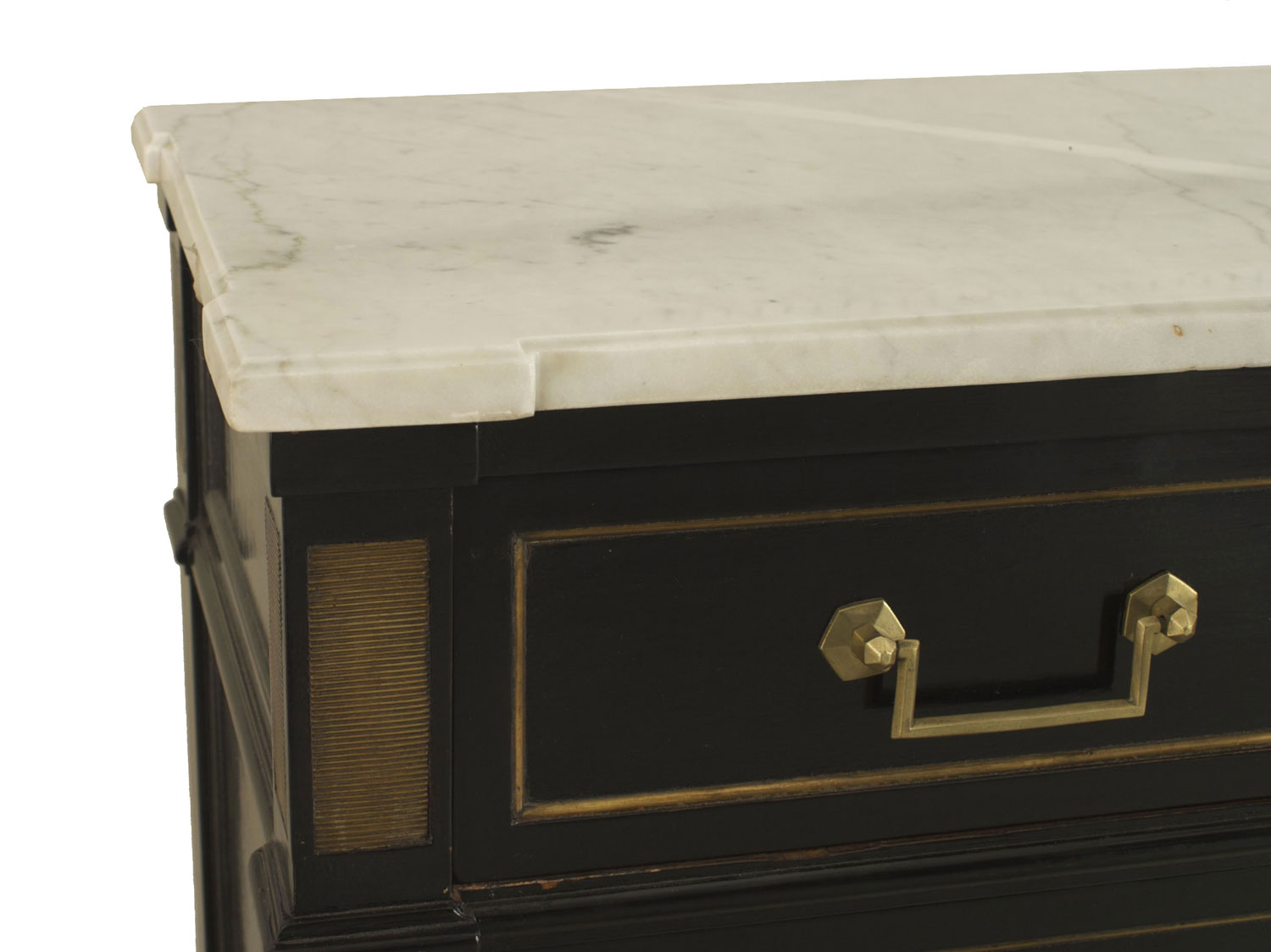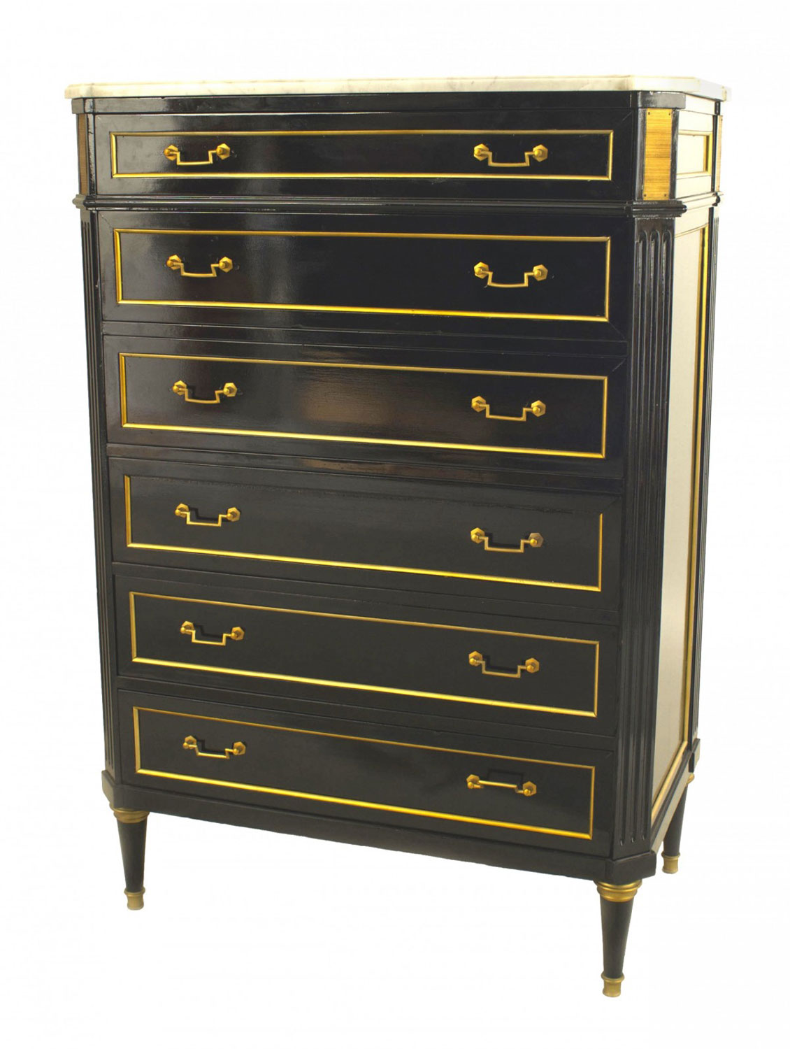 French Louis XVI-style (1940s) ebonized & bronze trim abbatant form desk with a drop front interior above 3 drawers and below a single drawer & a white marble top. (stamped: JANSEN)