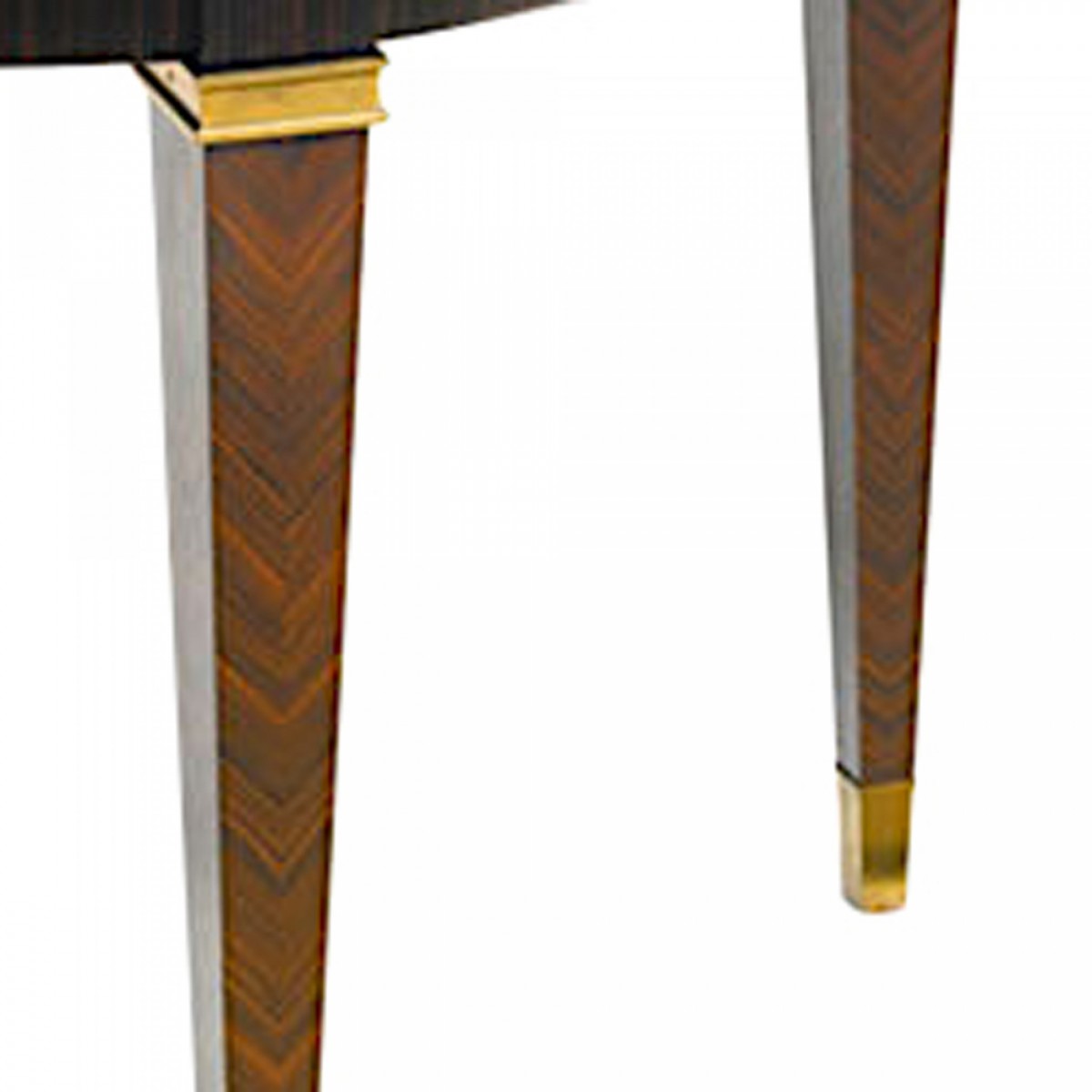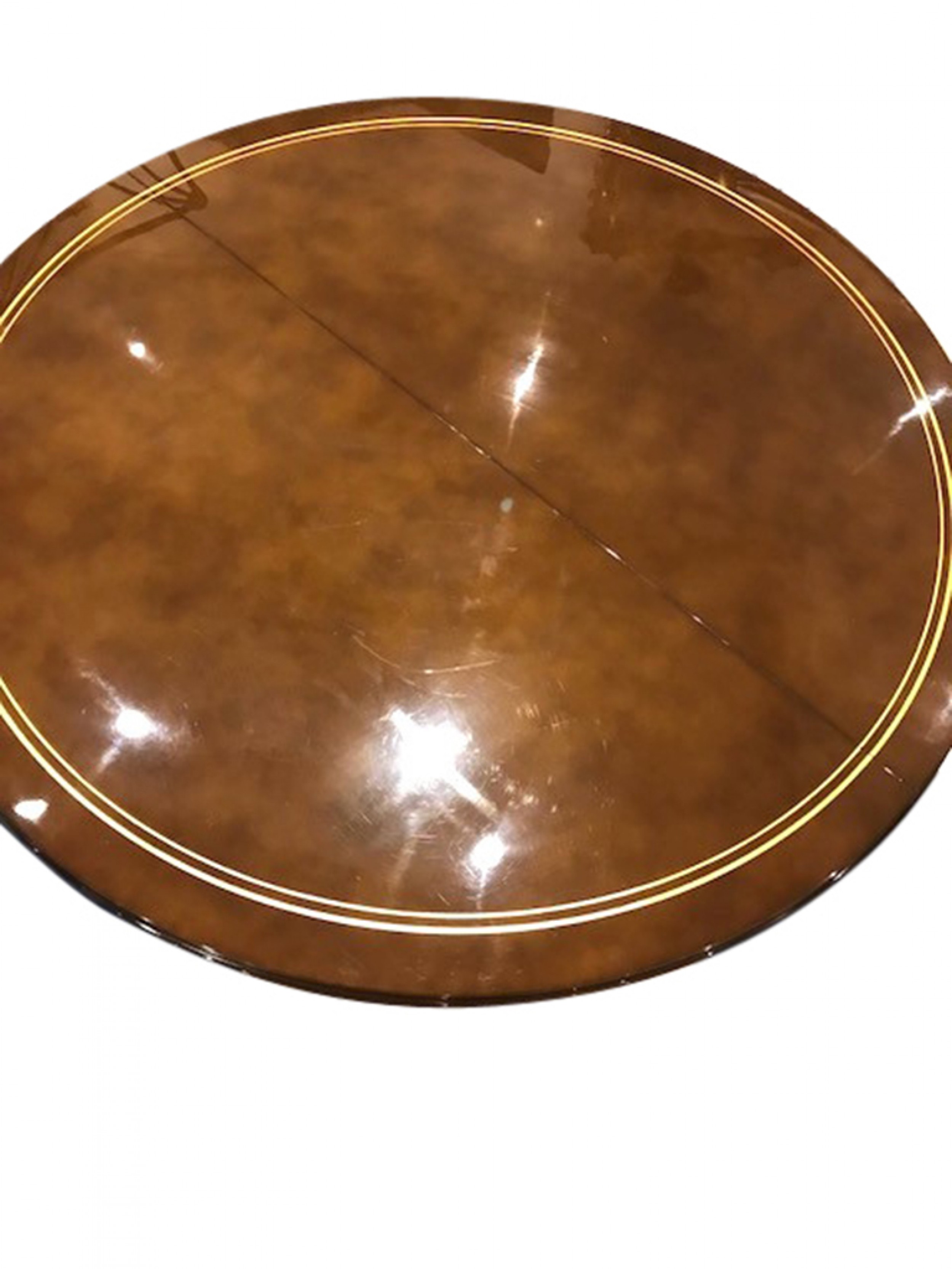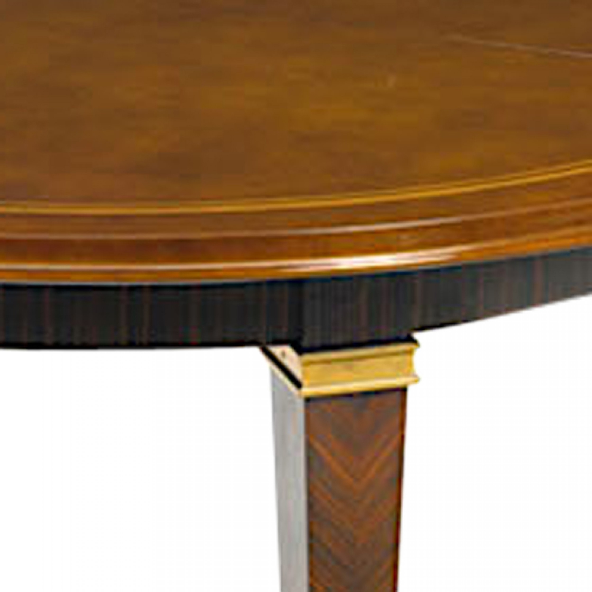 French Art Deco (1930s) round dining table with a brown lacquered top (by Atelier Sain et Tambuté, Paris) over 4 tapered Macassar wood legs with bronze trim (by DOMINIQUE)