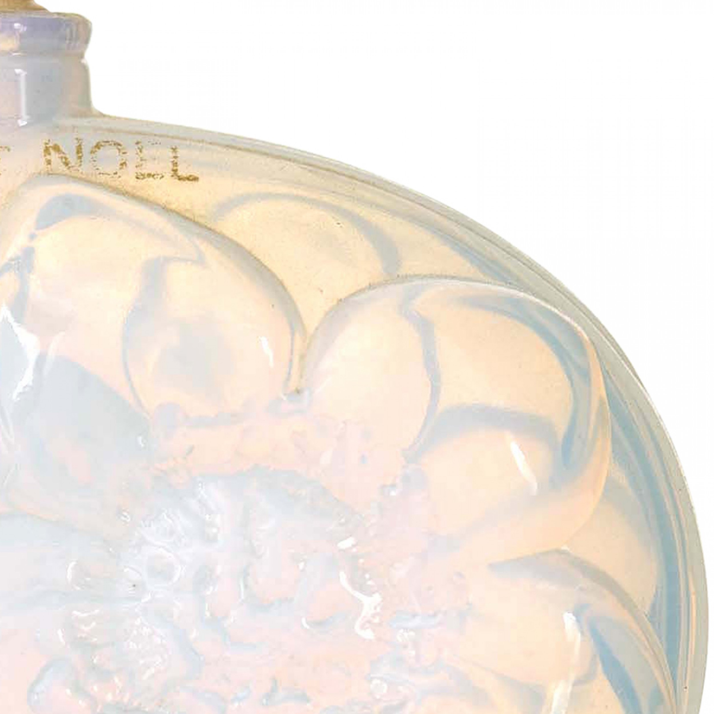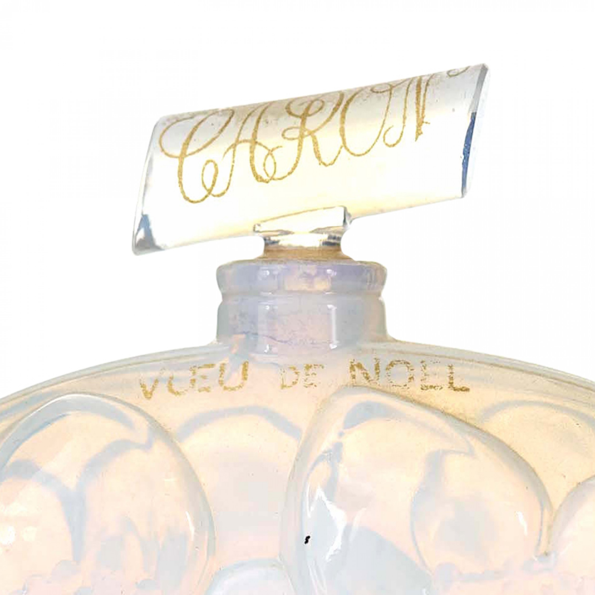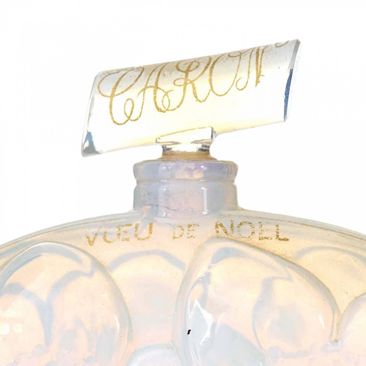 French Art Deco oval opalescent glass bottle with embossed flowers, perfume name "Vœu de Noël" written in gold, and a cylindrical stopper with brand name "CARON"