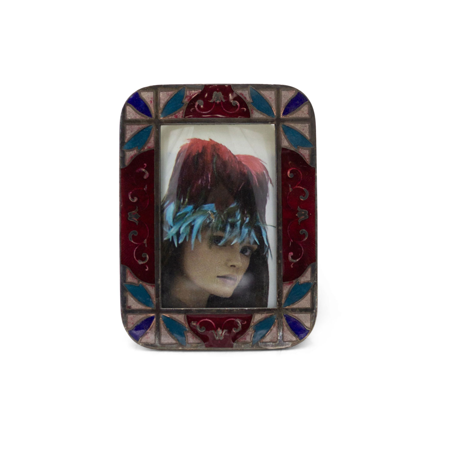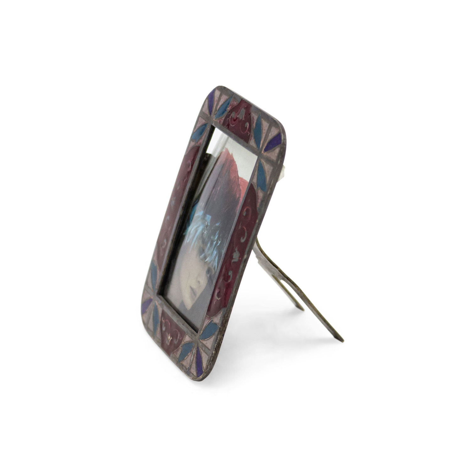 French Art Deco small silver plate and easel picture frame with red, blue and turquoise enamel trim.