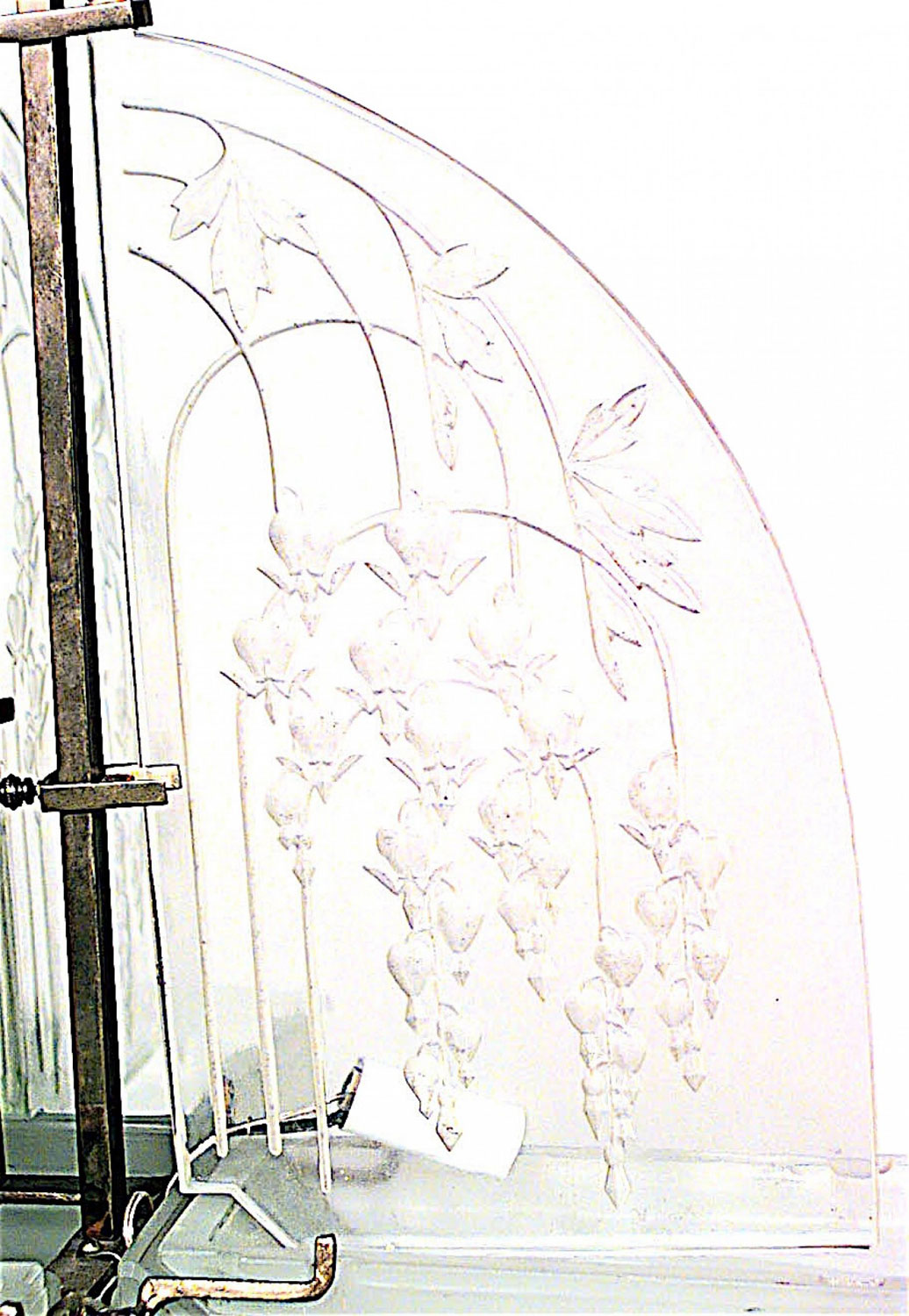 French Art Deco frosted glass 4 corner chandelier with etched floral design panels. (signed: ATELIER VINCENT)