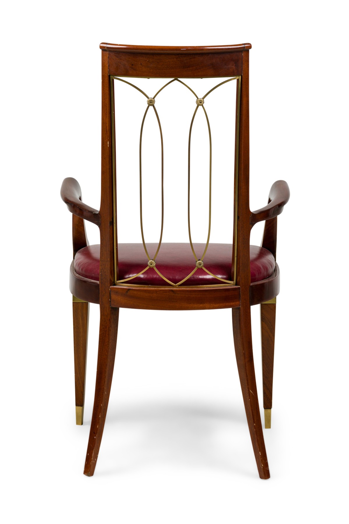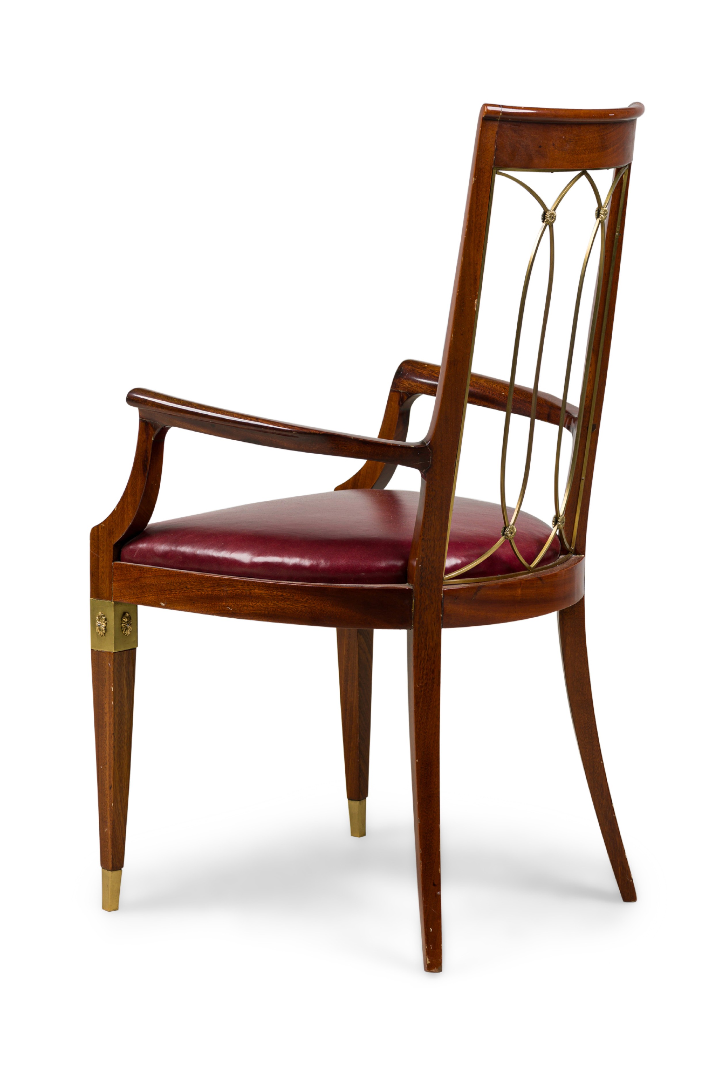 French Art-Deco mahogany brass open back armchair with a red leather seat (matching side chair: 063799B)