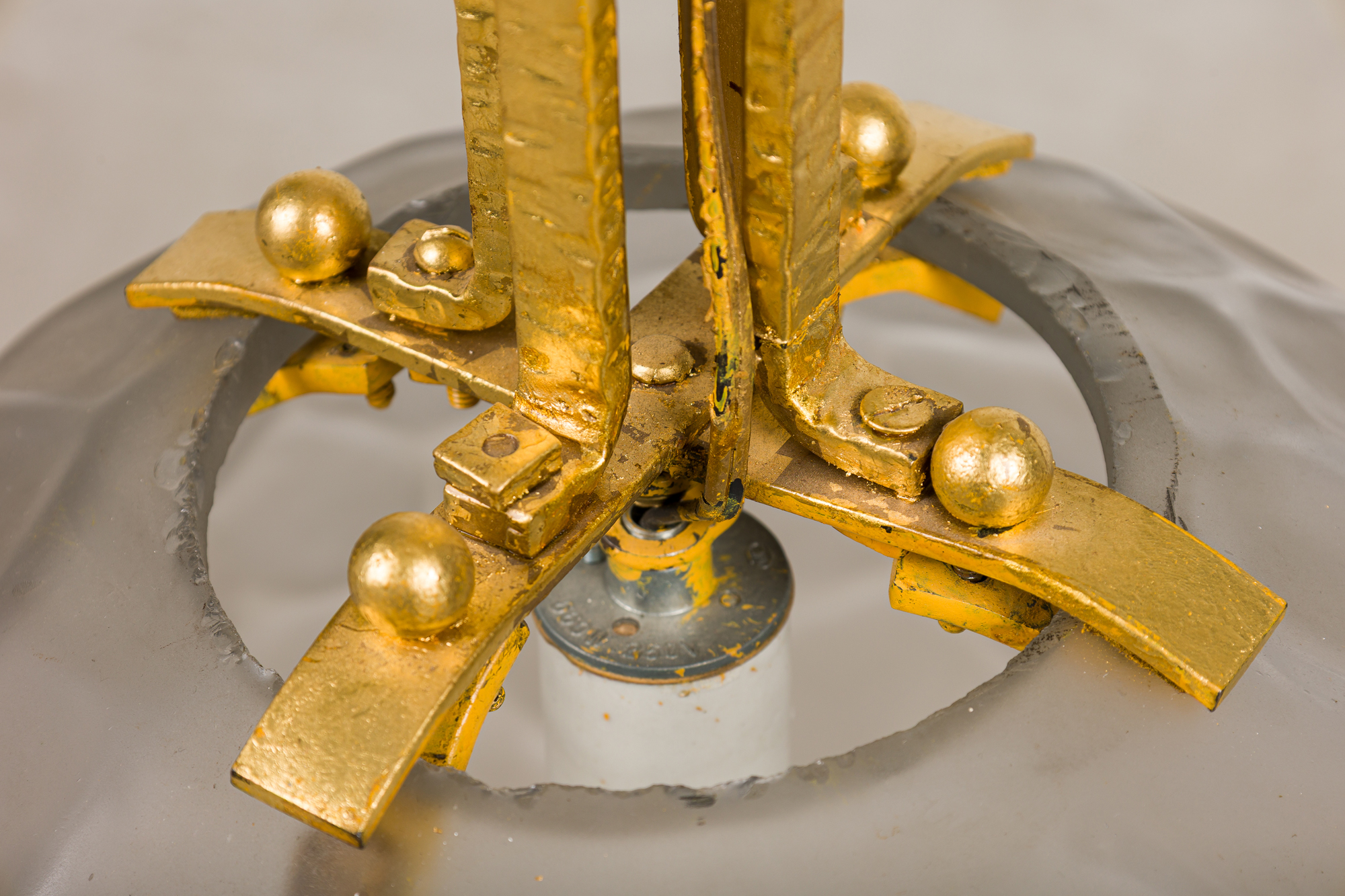 French Art Deco lantern with hand-hammered iron and gold leaf geometric swirl design supporting a faceted frosted glass ball