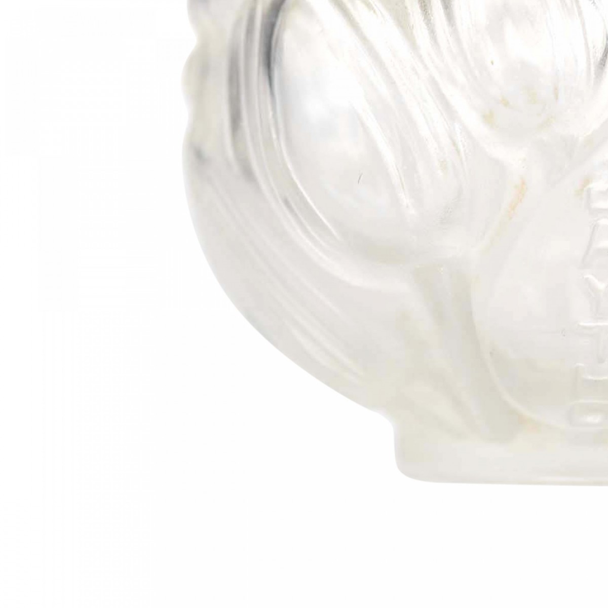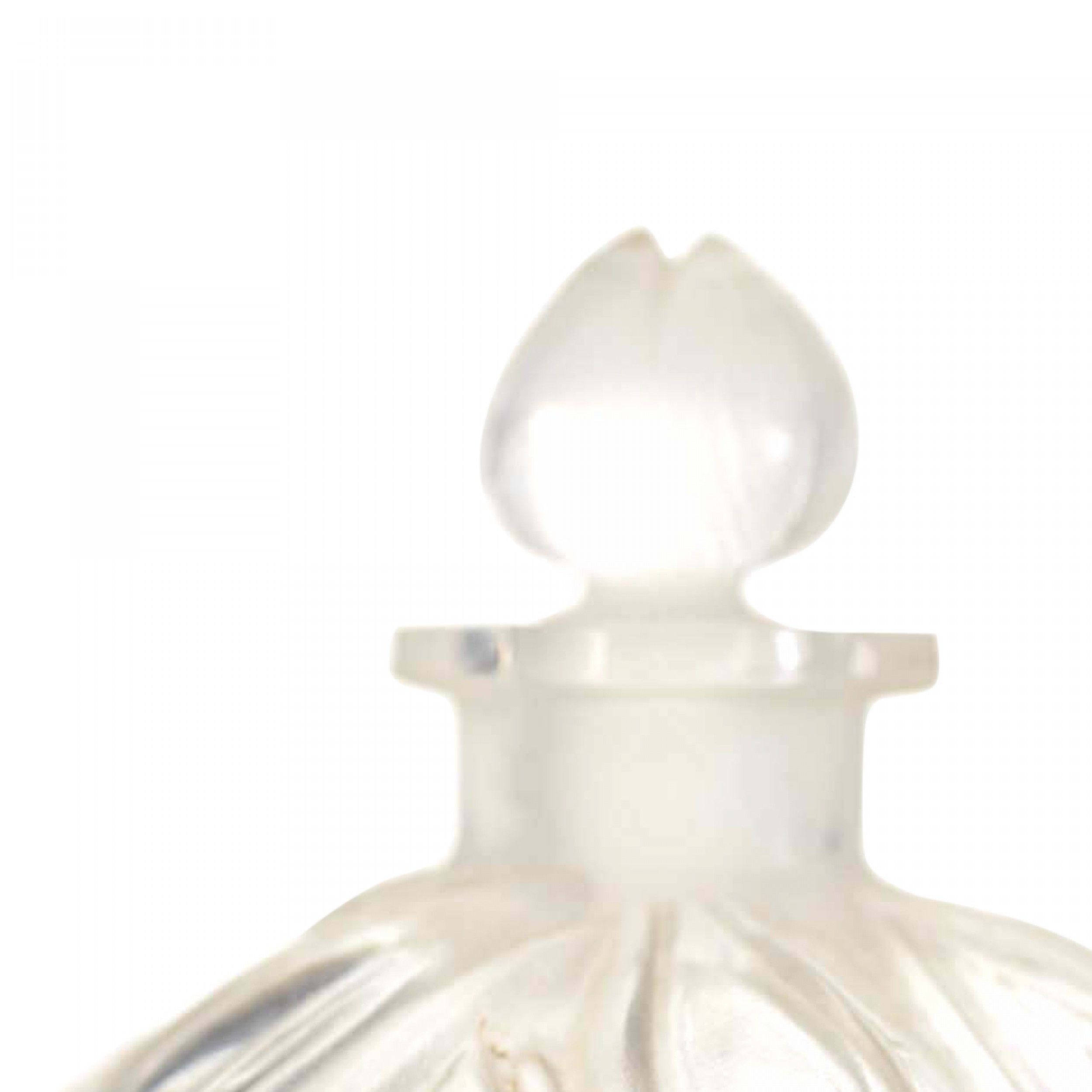 French Art Deco round frosted glass perfume bottle (PENSEES D'ELLE by JAYTHO) with molded tulips design around the exterior and a matching tulip-shaped stopper (signed LALIQUE)