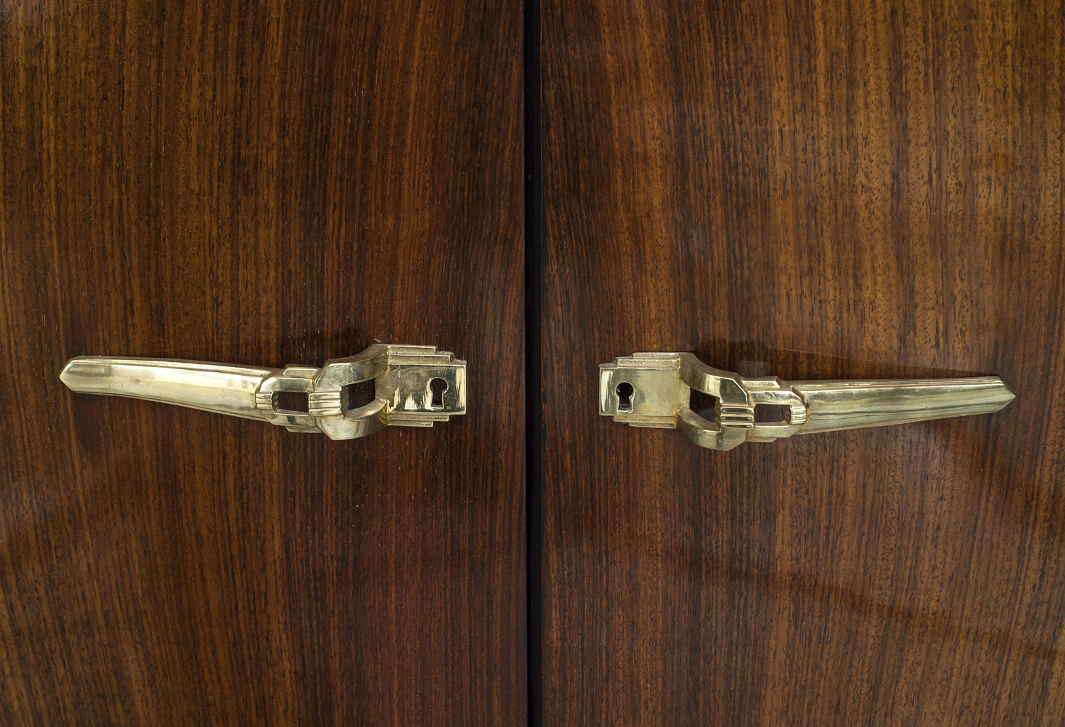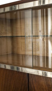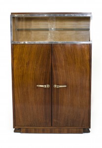 French Art Deco rosewood vitrine/bar cabinet with to glass top sliding doors framed in chrome above to large doors with brass decorative handles.