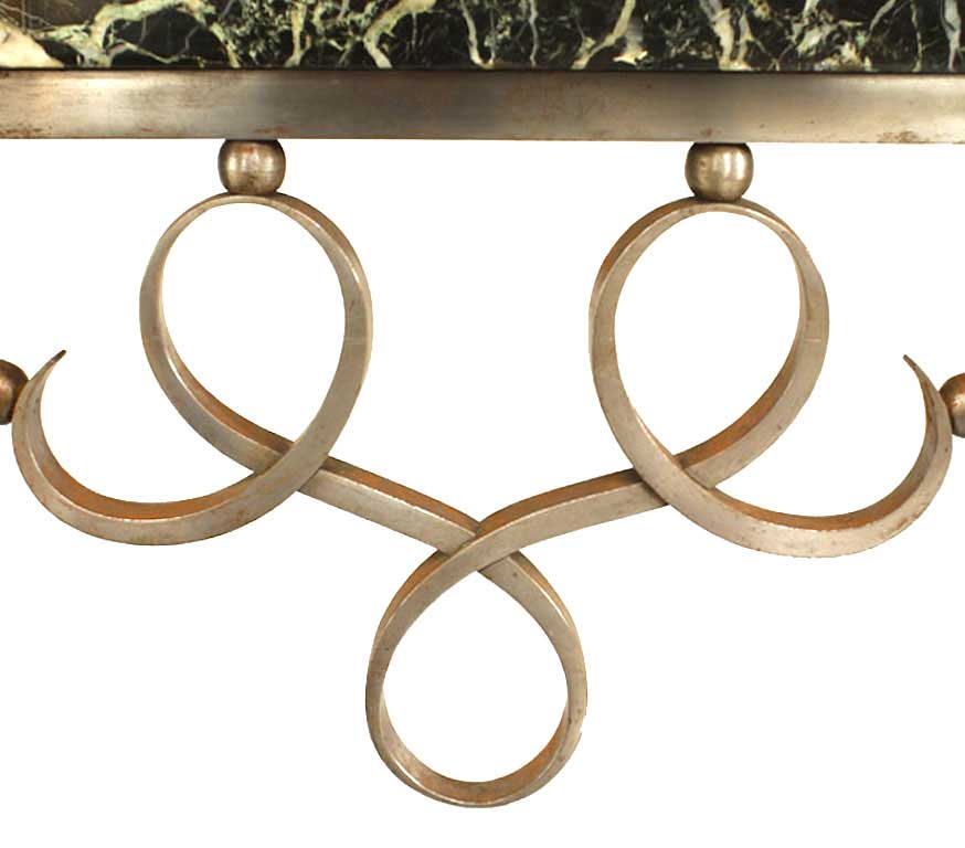 French Art Deco steel console table with a verde antico / green marble top and conforming base joined by scrolling apron & legs (Attributed to RAYMOND SUBES)