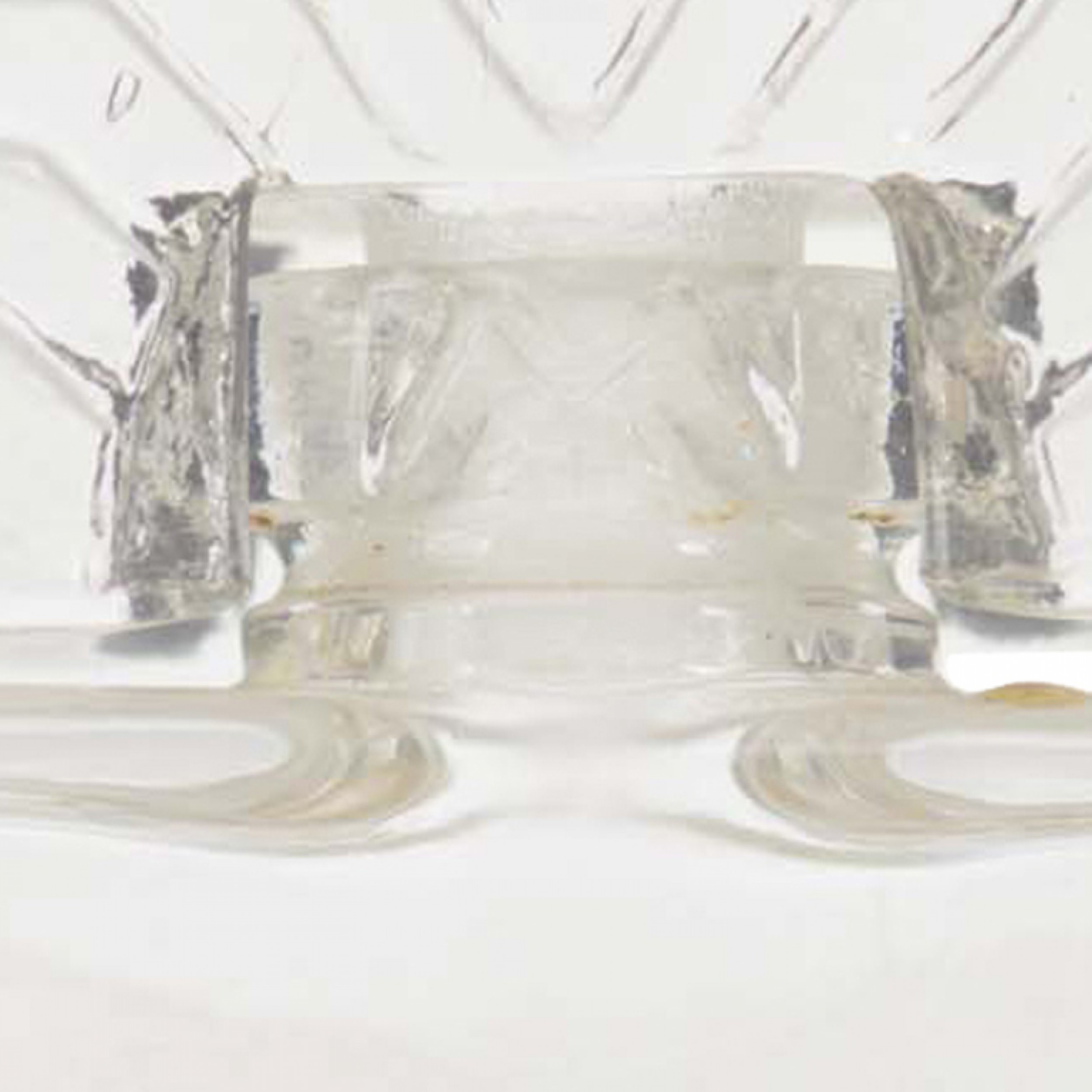 French Art Deco concave trapezoid-shaped glass perfume bottle with an geometric stylized eagle-shaped stopper