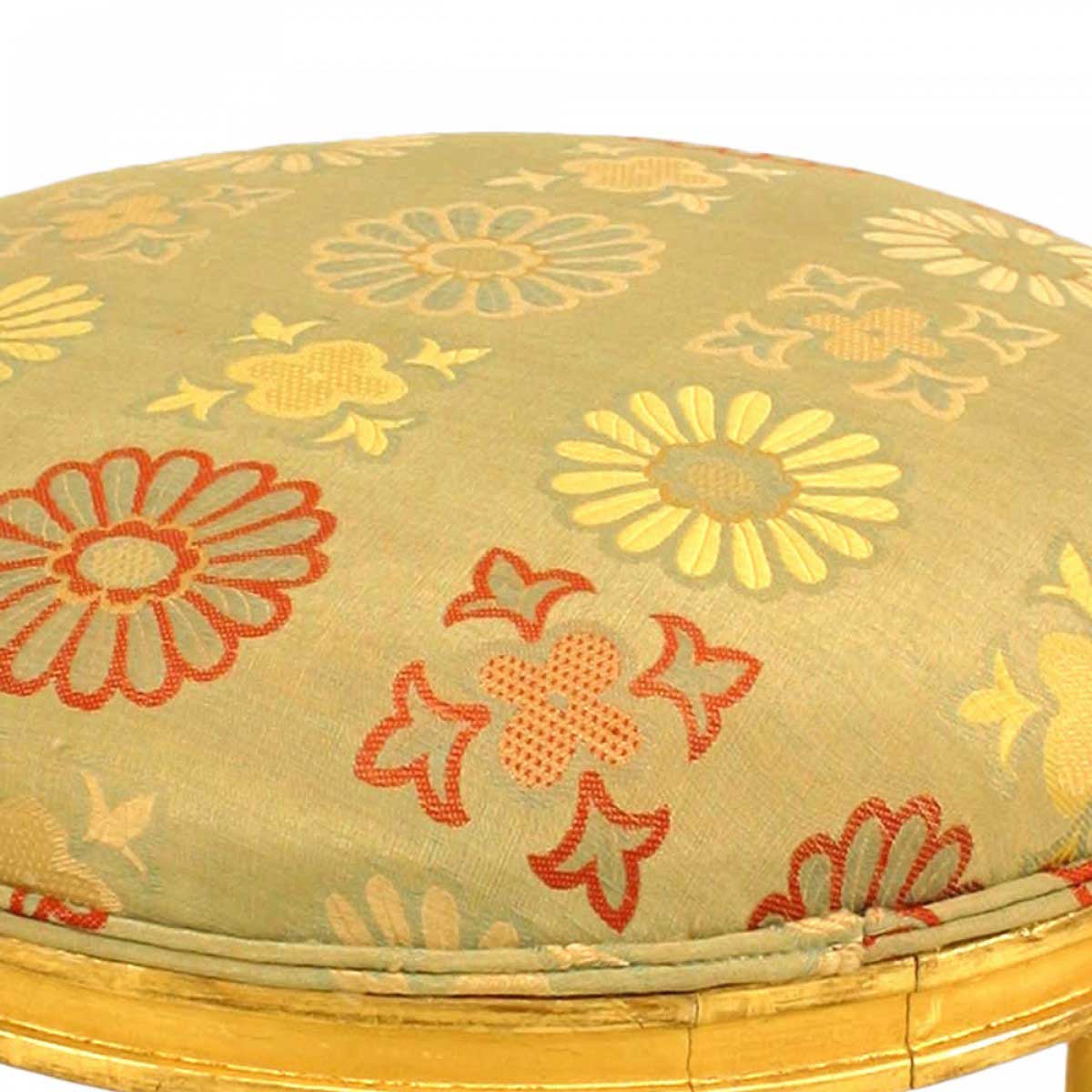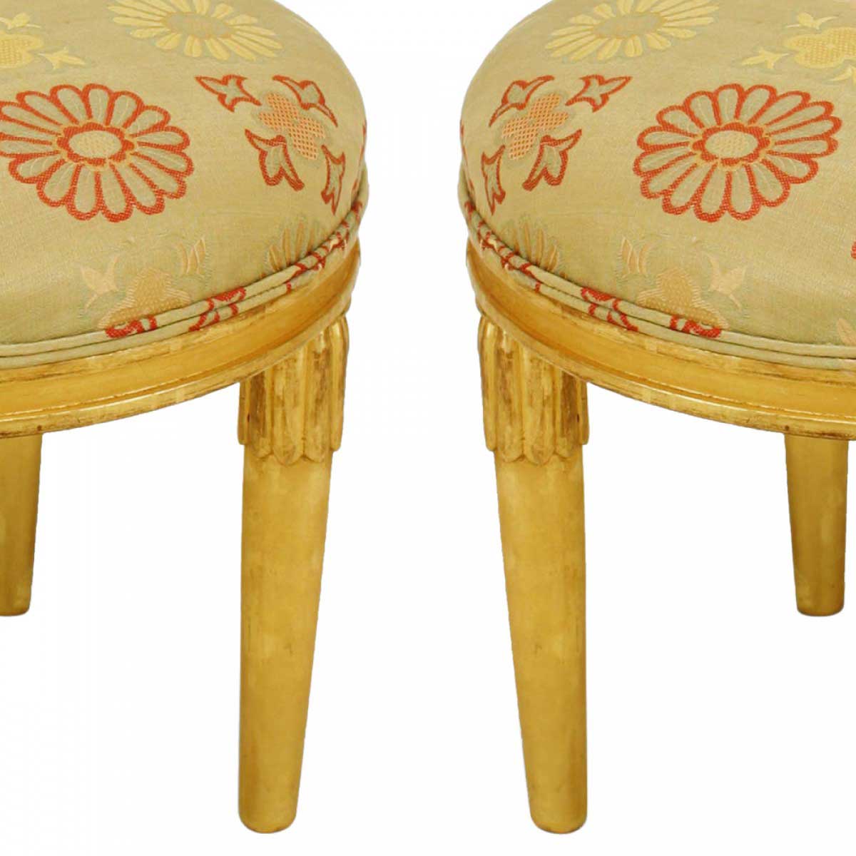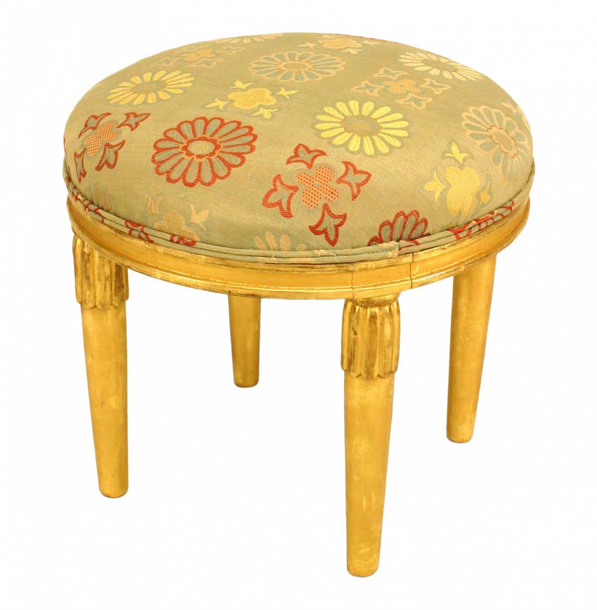 2 French Art Deco gilt round low stool with 4 round tapered legs having a stylized fluted top and upholstered seat (PRICED EACH)